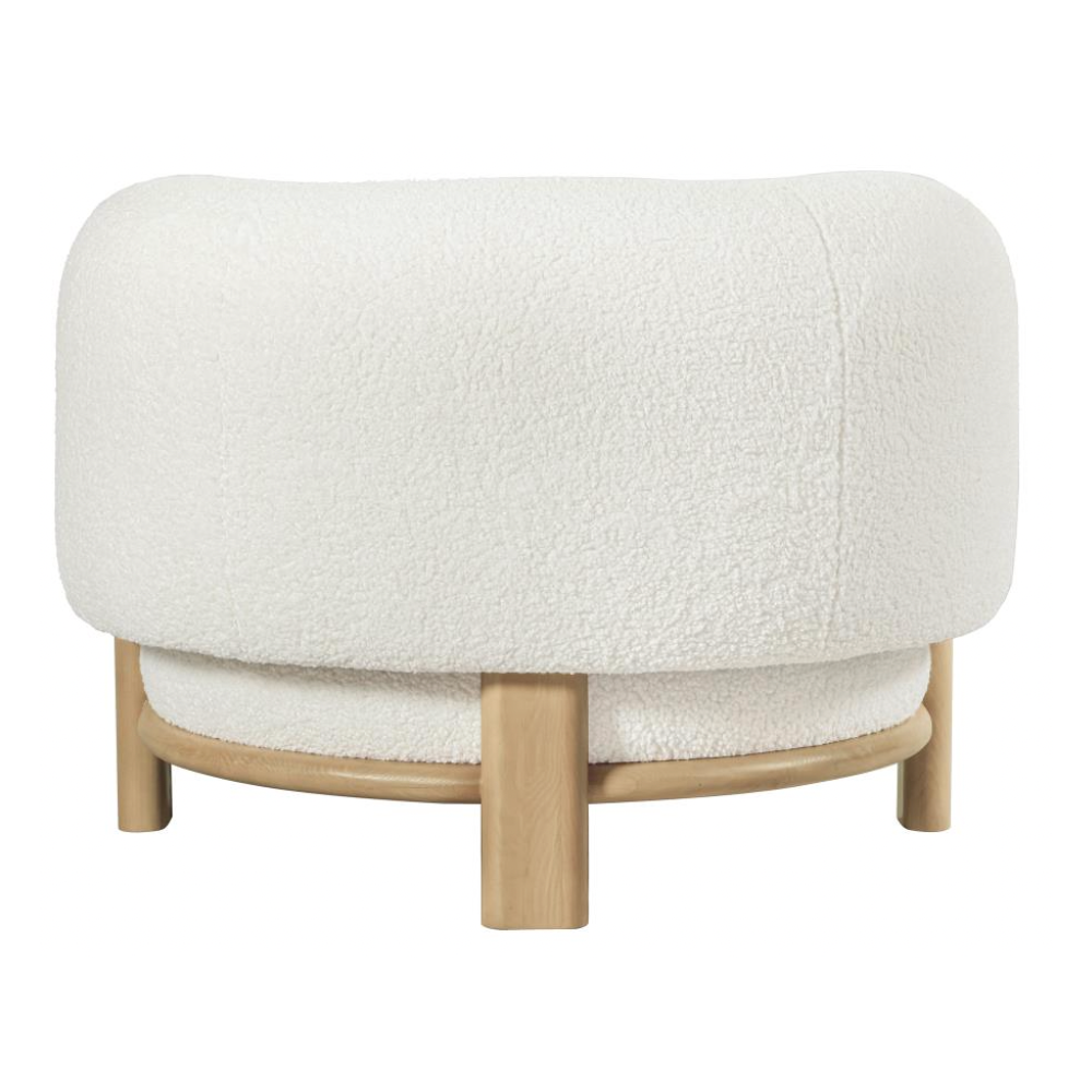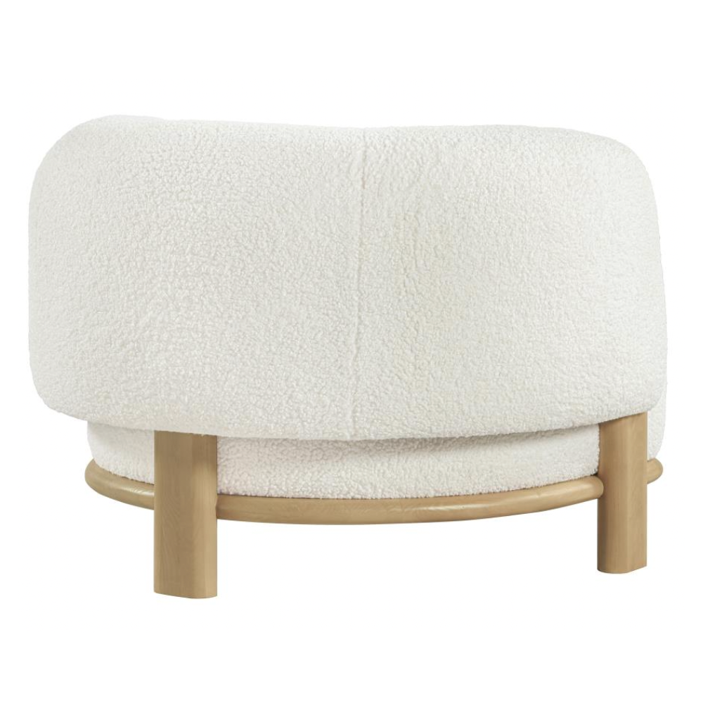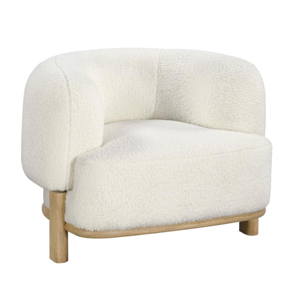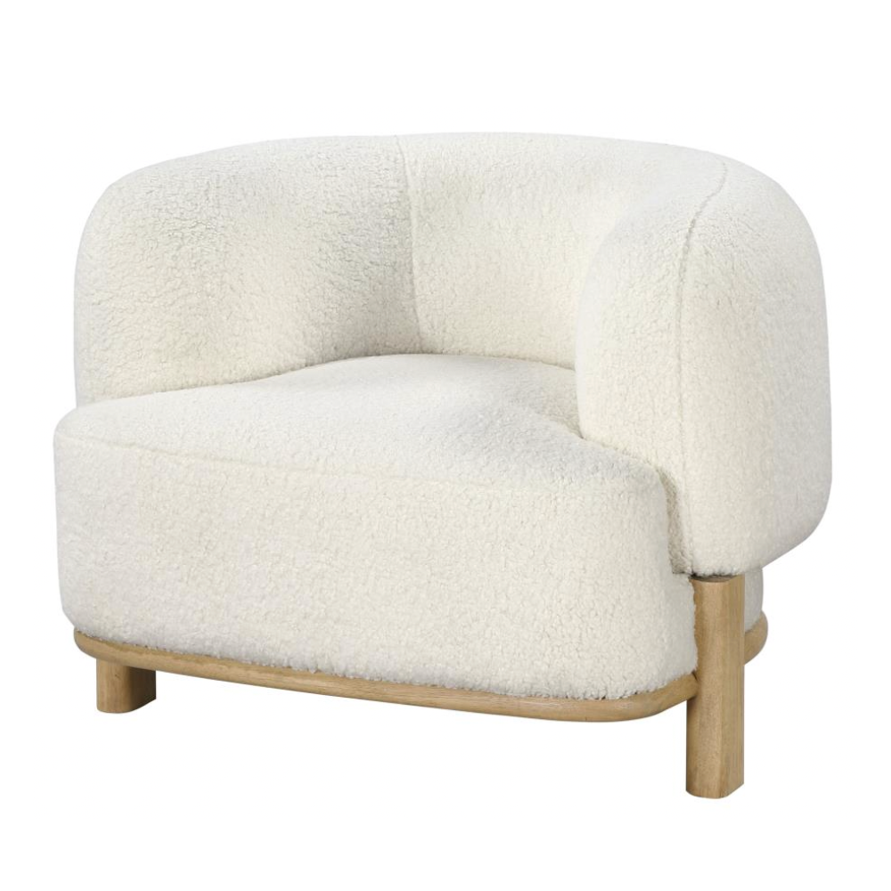 Enhance your living space with the sophisticated charm of this modern accent chair. Featuring a classic barrel-back silhouette, it combines bold, enduring lines with a plush, welcoming aesthetic. The heavily textured upholstery in a neutral tone effortlessly complements your existing decor while adding visual intrigue. A sturdy wood frame, accented with exposed oak-finished details, brings a natural, calming element to the design. Perfect for relaxing or entertaining, this chair pairs beautifully with colorful accents for a touch of personality.