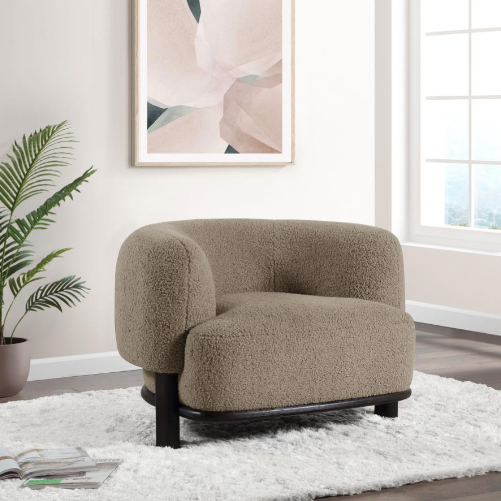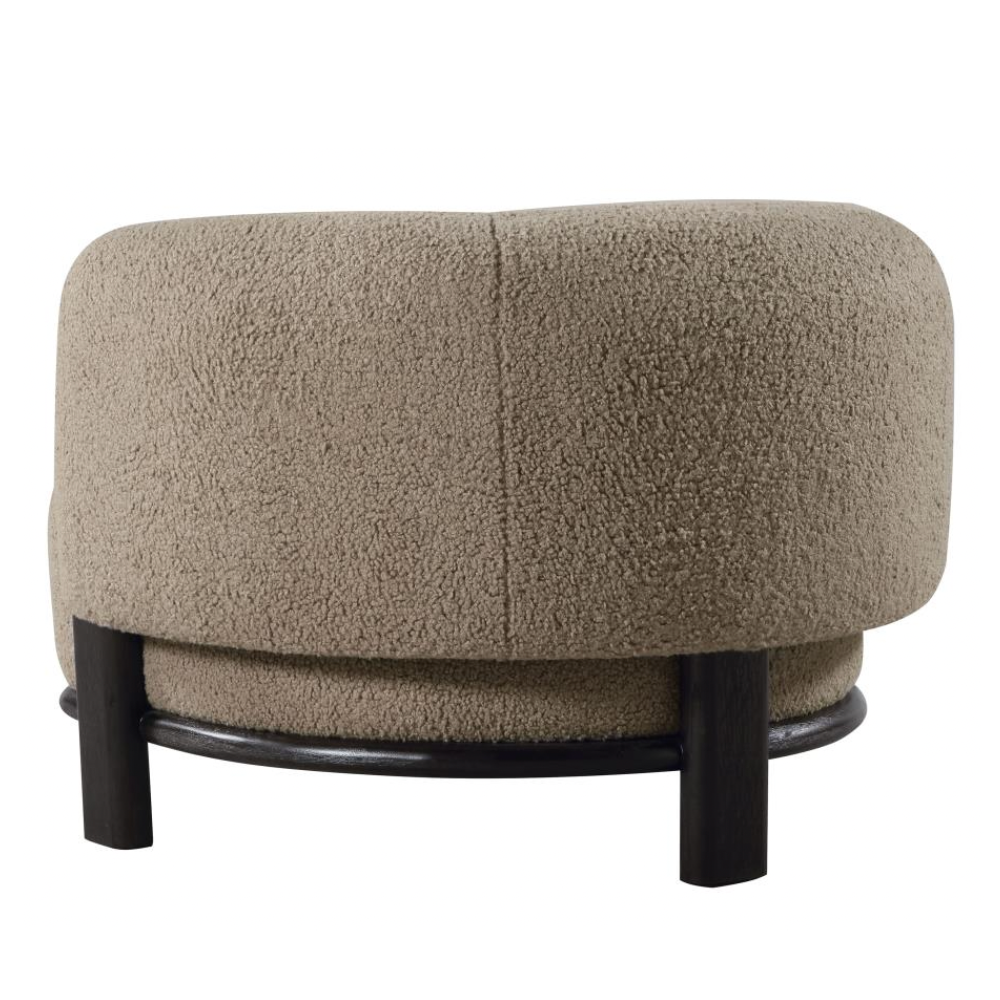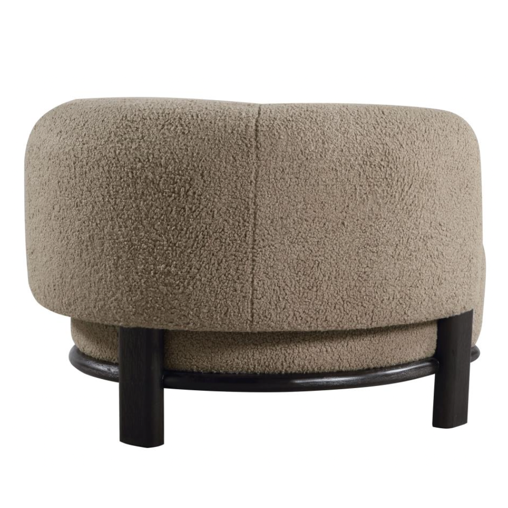 Enhance your living space with the sophisticated charm of this modern accent chair. Featuring a classic barrel-back silhouette, it combines bold, enduring lines with a plush, welcoming aesthetic. The heavily textured upholstery in a neutral tone effortlessly complements your existing decor while adding visual intrigue. A sturdy wood frame, accented with exposed oak-finished details, brings a natural, calming element to the design. Perfect for relaxing or entertaining, this chair pairs beautifully with colorful accents for a touch of personality.