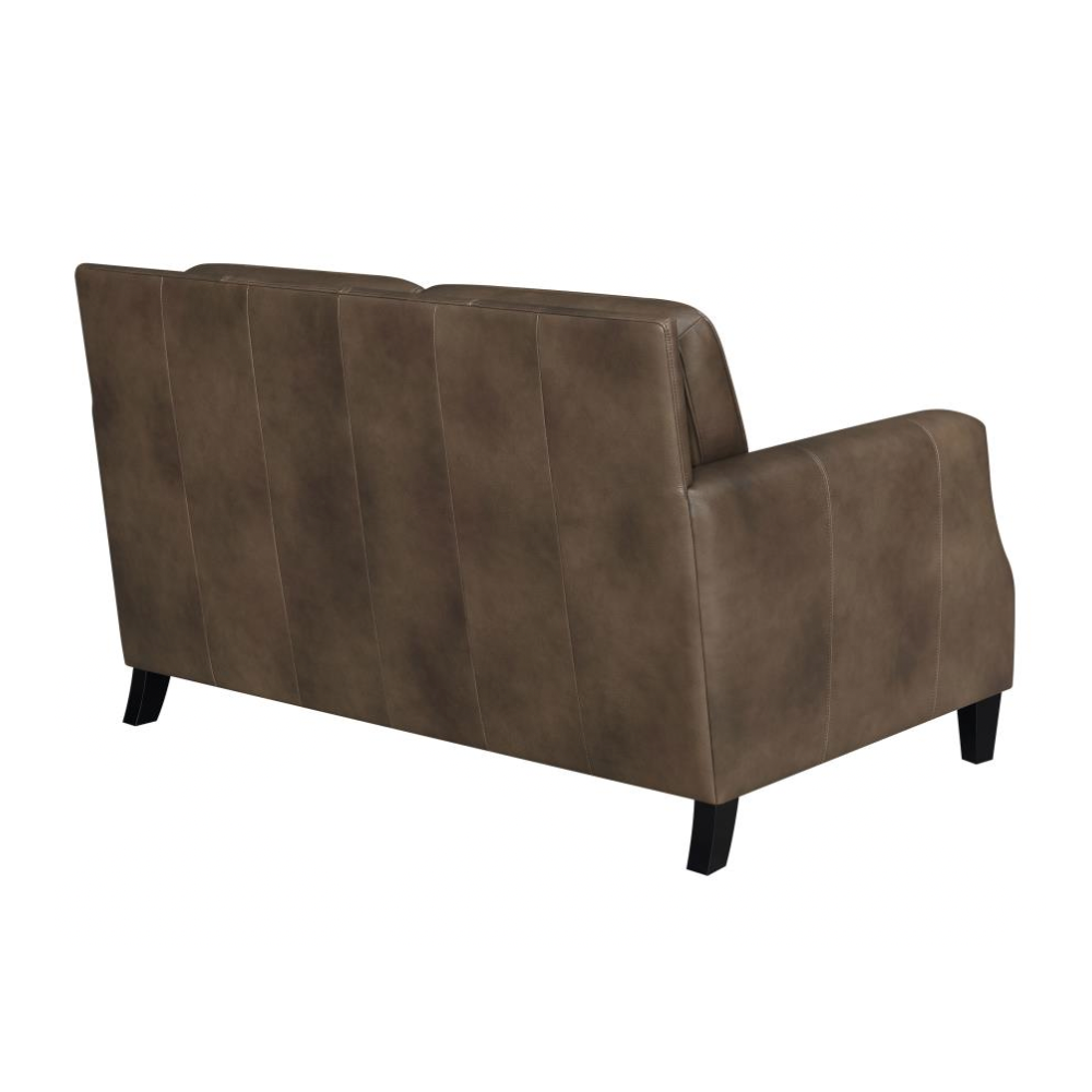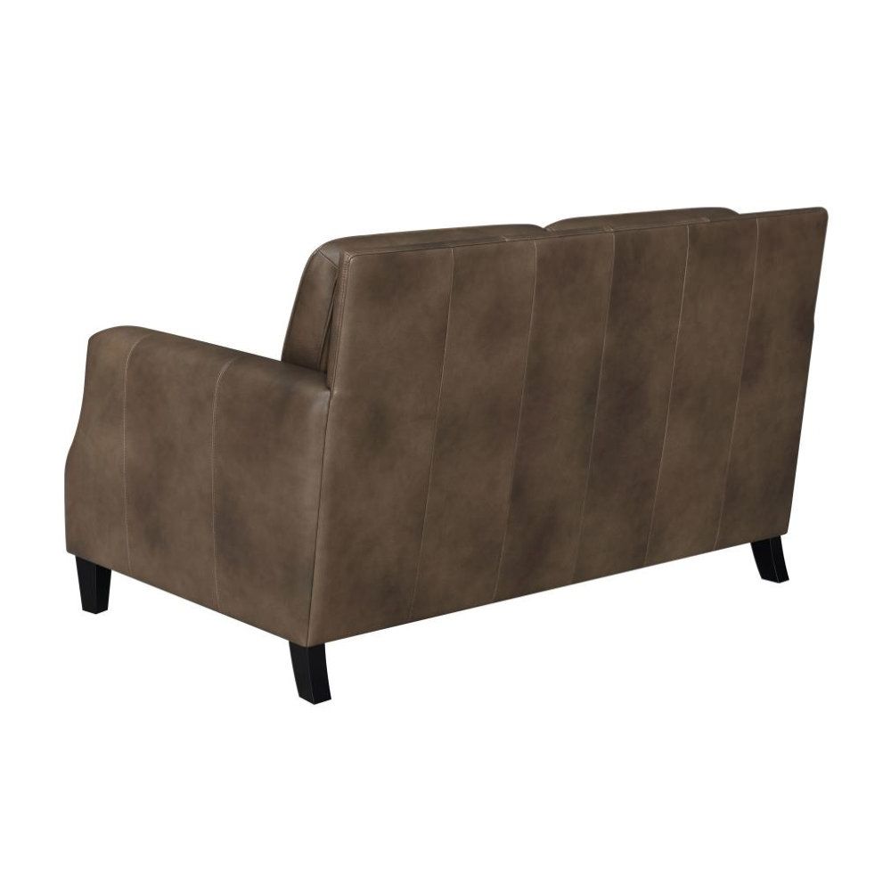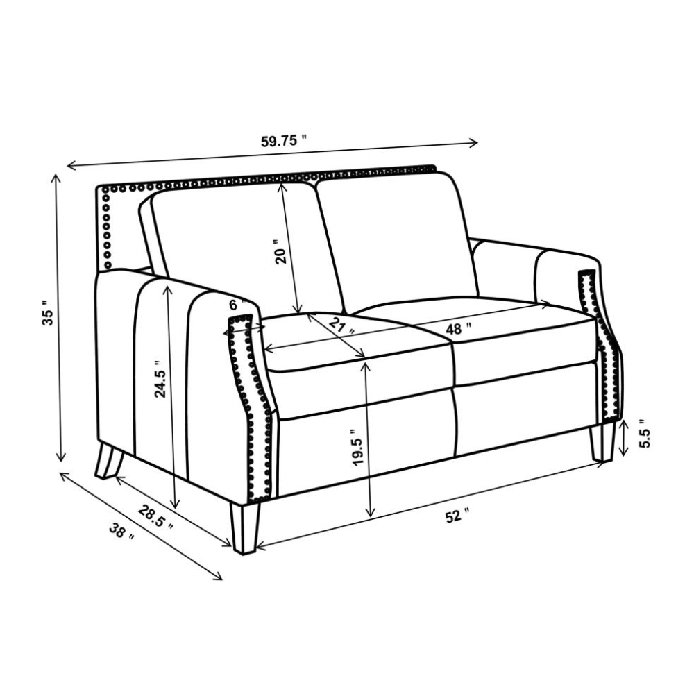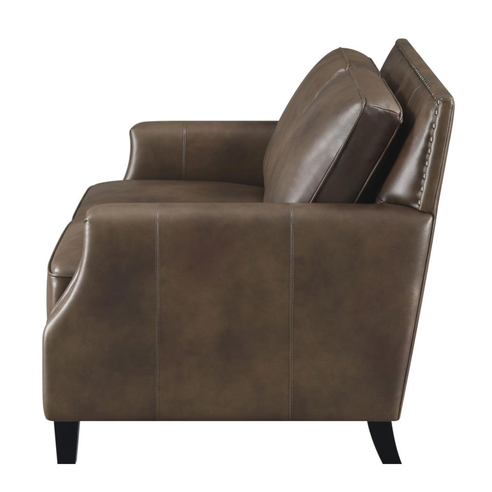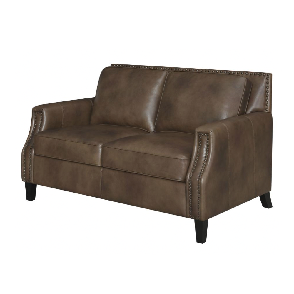 Impress your guests with the sophisticated charm of this brown sugar loveseat. Upholstered in soft leather grain fabric, this loveseat exudes elegance while offering exceptional comfort. The welted trim on the back cushions and modern recessed arms with nailhead detailing elevate its stylish appeal. Supported by tapered espresso legs, this piece combines durability with a refined design, making it a standout addition to your living area.
