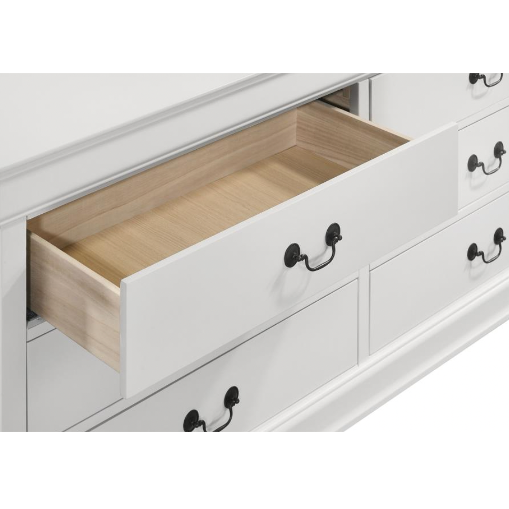 Create a tranquil bedroom haven with this five-piece transitional bedroom set. Showcasing a cool white finish, this set exudes versatility and elegance, featuring molded trim and contrasting dark finish hanging pulls for a refined touch. The bed anchors the set with its tall panel-style headboard and low footboard, delivering an airy, open silhouette that complements a range of interiors. Complete with a six-drawer dresser and mirror, five-drawer chest, and two-drawer nightstand, the set offers ample storage while maintaining a clean, understated aesthetic. Bracket feet add a hint of sophistication and dimension to each piece.