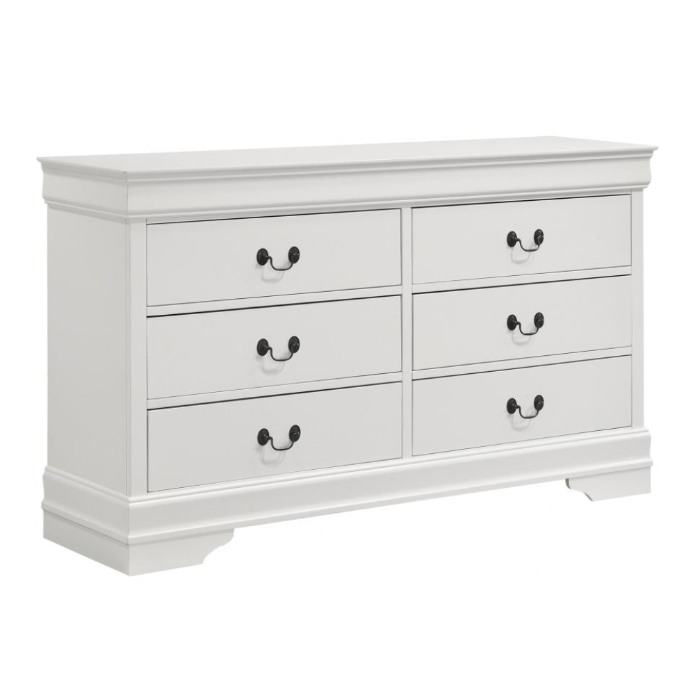 Create a serene and inviting bedroom retreat with this five-piece transitional bedroom set. Featuring a bed, six-drawer dresser with mirror, five-drawer chest, and two-drawer nightstand, this set offers a harmonious blend of style and function. The bed showcases a panel-style headboard and low footboard with curvy accents, lending an airy, open feel to the space. Each storage piece boasts molded trim, dark finish hanging pulls, and bracket feet, adding dimension and charm. Finished in a cool white tone, this set blends seamlessly with modern and transitional decor.