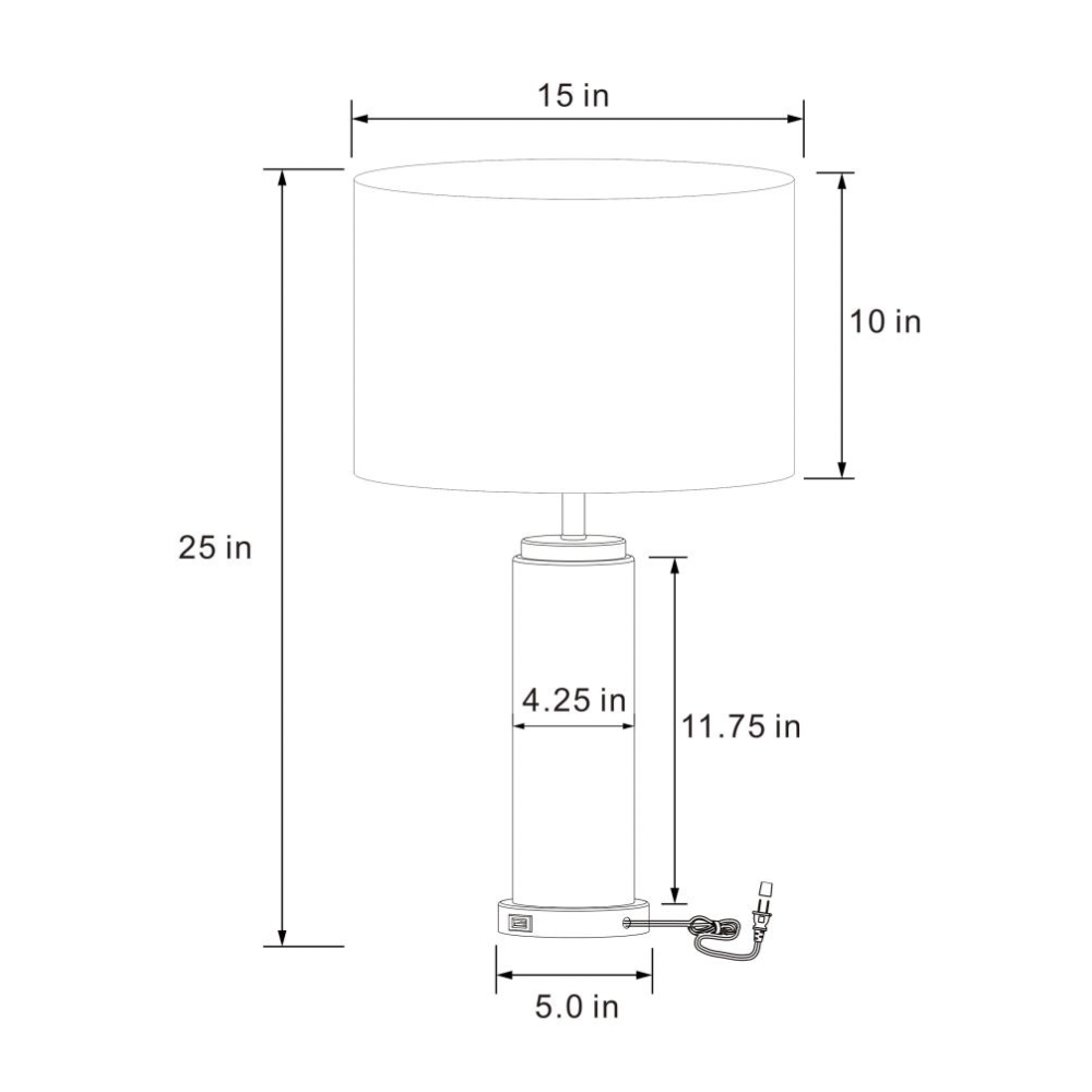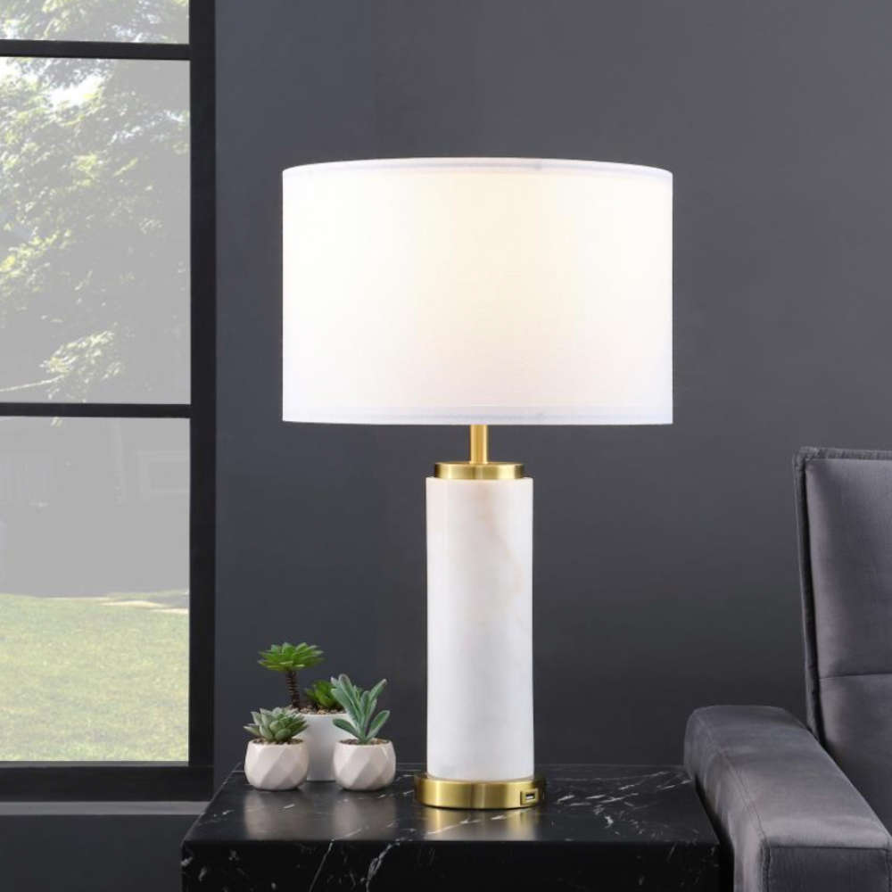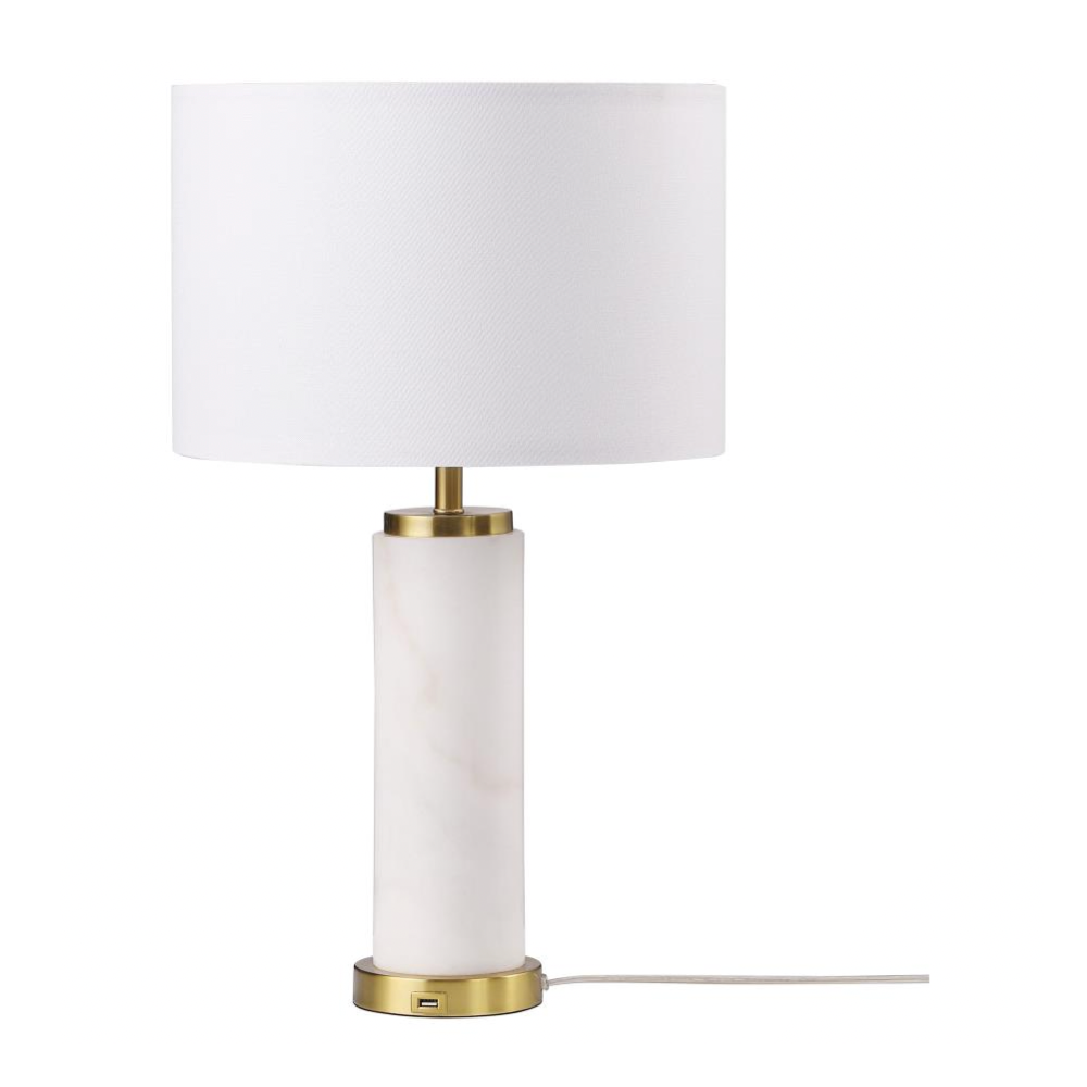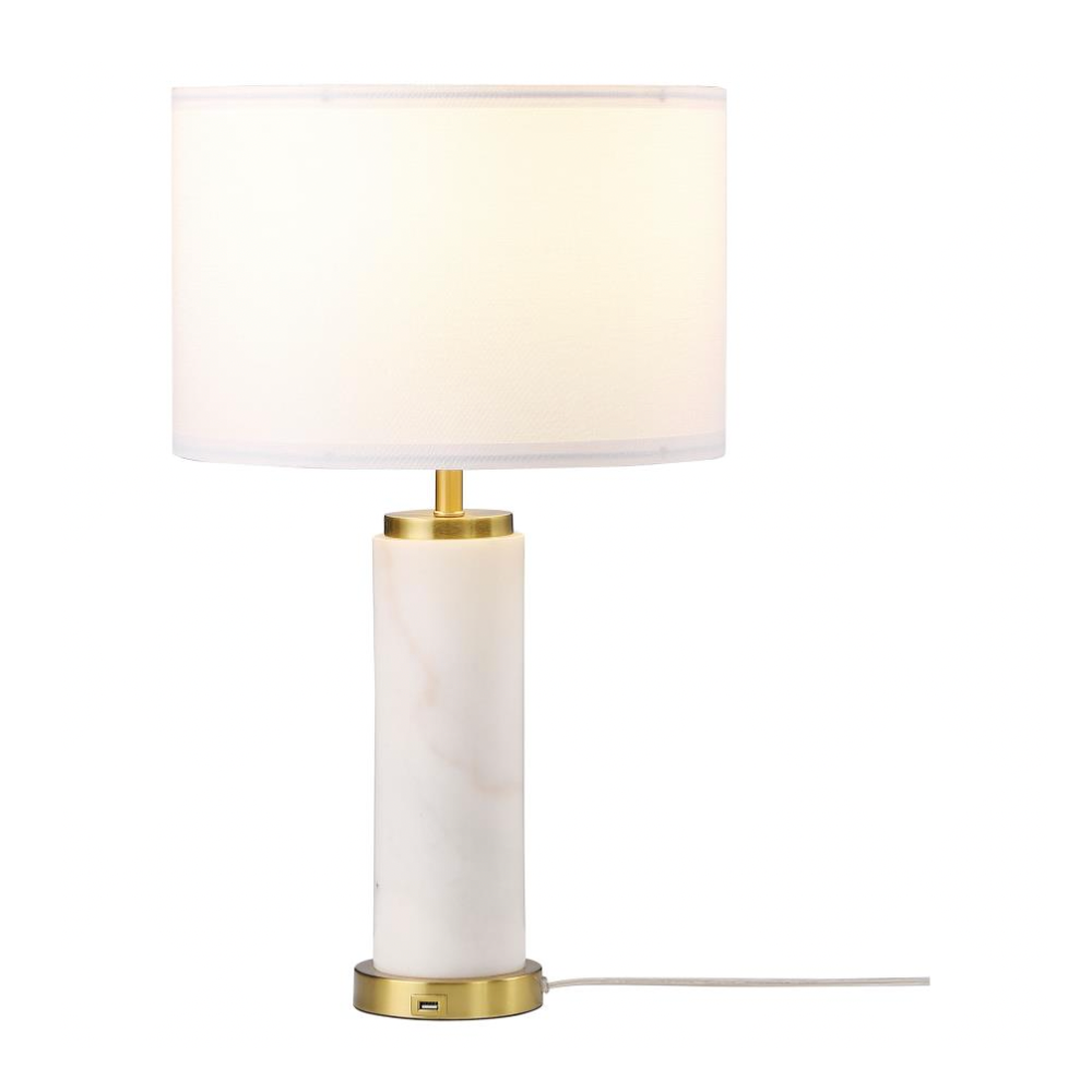 Elevate your space with this modern table lamp, where timeless elegance meets everyday convenience. Anchored by a solid white marble column, this piece radiates luxury and sophistication. Soft gold accents introduce a warm contrast, while a textured white drum shade delivers beautifully diffused illumination. An integrated USB port at the base adds modern functionality—perfect for charging your devices without sacrificing style. Ideal for bedrooms, living rooms, or offices, this lamp includes a 9W LED bulb for efficient, long-lasting lighting.