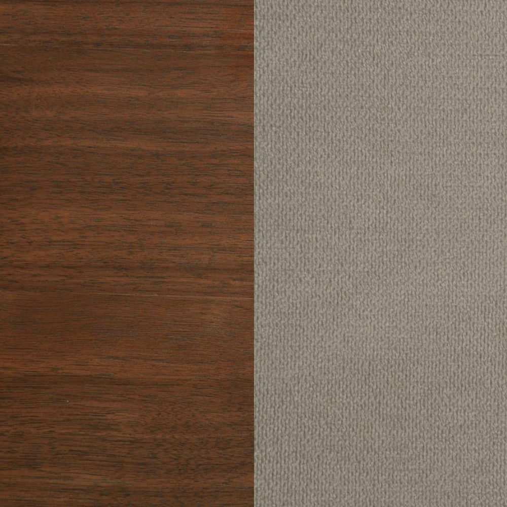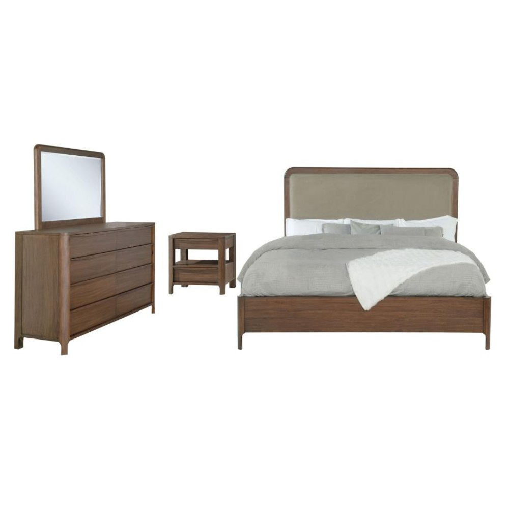 Upgrade your bedroom with the clean-lined elegance of this modern bedroom set in a warm walnut finish. The upholstered headboard features rounded corners and beige fabric for a soft, inviting touch, while included storage pieces offer generous space and thoughtful details like cedar and felt-lined drawers. Complete with a beveled glass mirror, the set blends simplicity with stylish functionality.