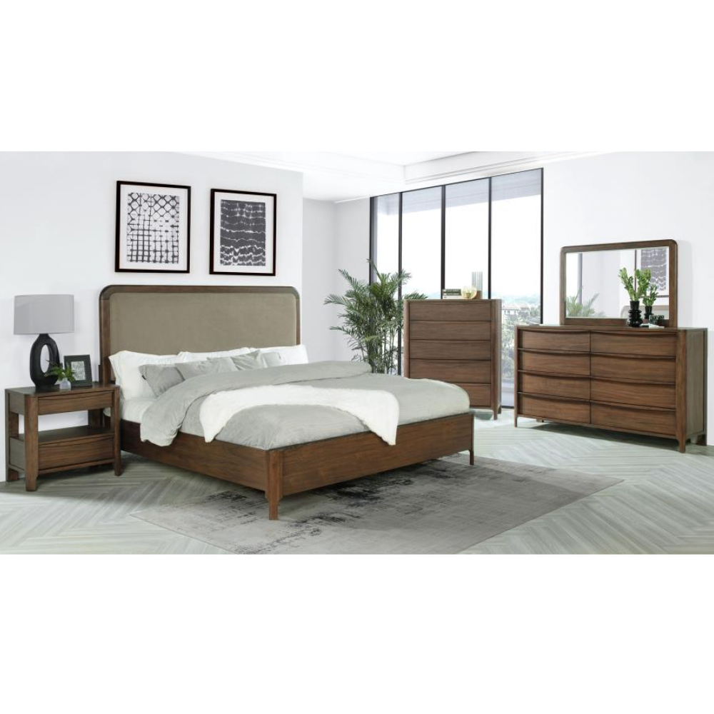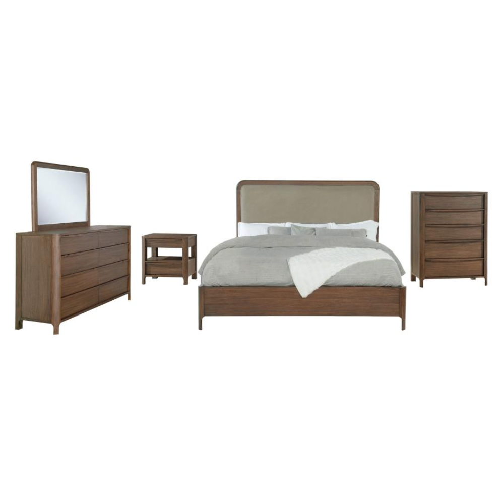 Upgrade your bedroom with the clean-lined elegance of this modern bedroom set in a warm walnut finish. The upholstered headboard features rounded corners and beige fabric for a soft, inviting touch, while included storage pieces offer generous space and thoughtful details like cedar and felt-lined drawers. Complete with a beveled glass mirror, the set blends simplicity with stylish functionality.