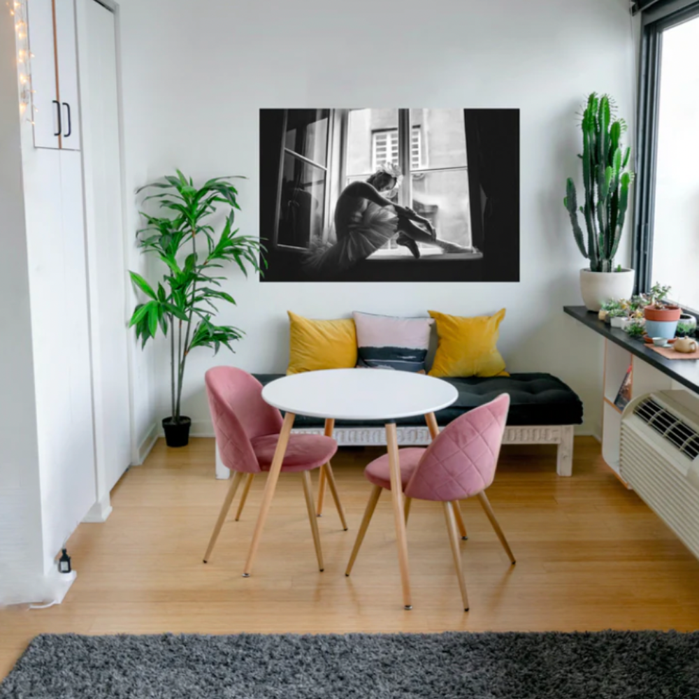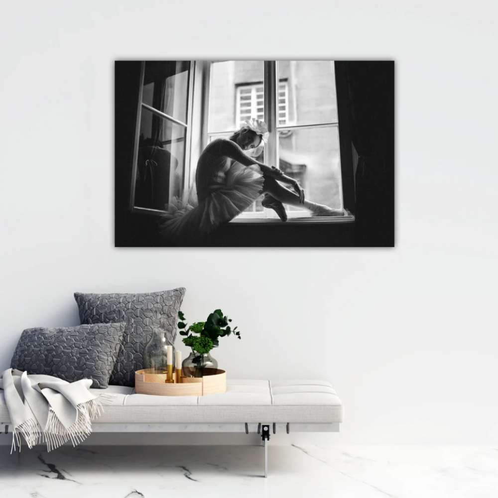 The grace of ballet meets the elegance of modern art in this frameless tempered glass wall piece. Featuring a striking black and white design, this artwork captures a beautiful ballerina in a moment of quiet intensity, with a deep, captivating stare. The tutu and delicate toe point are perfectly positioned, adding depth and realism to the piece. Ideal for a dance studio or any room where you want to create a dramatic, artistic atmosphere.