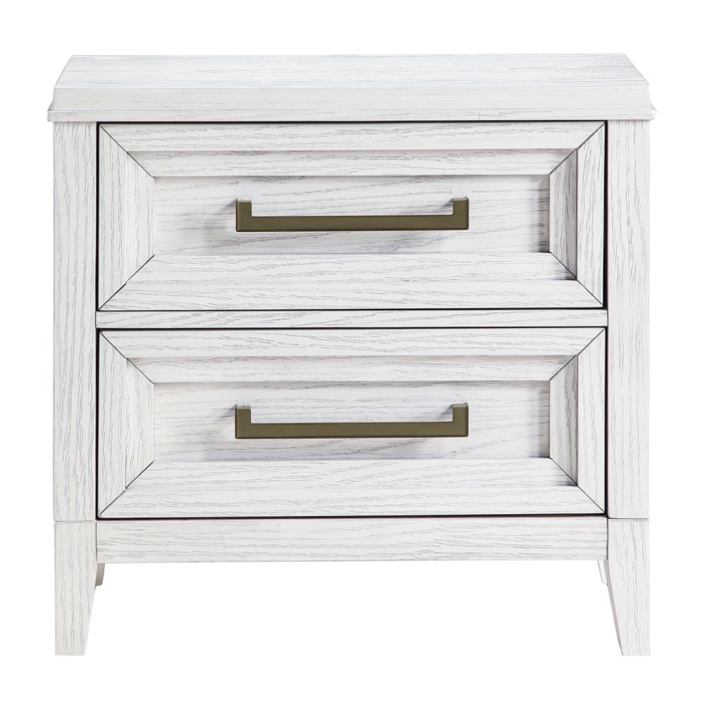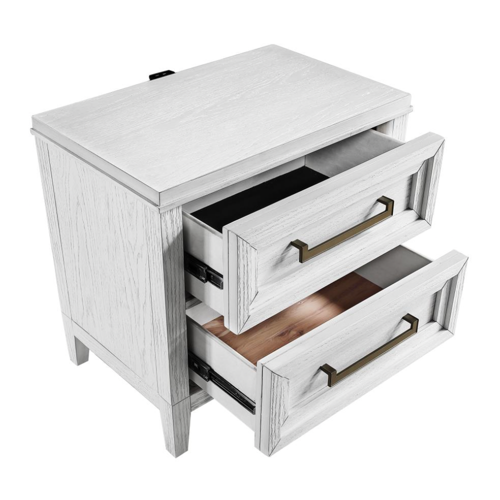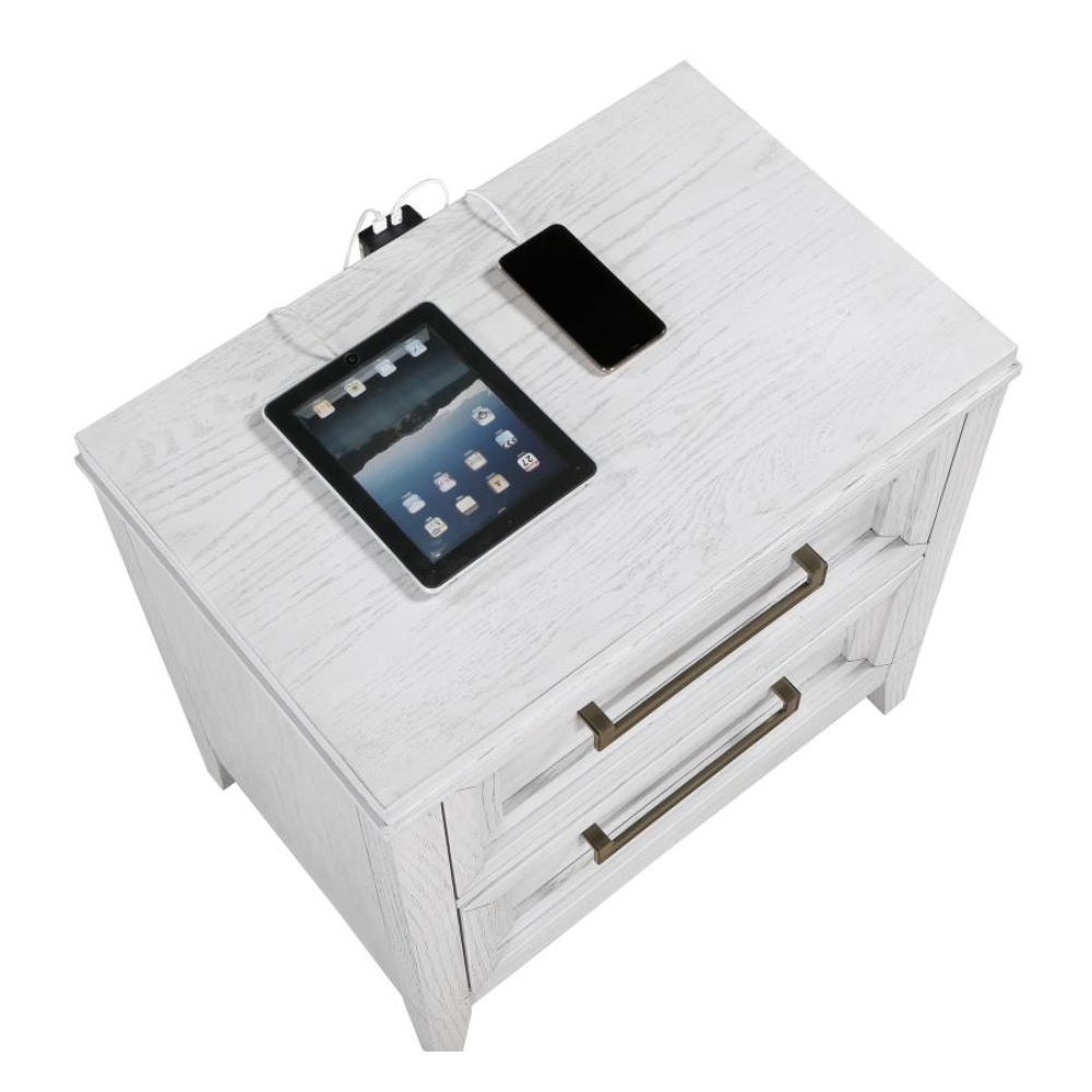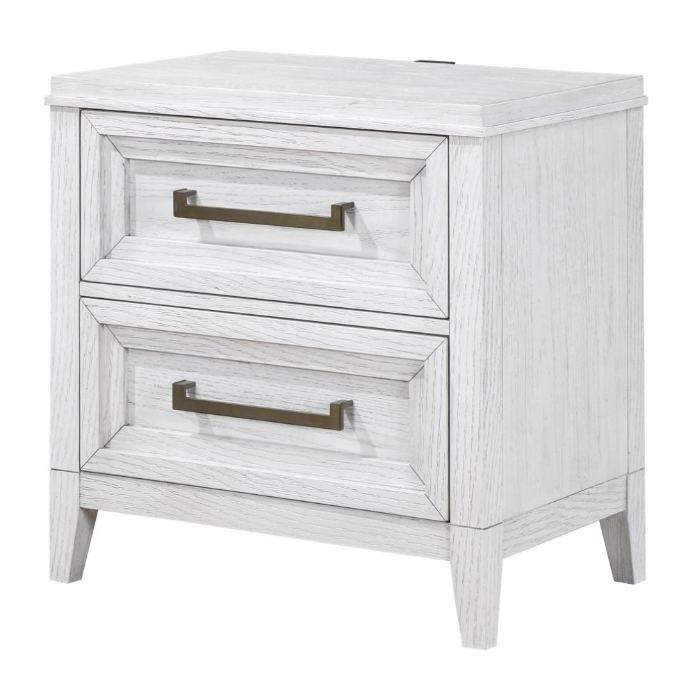 Refresh your bedroom with the understated charm of this modern two-drawer nightstand. A distressed white finish reveals subtle wood grain, while stepped drawer fronts and antique brass bar pulls add refined depth. With spacious drawers and a safety-focused design, it’s both functional and stylish.