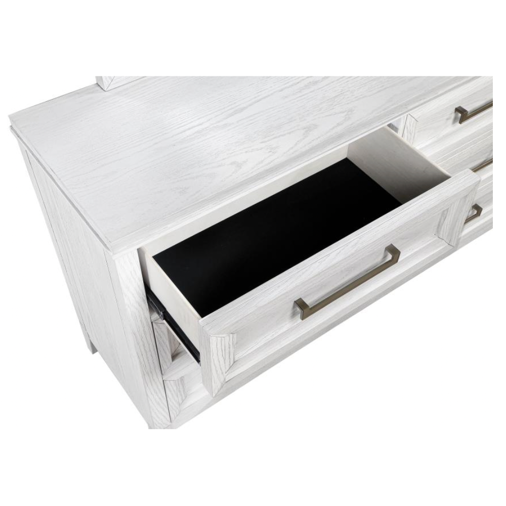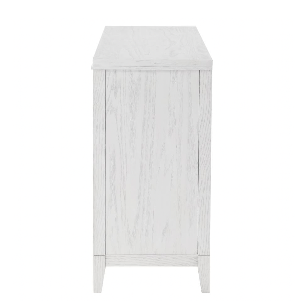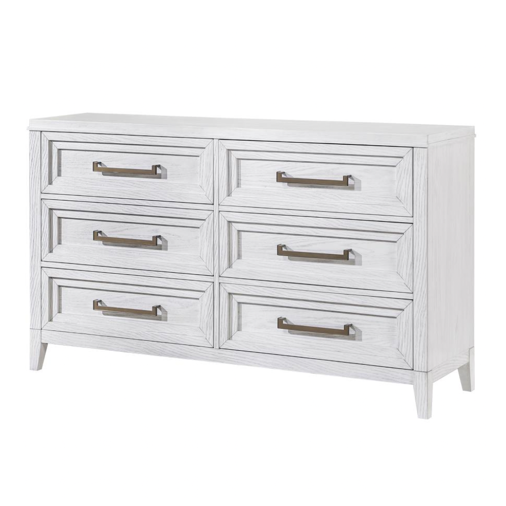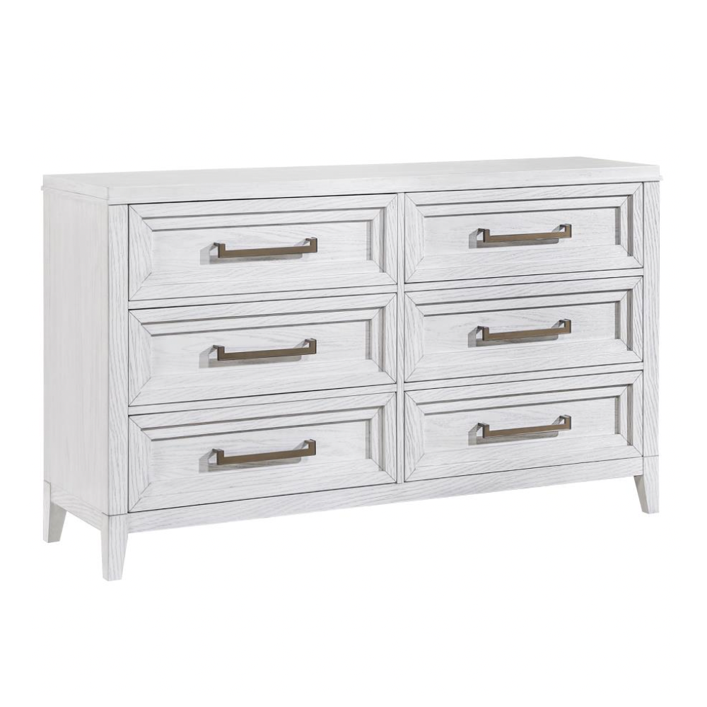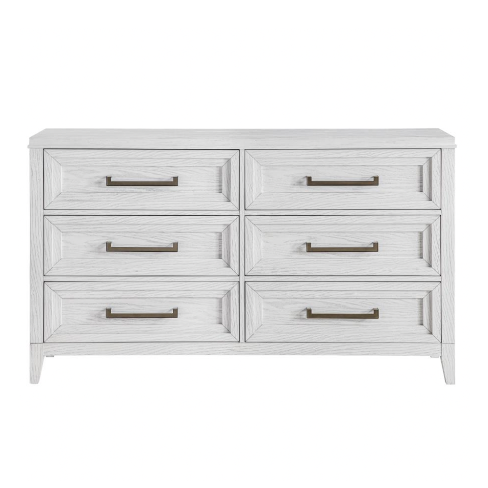 Introduce a fresh, textured look to your bedroom with this modern six-drawer dresser. Designed with a distressed white finish, it reveals subtle wood grain details that enhance its organic character. The dresser features a symmetrical layout with three drawers on each side, perfect for organizing clothing and essentials. Stepped drawer fronts bring sculptural depth, while elongated antique brass-finished bar pulls lend a refined contrast. The generous top surface offers ample space for decor, framed photos, or a jewelry box, blending functionality with elevated style.