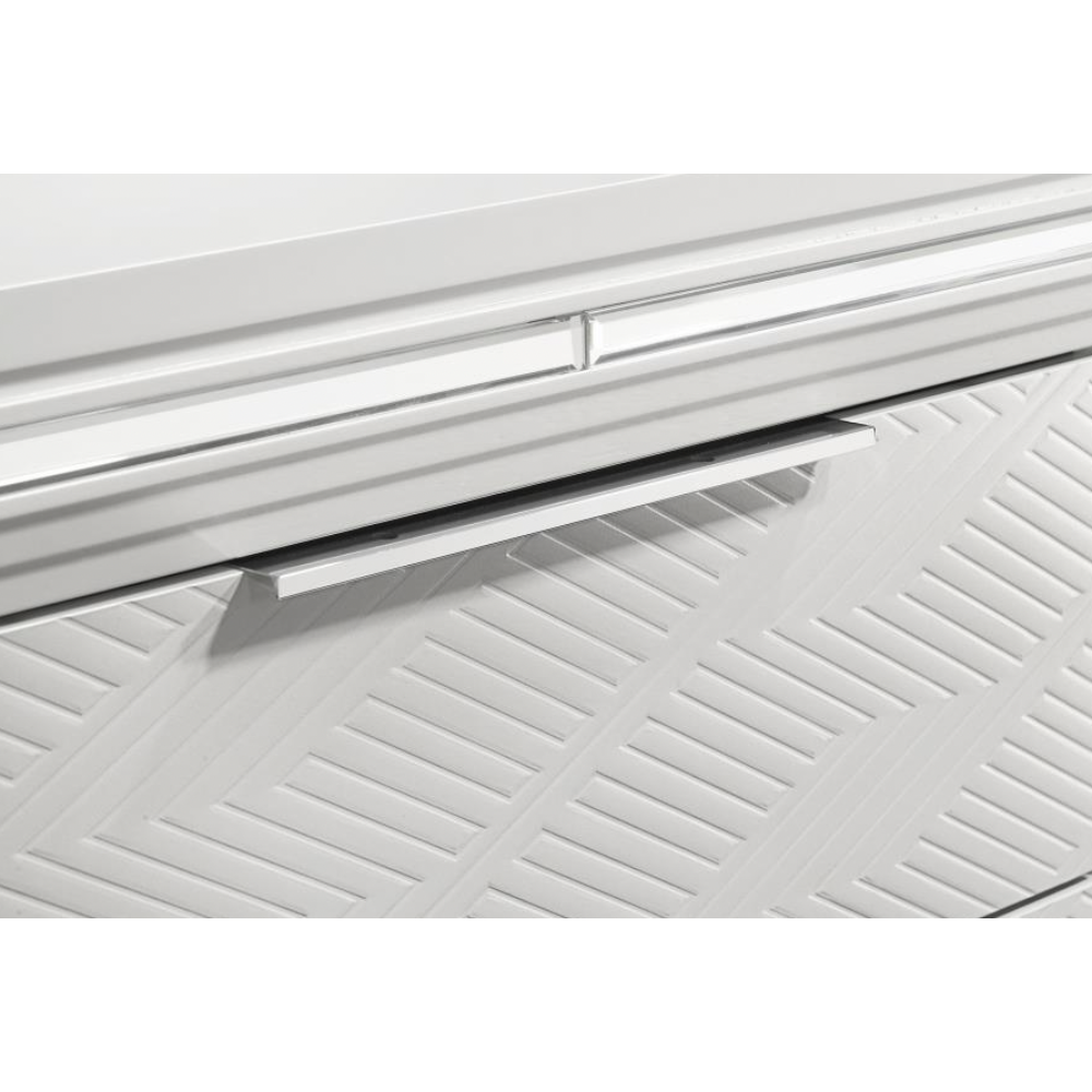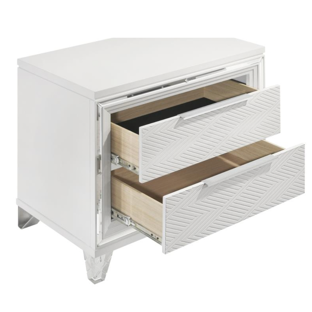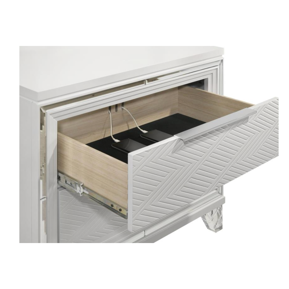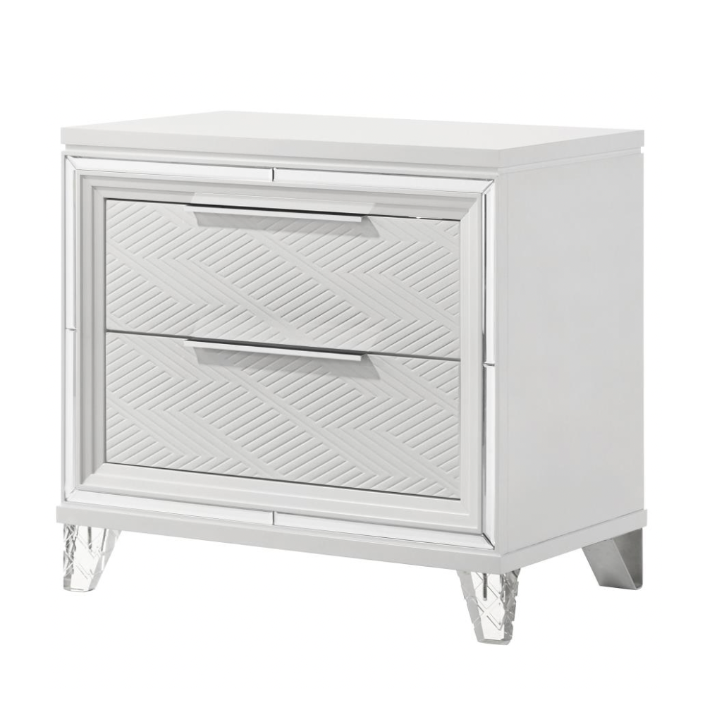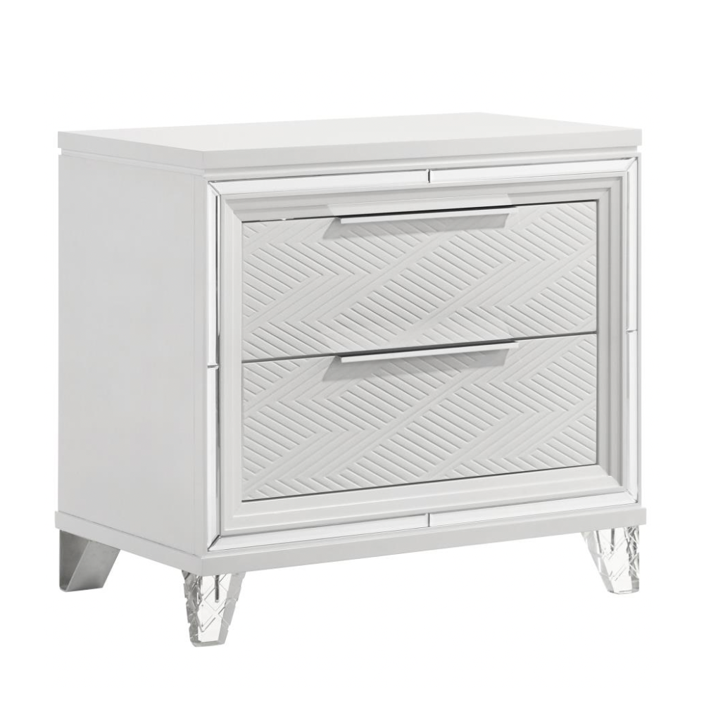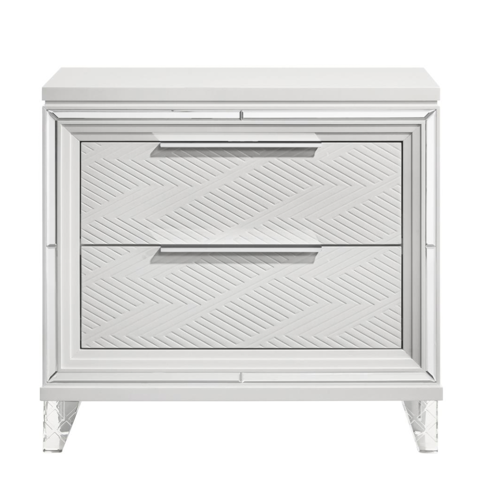 Enhance your bedroom with this sophisticated 2-drawer nightstand, inspired by modern Italian design. A crisp white finish, accented by mirror framing and polished chrome hardware, creates a luxurious aesthetic. The picture-framed recessed panels feature an embossed herringbone graphic pattern, adding texture and elegance. The top drawer includes cord management access, perfect for charging your devices while keeping cords neatly hidden. Crafted from Asian hardwood, MDF, and mirror, this nightstand offers both style and durability for your bedroom retreat.