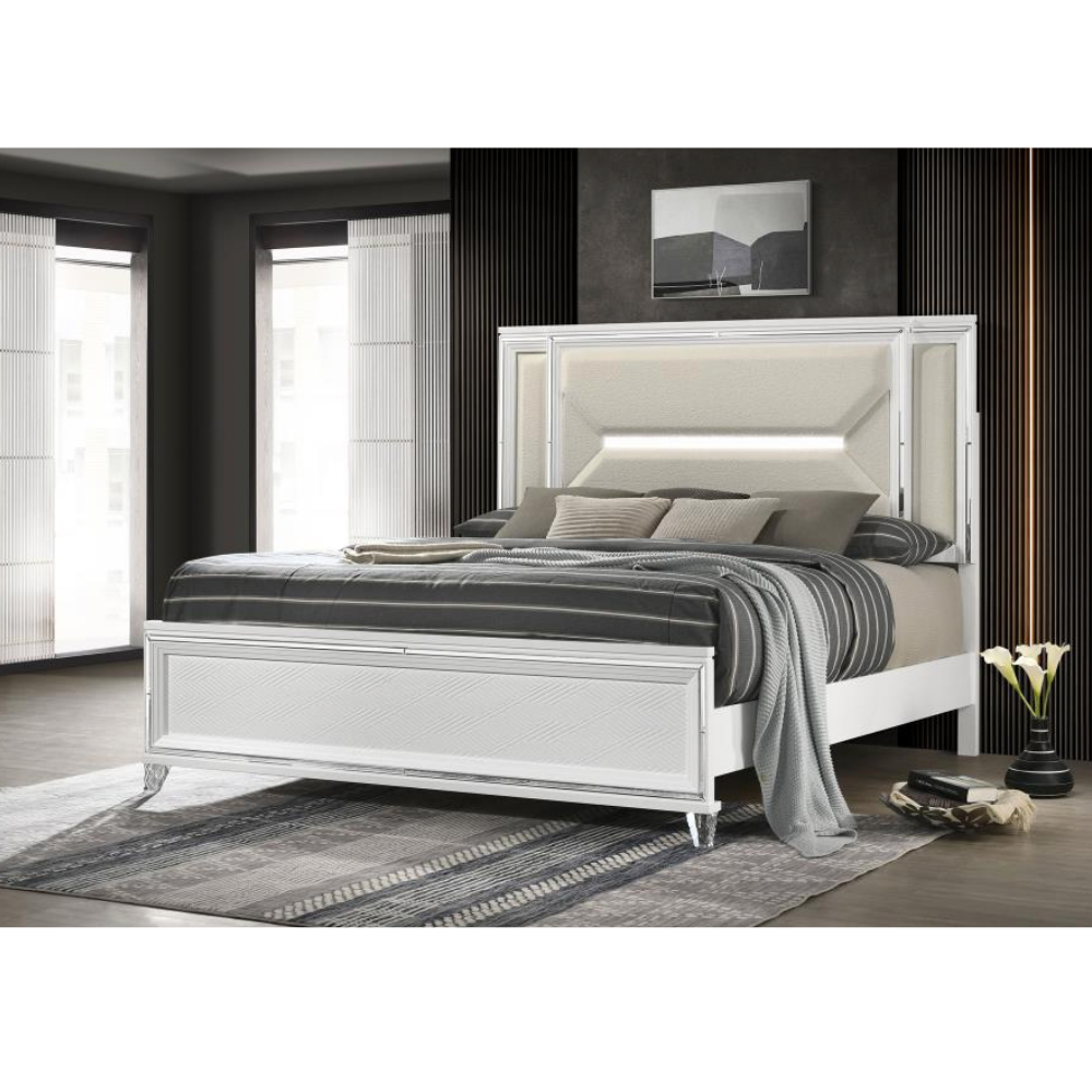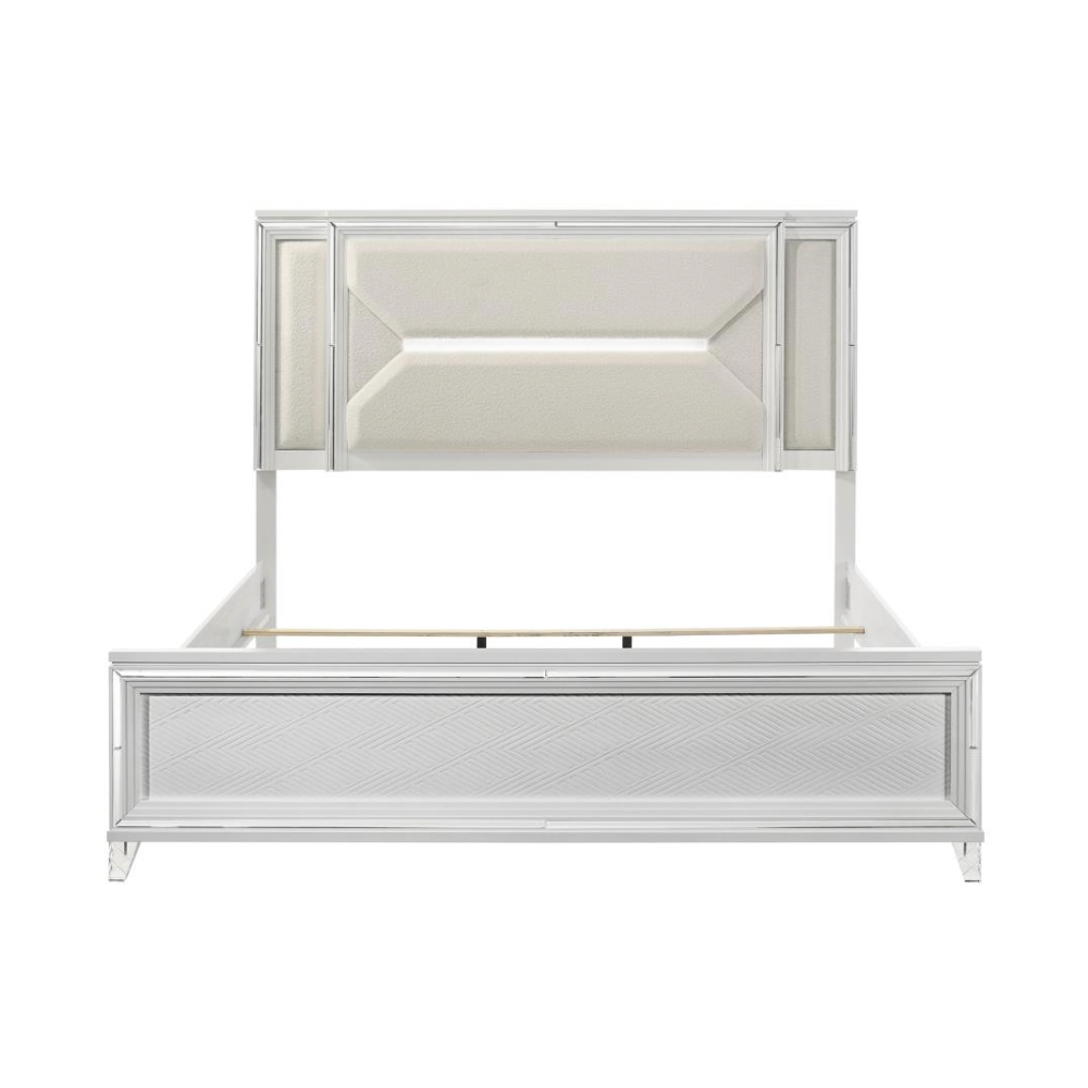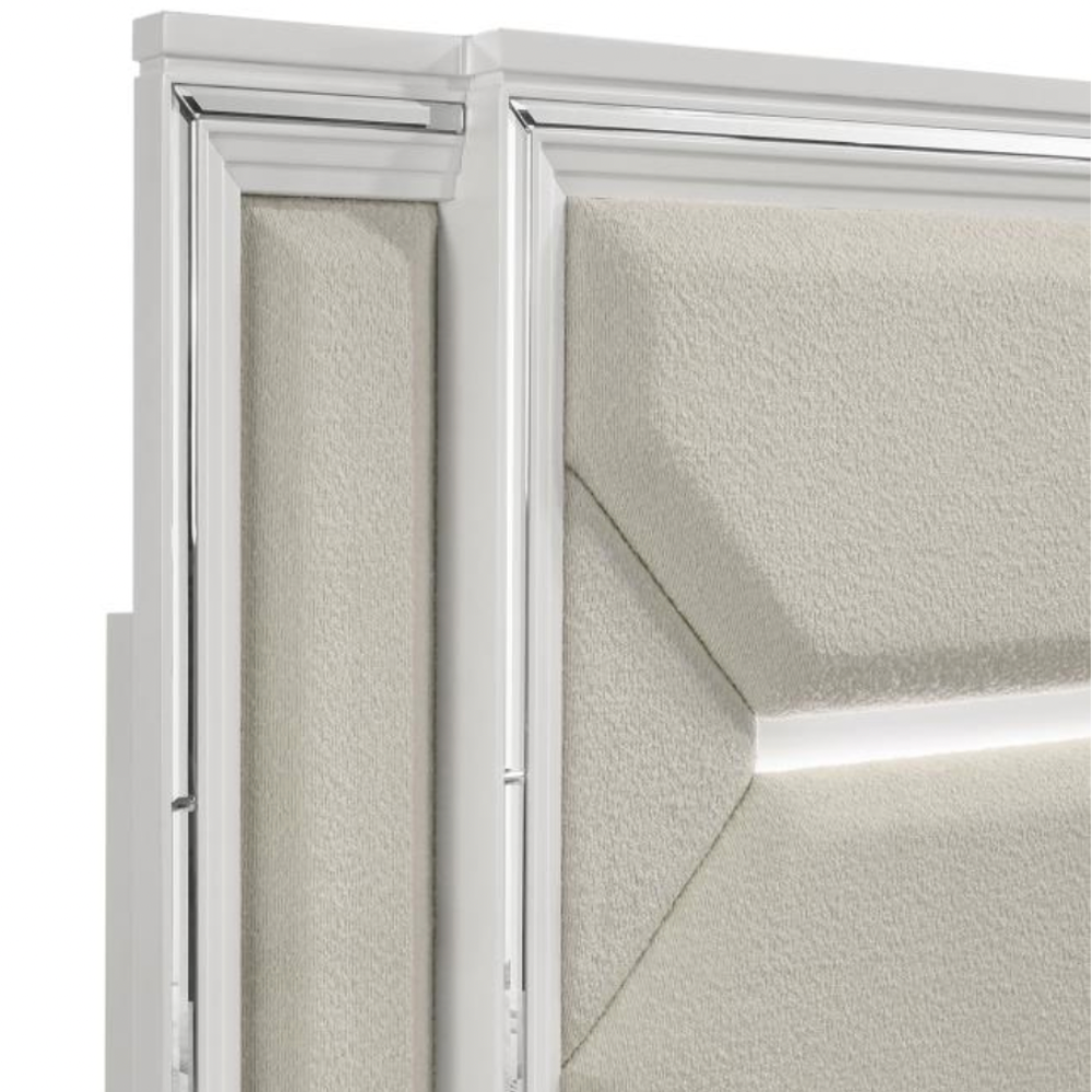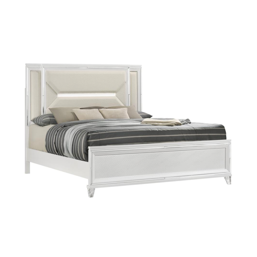 Create a bedroom that radiates luxurious elegance with this modern Italian-designed bed. Its clean lines and picture-framed recessed panels with embossed herringbone patterns exude sophistication, while the 3-dimensional headboard, upholstered in off-white boucle fabric, adds a plush and stylish touch. Accented with mirror framing, acrylic legs, and touch LED lights, this bed perfectly balances opulence and functionality.
