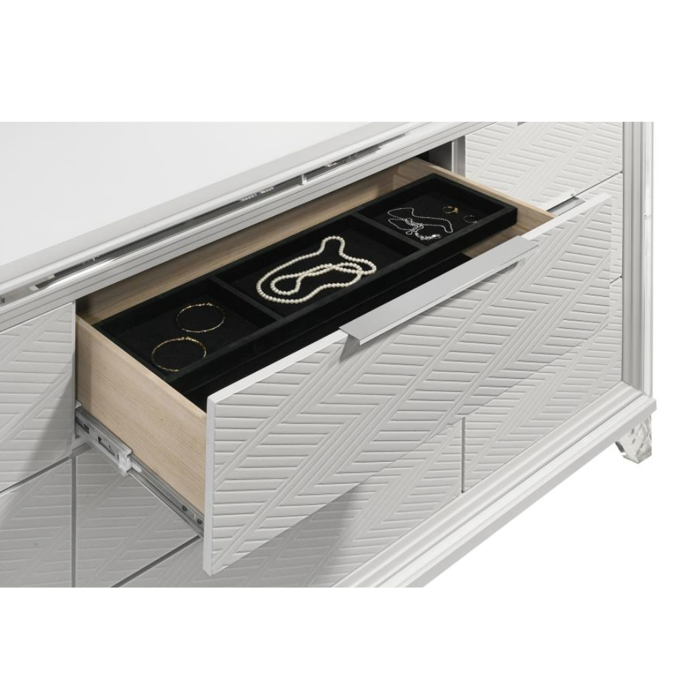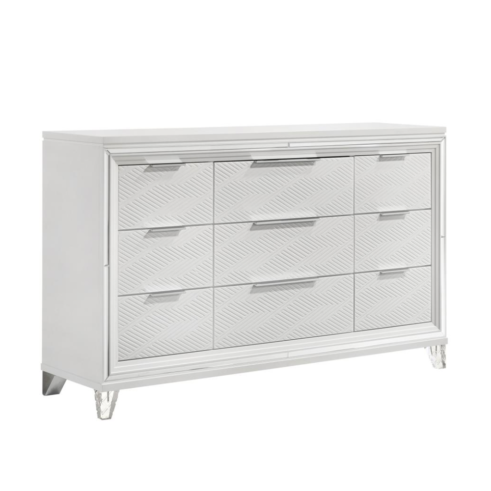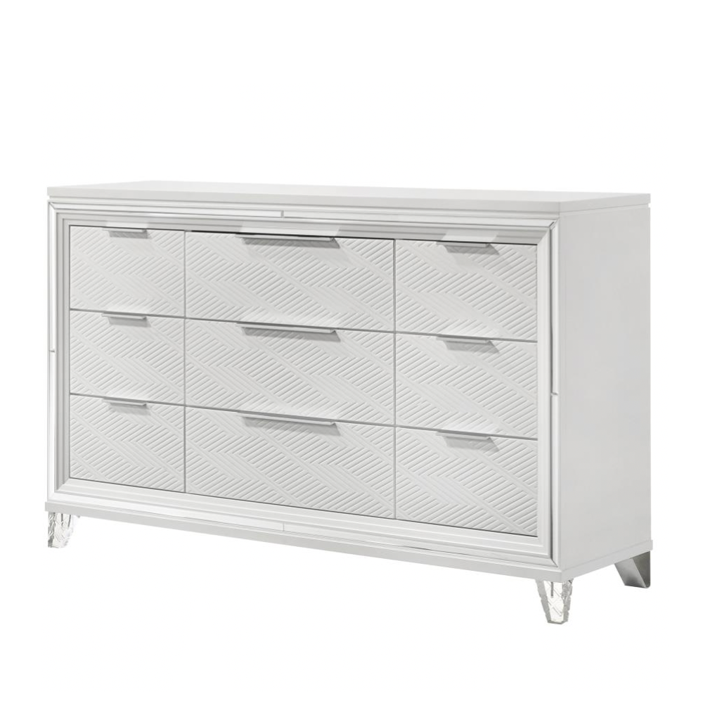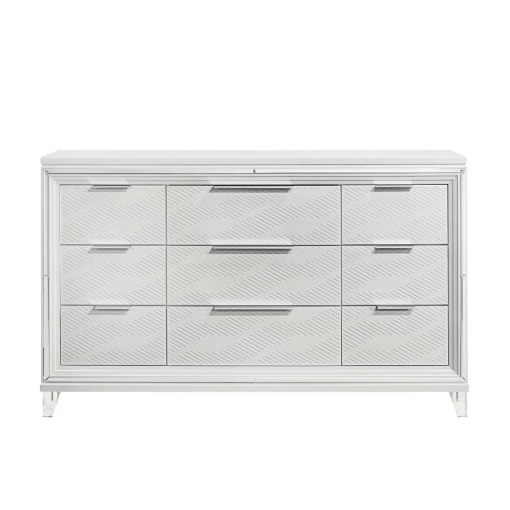 Elevate your bedroom with this modern Italian-inspired 9-drawer dresser, featuring a crisp white finish with embossed herringbone patterns and picture-framed recessed panels. Mirror framing, polished chrome hardware, and acrylic legs add a touch of glamour, while the top center drawer includes a removable jewelry tray for added convenience. Crafted from Asian hardwood, MDF, and mirror, this dresser offers a perfect blend of style and practicality.