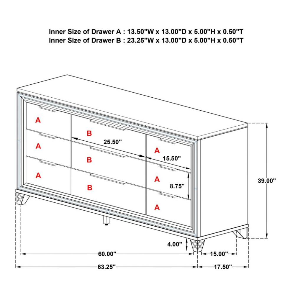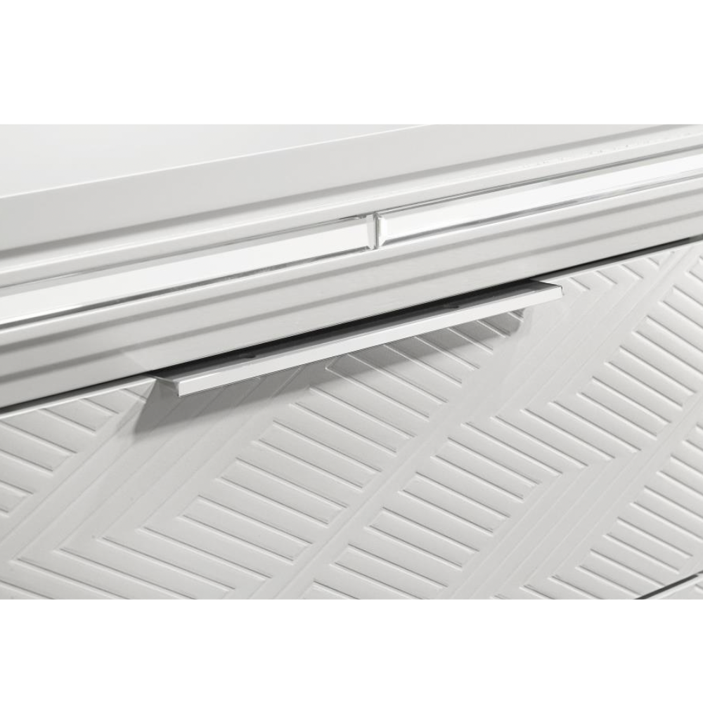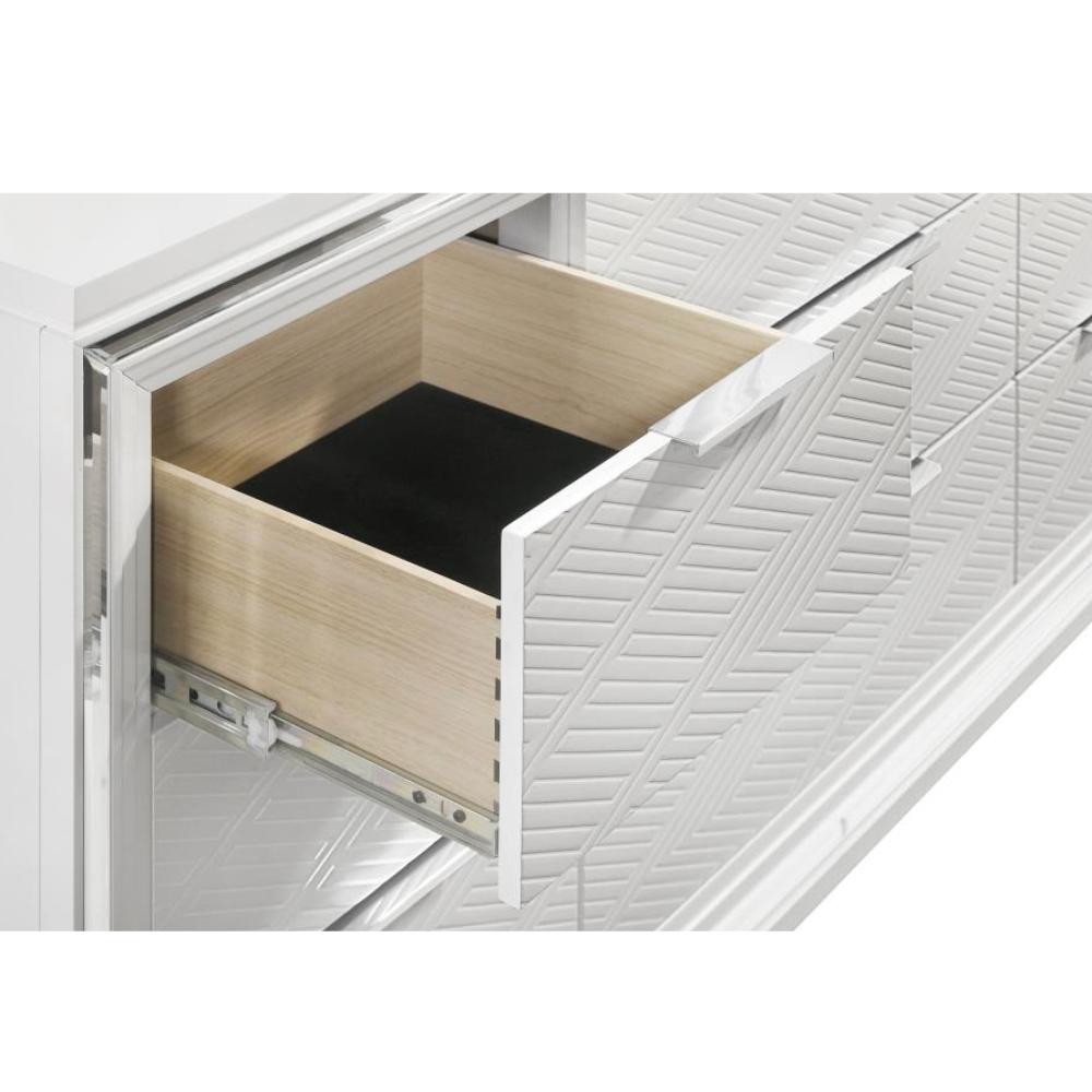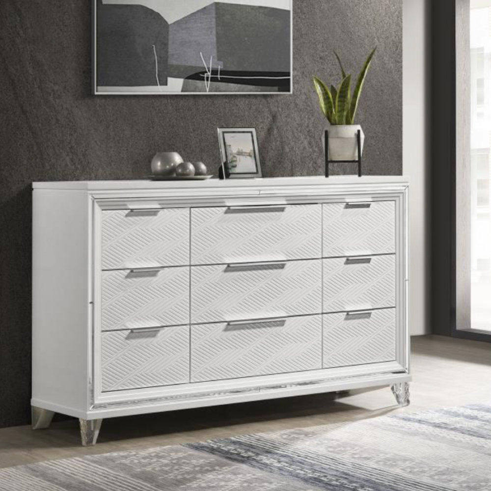 Elevate your bedroom with this modern Italian-inspired 9-drawer dresser, featuring a crisp white finish with embossed herringbone patterns and picture-framed recessed panels. Mirror framing, polished chrome hardware, and acrylic legs add a touch of glamour, while the top center drawer includes a removable jewelry tray for added convenience. Crafted from Asian hardwood, MDF, and mirror, this dresser offers a perfect blend of style and practicality.
