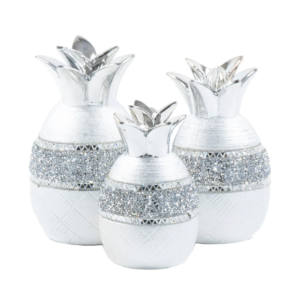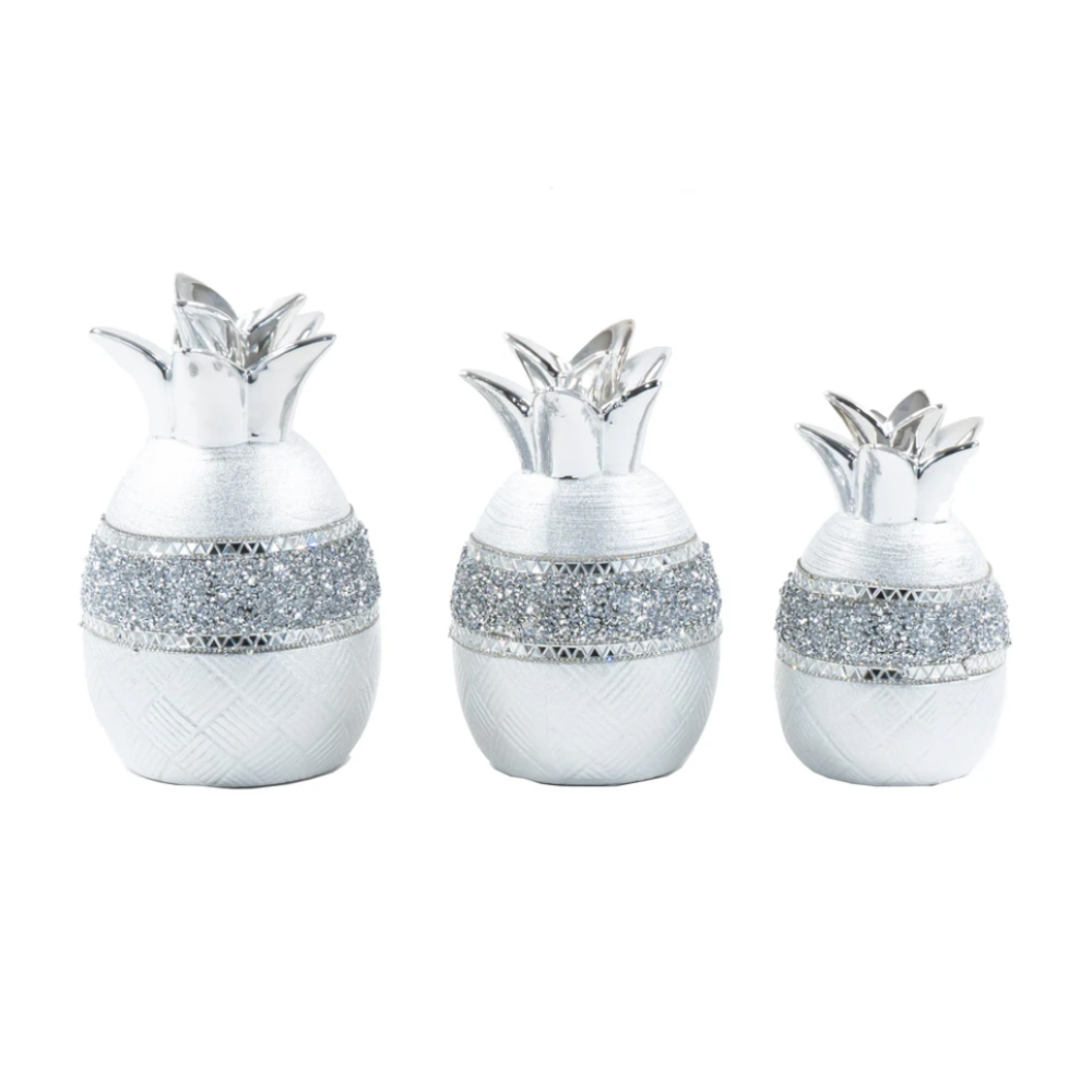 Celebrate the perfect fusion of contemporary art and the timeless symbol of friendship with our Three-Piece Pineapple Sculpture Set. Like the pineapple standing tall and proud with its crown, this luxurious set brings an elegant touch to any room. Each sculpture is crafted from high-quality ceramic, featuring a lustrous metallic silver finish that adds sophistication and charm to your decor. Ideal for entryways, living rooms, or dining areas, this set will radiate a sense of warmth and luxury.