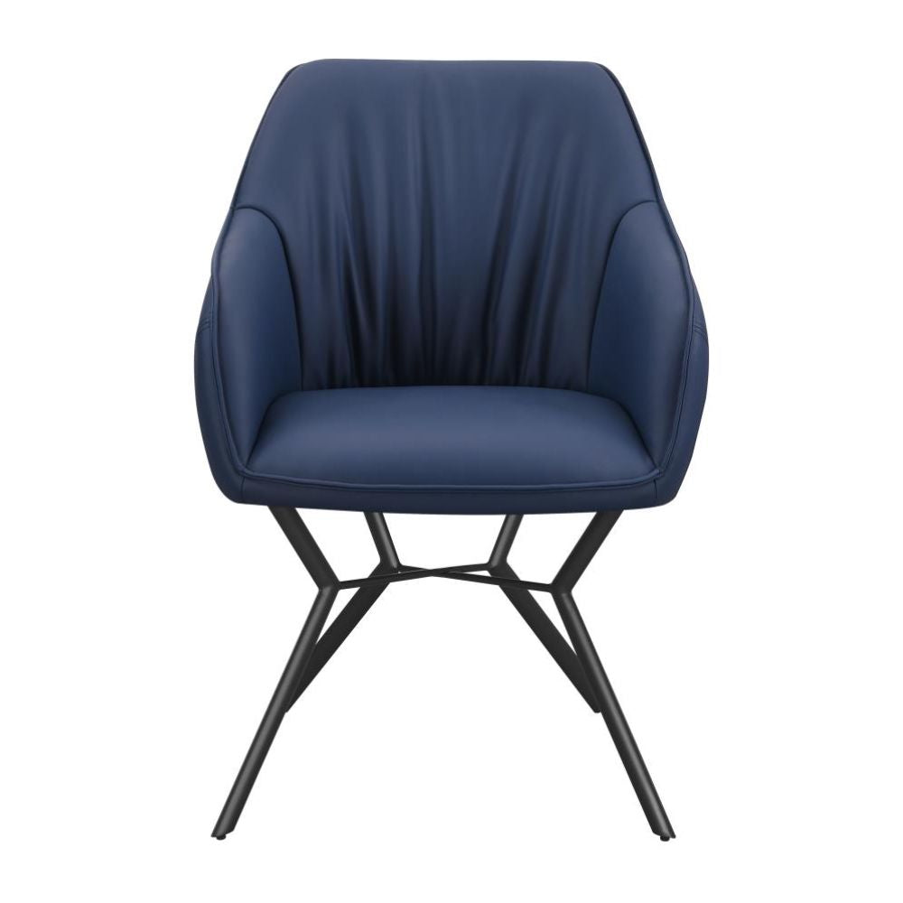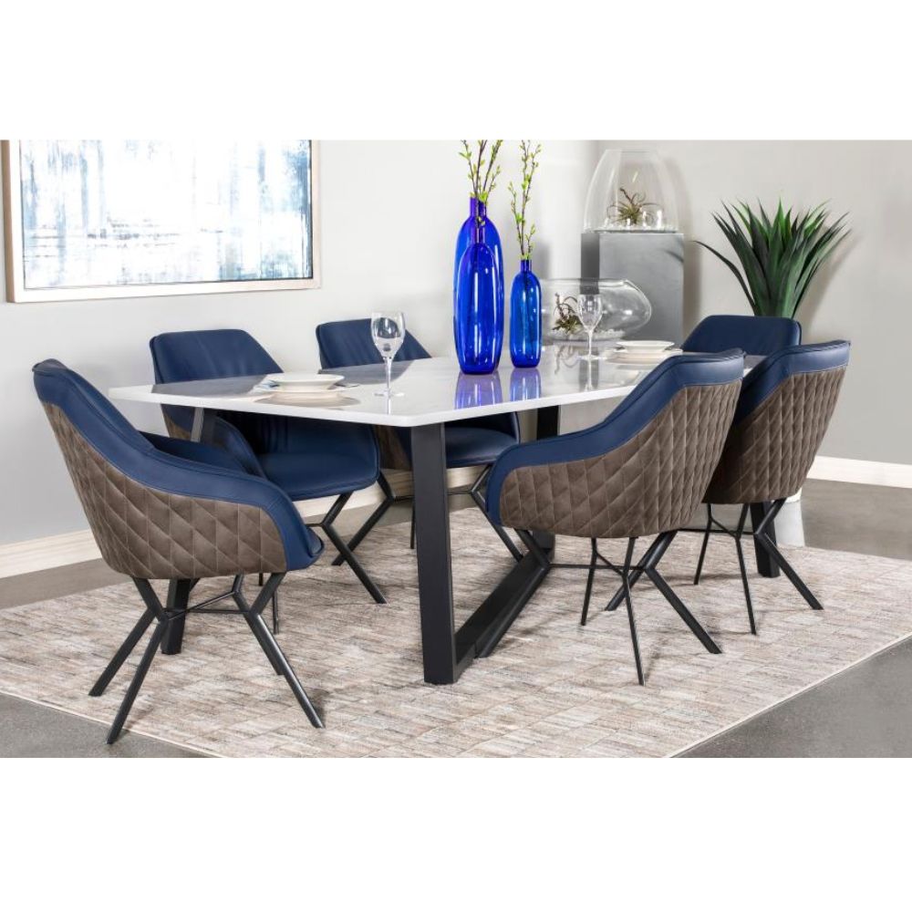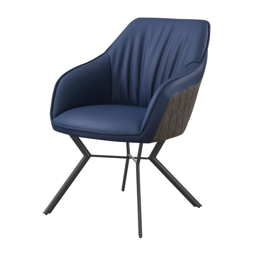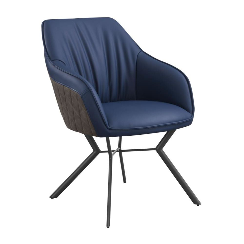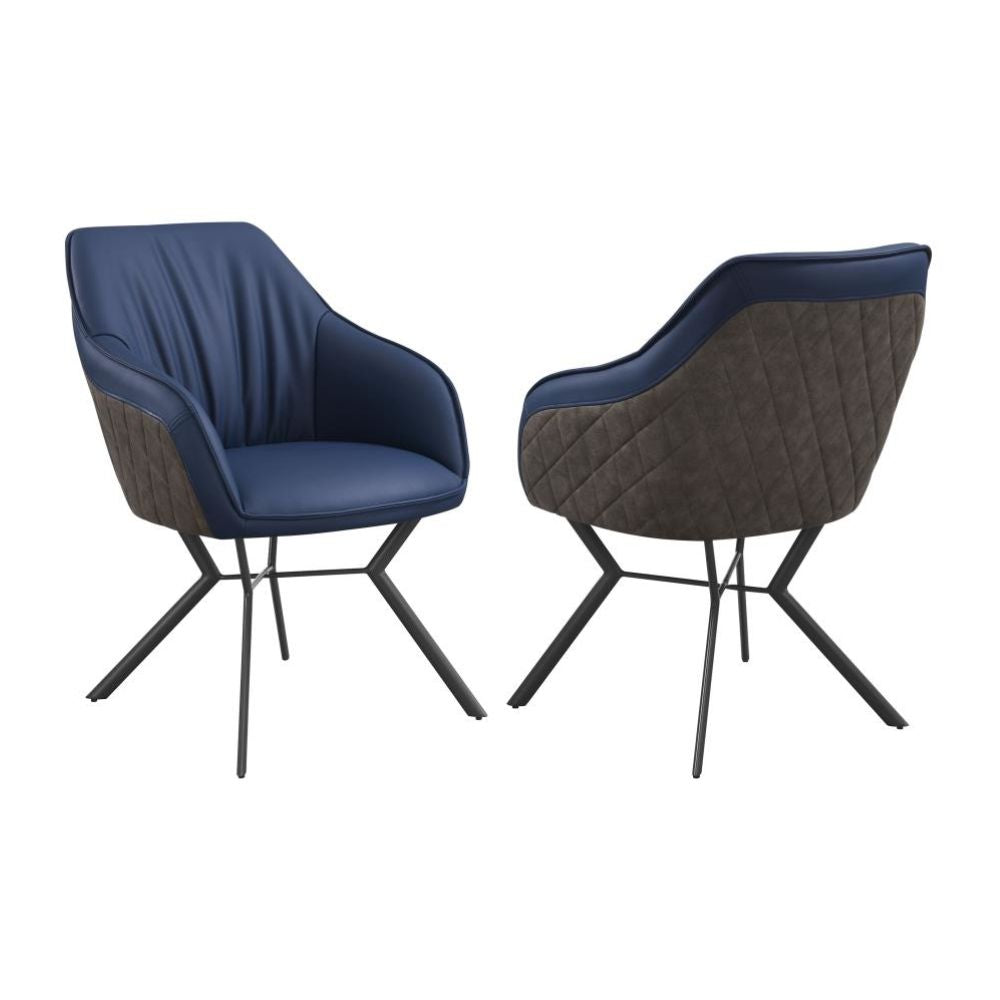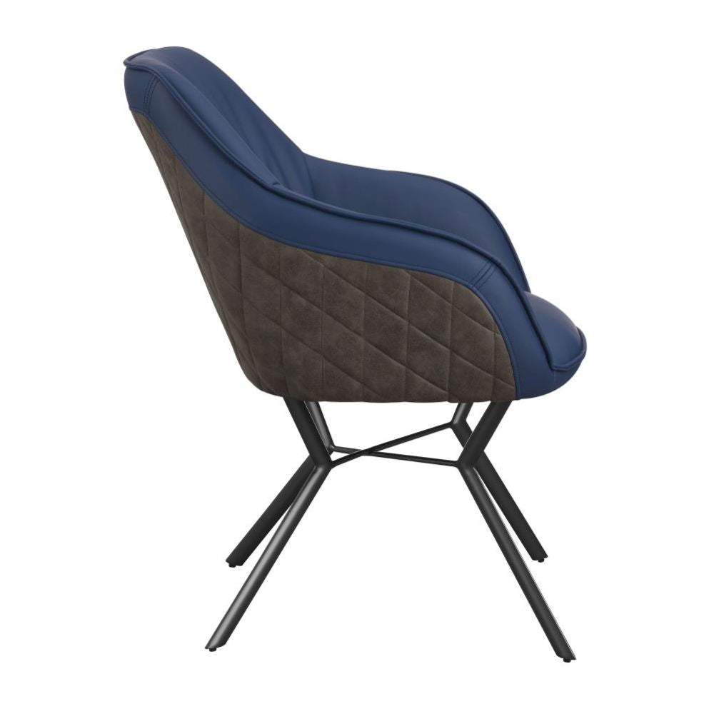 Retro vibes and mixed materials elevate the look of this contemporary dining chair. An upholstered seat features elegant, sloped armrests and a blue leatherette interior, wrapped with a diamond-quilted brown leatherette back fabric for a subtle contrast. Welt trim details and a loosely gathered back create a timeless, yet comfortable and casual touches. This dining chair rests also on a metal base with a gunmetal finish that offers a sleek, stylish look. Slim angled legs flare outward dramatically, offering up a vintage throwback.
