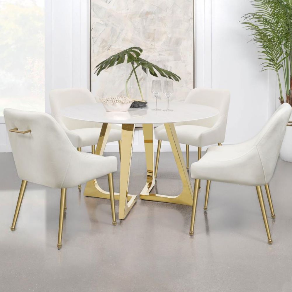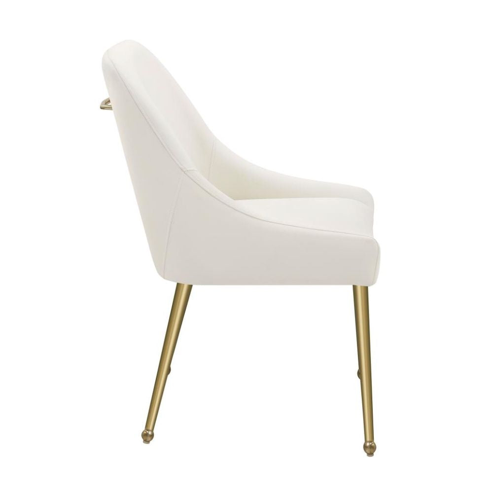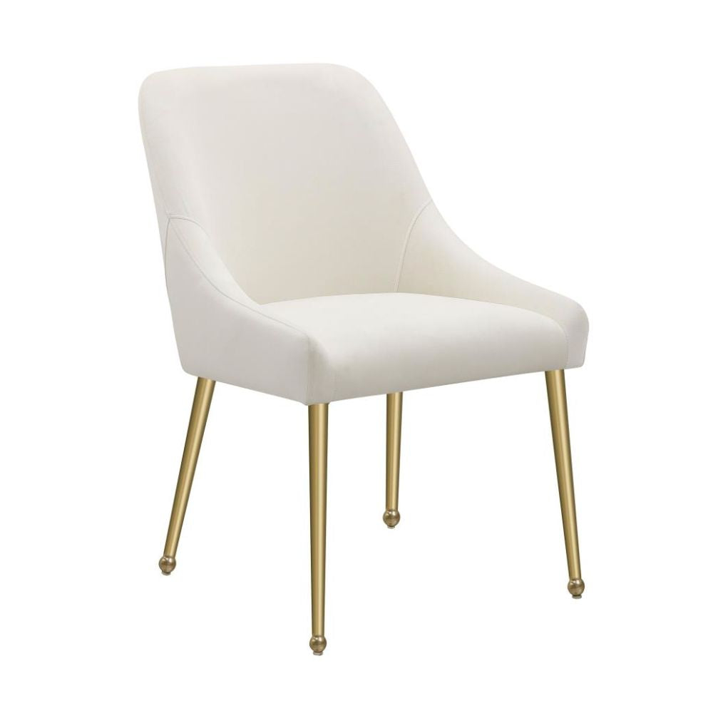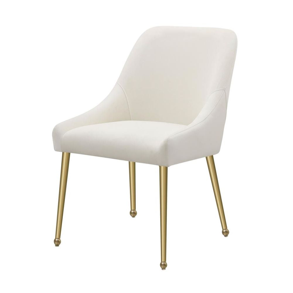 Cradle yourself in the embrace of opulence with this Italian-style modern dining side chair, where comfort meets sophistication. Its gold metal legs, tapering into geometric spheres, create a foundation that's as sturdy as it is striking. The seat, a haven of luxury, boasts sloped arms and plush cushions that beckon you to linger longer after the meal has ended. A purposeful handle on the chair back not only adds to the aesthetic charm but also serves in practical motion, inviting ease with a touch of elegance. This chair is a statement piece, ready to elevate the dining experience and infuse your space with a blend of retro inspiration and contemporary flair.