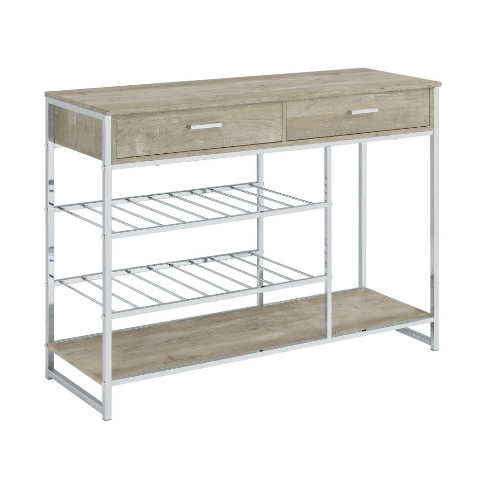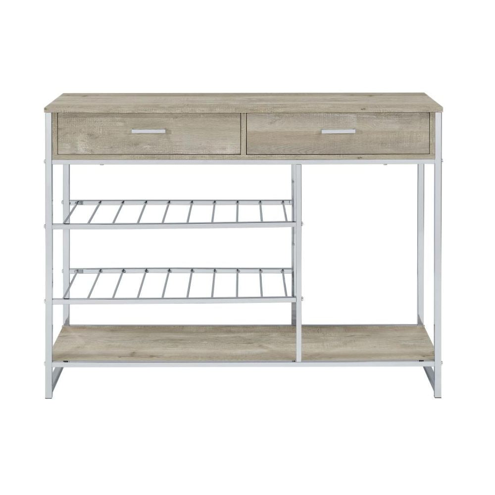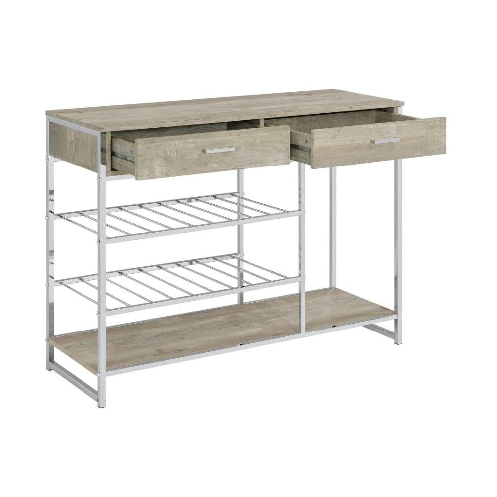 Your entertaining needs are filled with a sense of casual style and supreme organization as this bar cabinet provides space and configuration for a casual space. Make serving a breeze with a cabinet featuring gray finish wood products construction of an upper two-drawer cabinet and matching lower shelf. Minimalist metal framing adds a great optical benefit, with two slat shelves that accommodate dishware and stemware. Drawers open easily to make space for implements. This all-in-one bar cabinet offers a fresh, clean look and lots of convenience to organize an entertainment regimen.