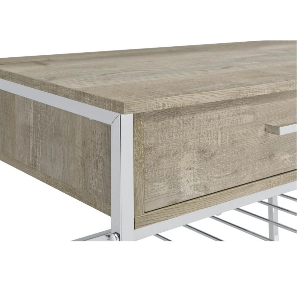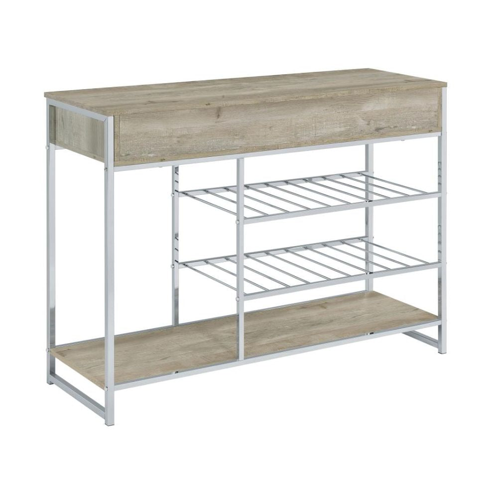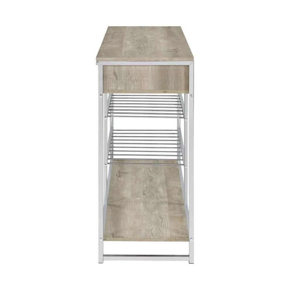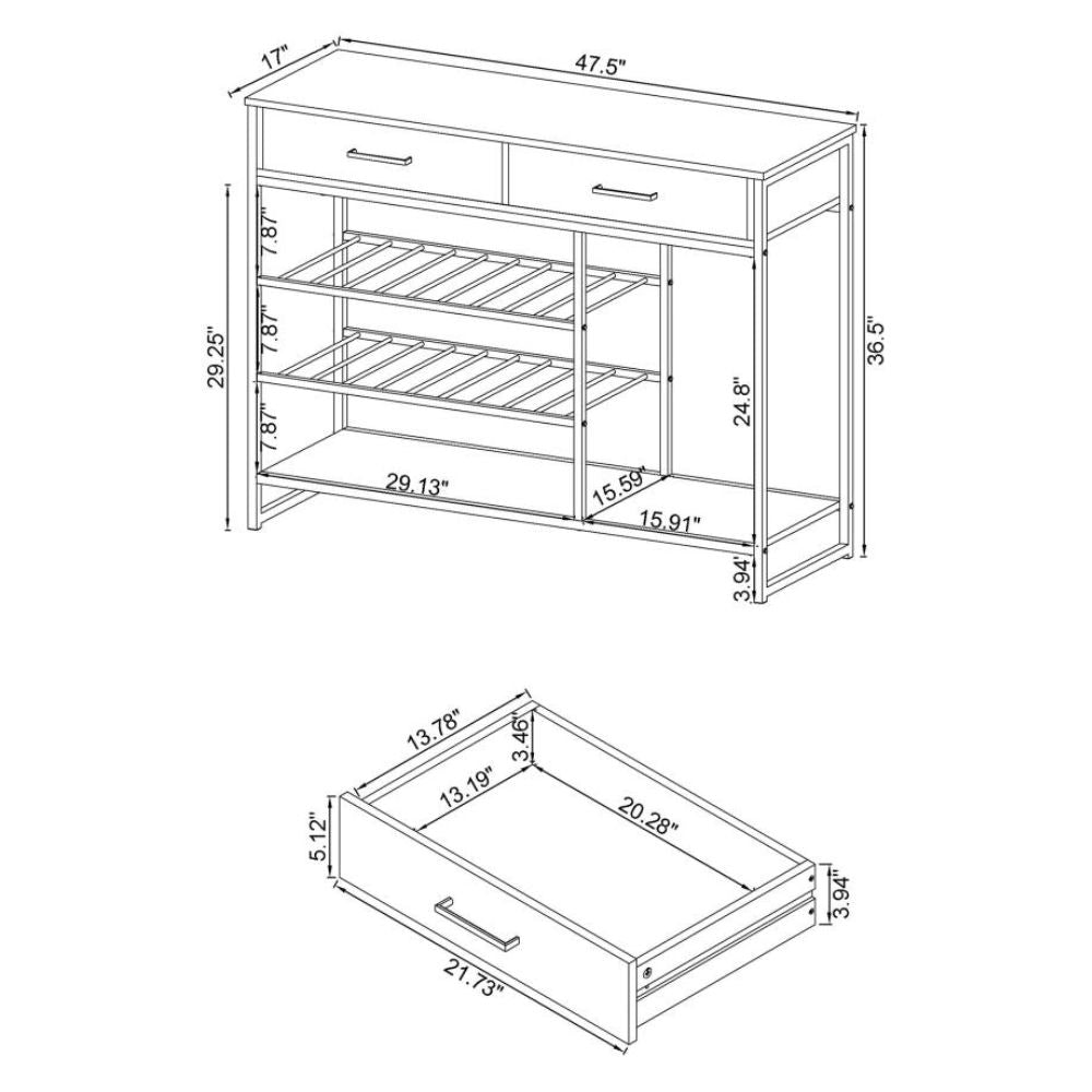 Your entertaining needs are filled with a sense of casual style and supreme organization as this bar cabinet provides space and configuration for a casual space. Make serving a breeze with a cabinet featuring gray finish wood products construction of an upper two-drawer cabinet and matching lower shelf. Minimalist metal framing adds a great optical benefit, with two slat shelves that accommodate dishware and stemware. Drawers open easily to make space for implements. This all-in-one bar cabinet offers a fresh, clean look and lots of convenience to organize an entertainment regimen.