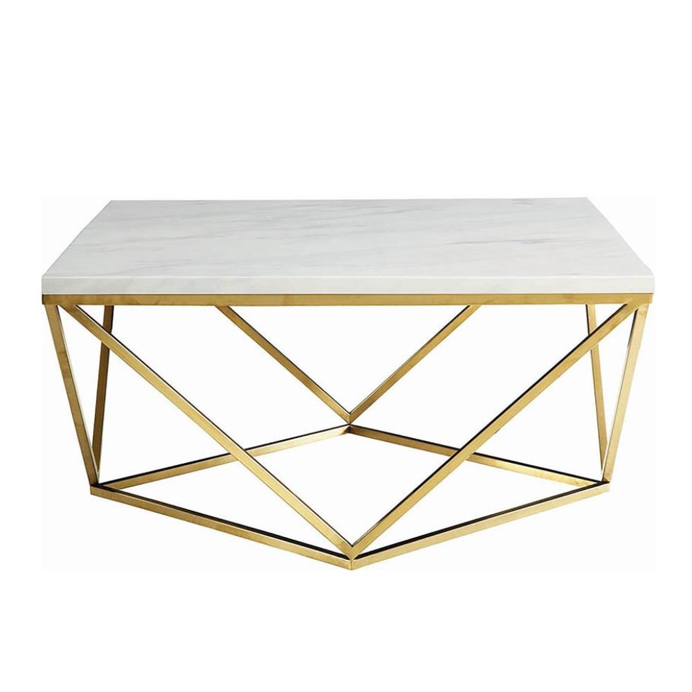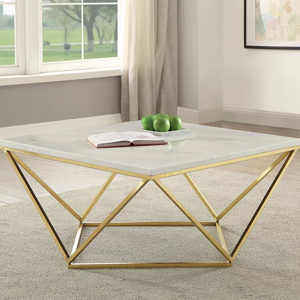 This handsome white and gold-accented table adds a touch of bright, airy panache to the home. It features a square-shaped tabletop with marble-like features. The four V-shaped legs and base come in a gold color design for a bold contrast. This splendid piece is ideal for a living room with lots of light. It's a great complement to a sofa and armchair with white and gold accents.