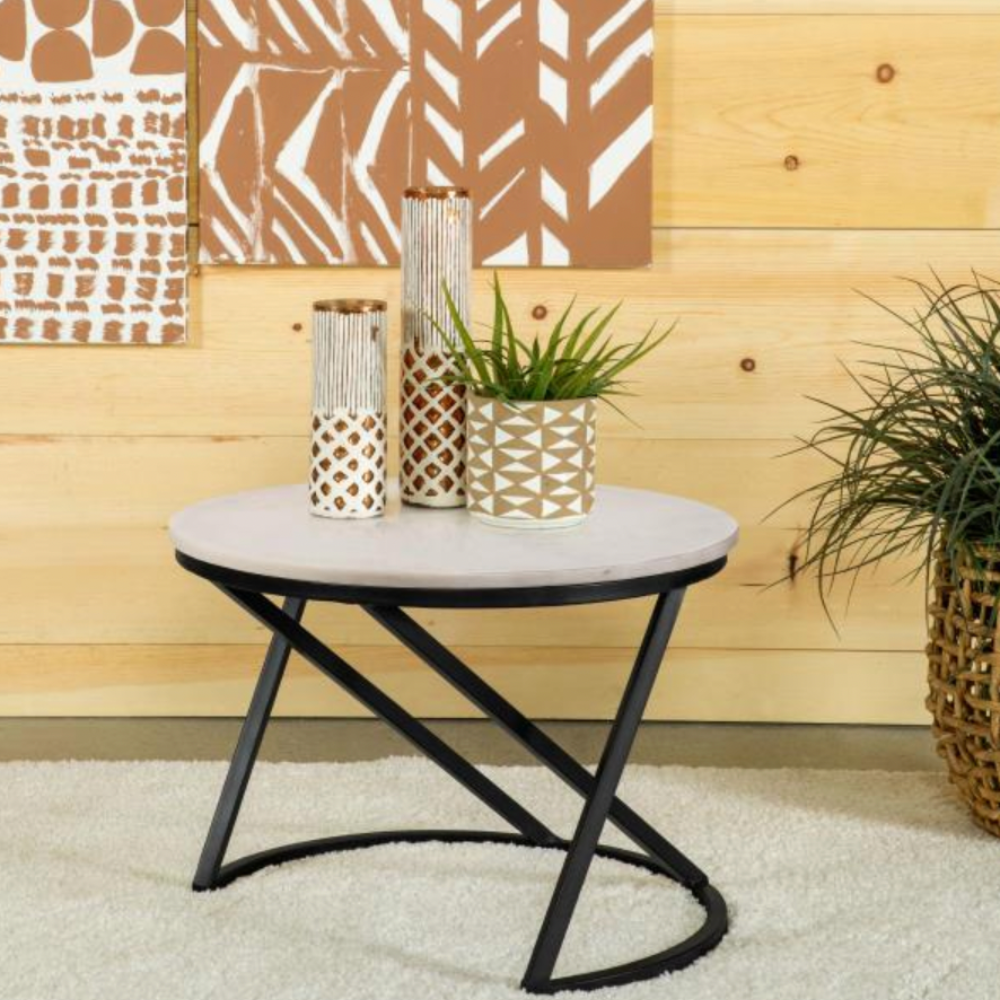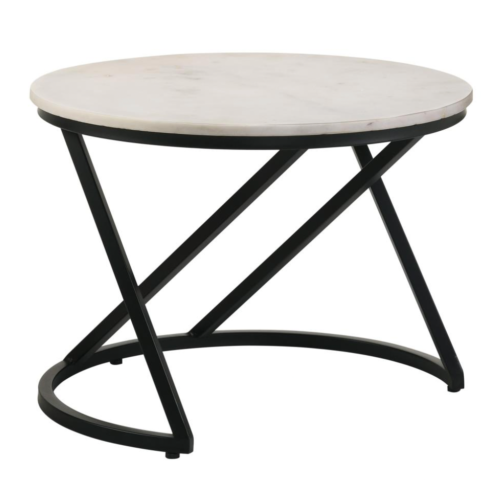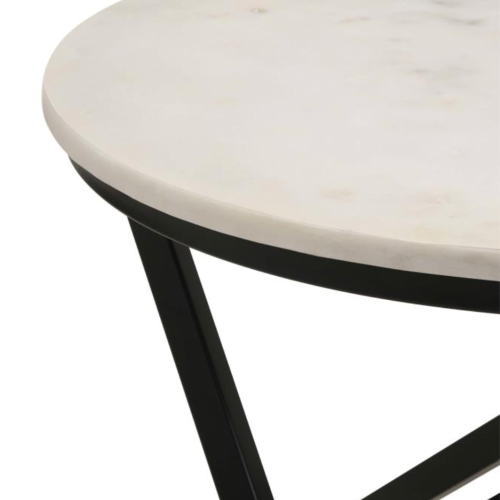 Elevate your space with this contemporary accent table featuring a polished bright white marble top. The sleek design is complemented by a flush C-shape base with angled and straight metal supports, finished in a contrasting dark black. Ideal for pairing with a low-profile accent chair or as a cocktail table in a seating arrangement, this round table provides a stylish spot for lamps, books, and refreshments. Its timeless materials and modern silhouette offer an effortlessly chic touch to any room.