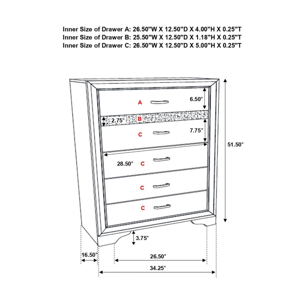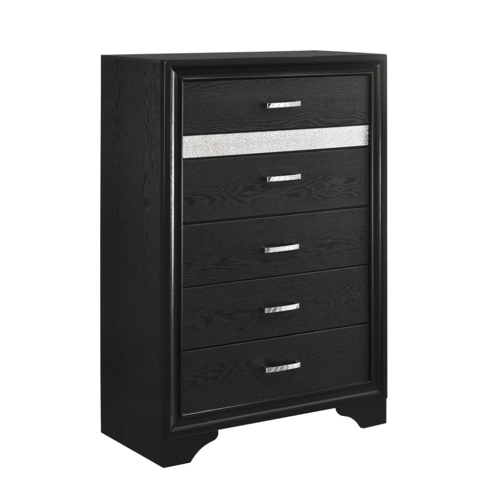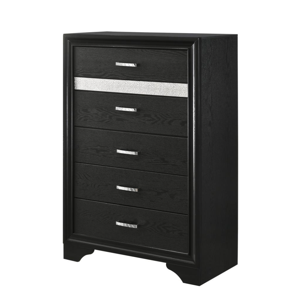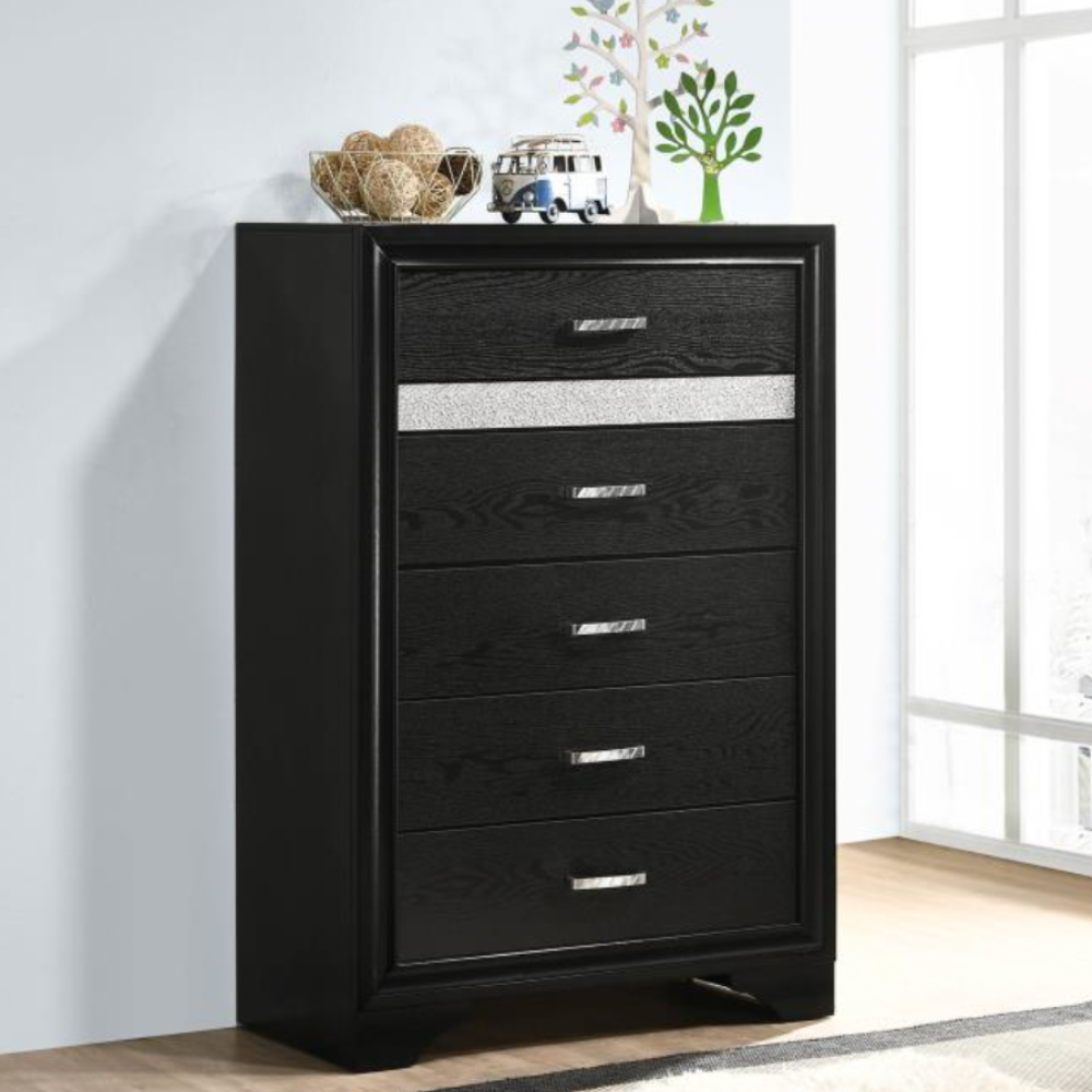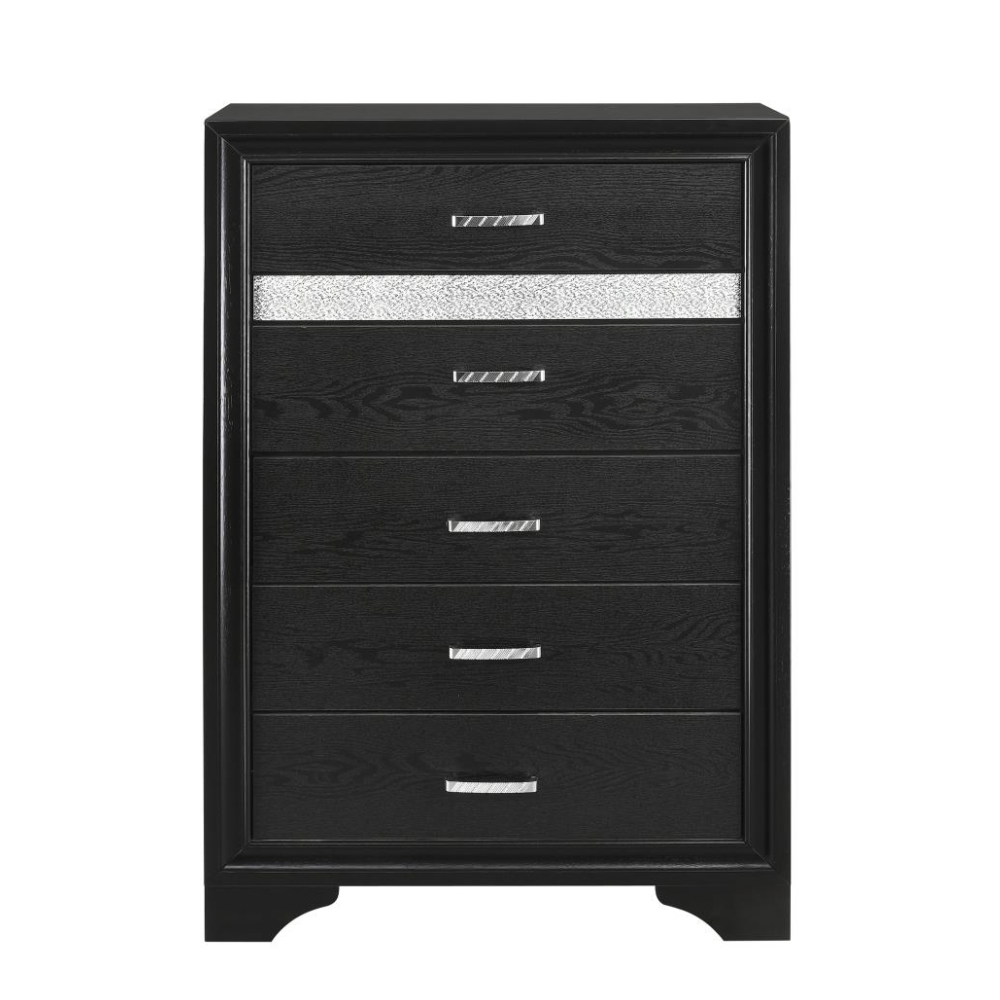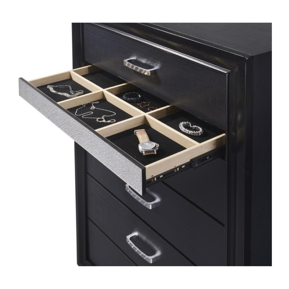 Add a touch of posh glamour to your bedroom with this stunning five-drawer chest. Its sleek silhouette is enhanced by shimmering accents and luxe details that exude sophistication. A hidden felt-lined jewelry drawer offers discreet storage, while smooth-gliding drawers provide everyday functionality. Rhinestone hardware and your choice of finish complete the look with modern elegance.