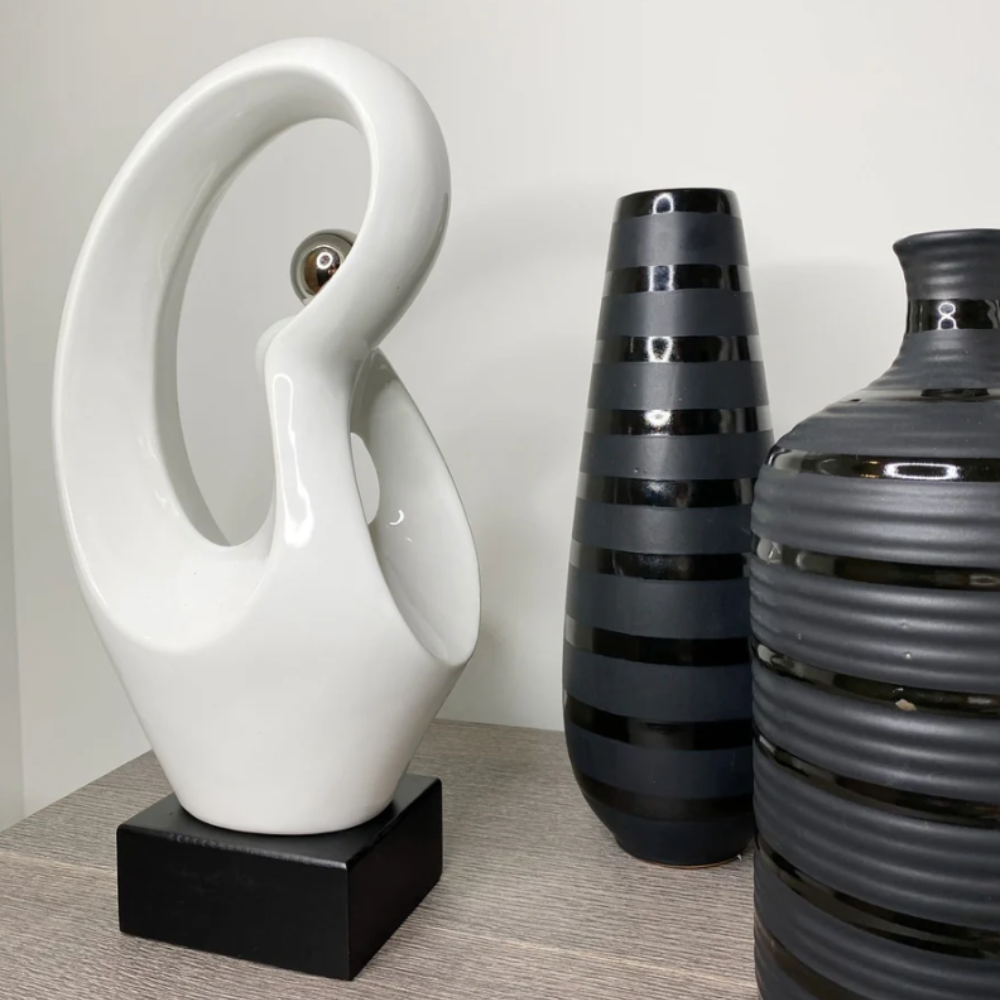 Complete your modern office bookshelf or side table with this sleek and flowing high gloss white sculpture. The contemporary design is highlighted by a lustrous silver sphere, adding a touch of sophistication and modern flair. Perfect for elevating the aesthetic of any space, this other-worldly piece is crafted from high-quality ceramic and rests on a dark wooden base for a striking contrast. Enhance your office or living room with this captivating sculpture today.