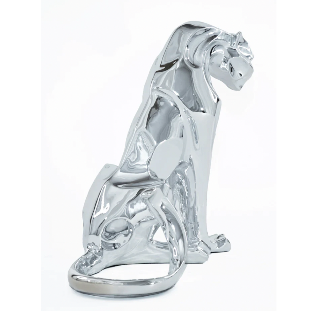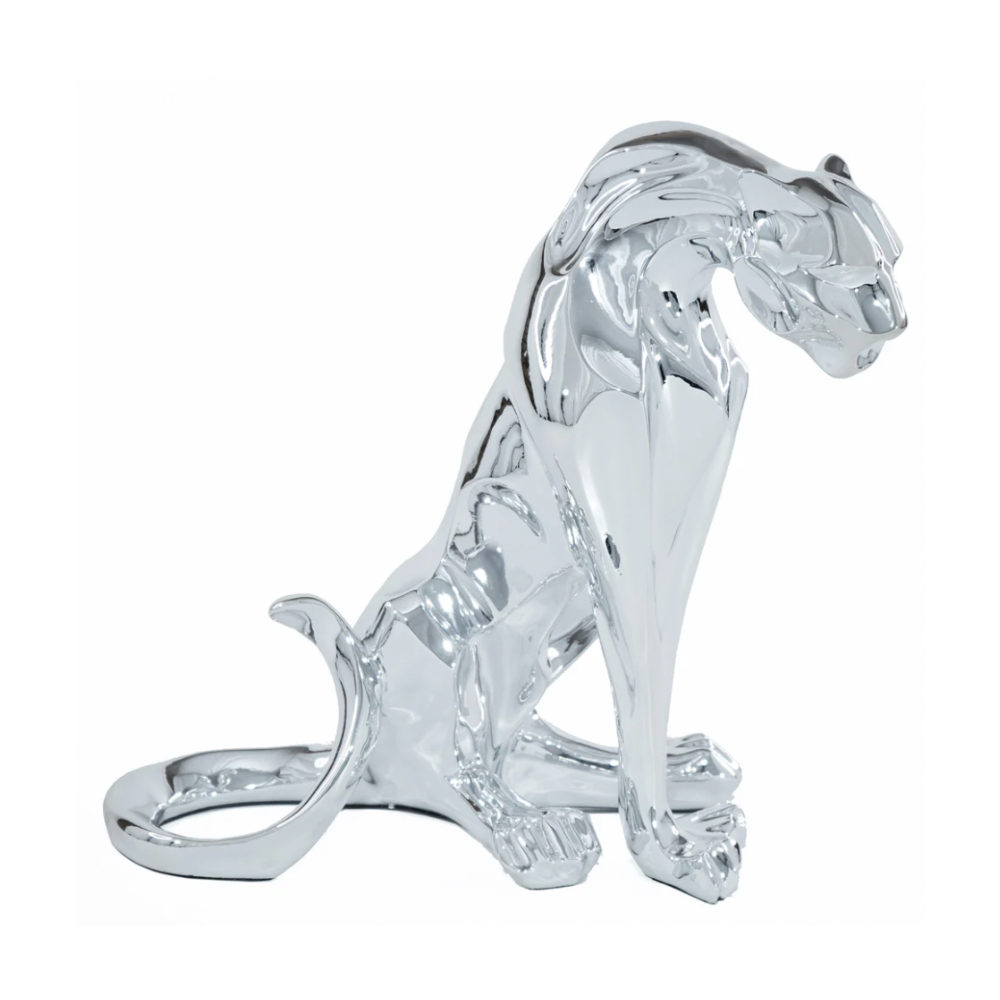 This fierce panther statue is the perfect accent to elevate your home or office decor. With its powerful stance and sleek design, it brings character and style to any space. Ideal for side tables, corner displays, or entryways, this striking piece is sure to impress. Crafted from the highest quality polystone material and finished in a glossy silver sheen, this sculpture adds a bold, modern touch to your interior.