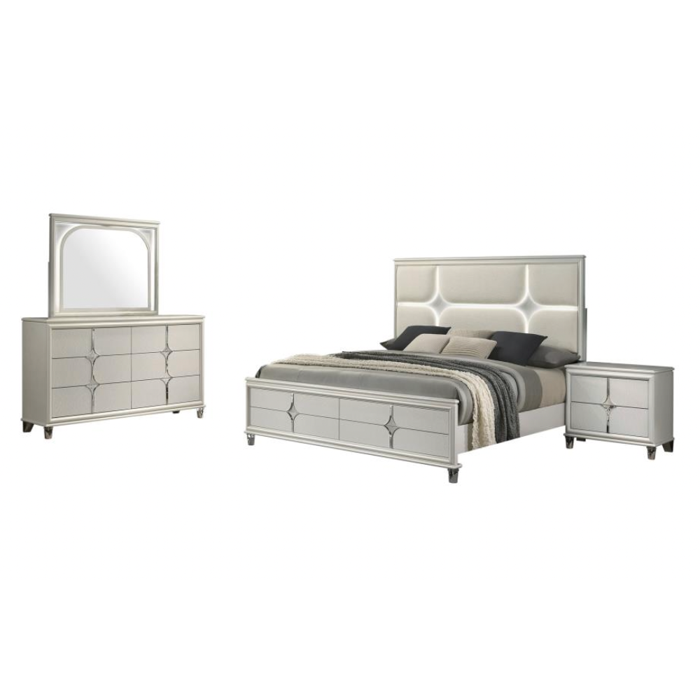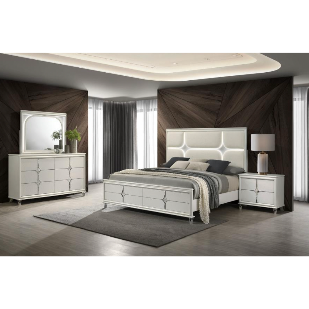 Indulge in the ultimate bedroom experience with this sophisticated four-piece bedroom set, blending modern elegance with luxurious comfort. Finished in pearl white, the set includes a striking bed, a functional nightstand, a dresser with a mirror, and an optional chest. Diamond star designs, chrome accents, and touch LED lighting elevate the collection's contemporary style, while acrylic legs with polished chrome caps add a refined touch. Redefine your bedroom with this seamless blend of beauty and functionality.