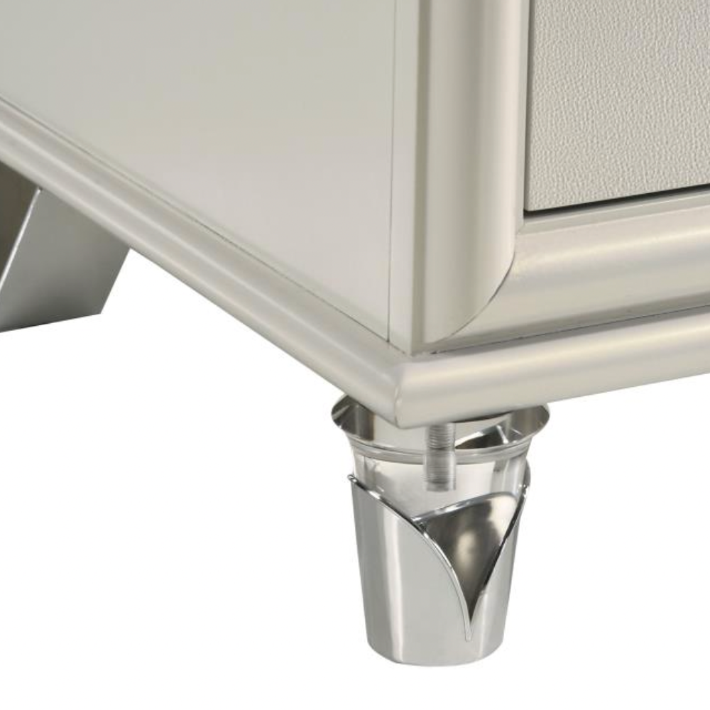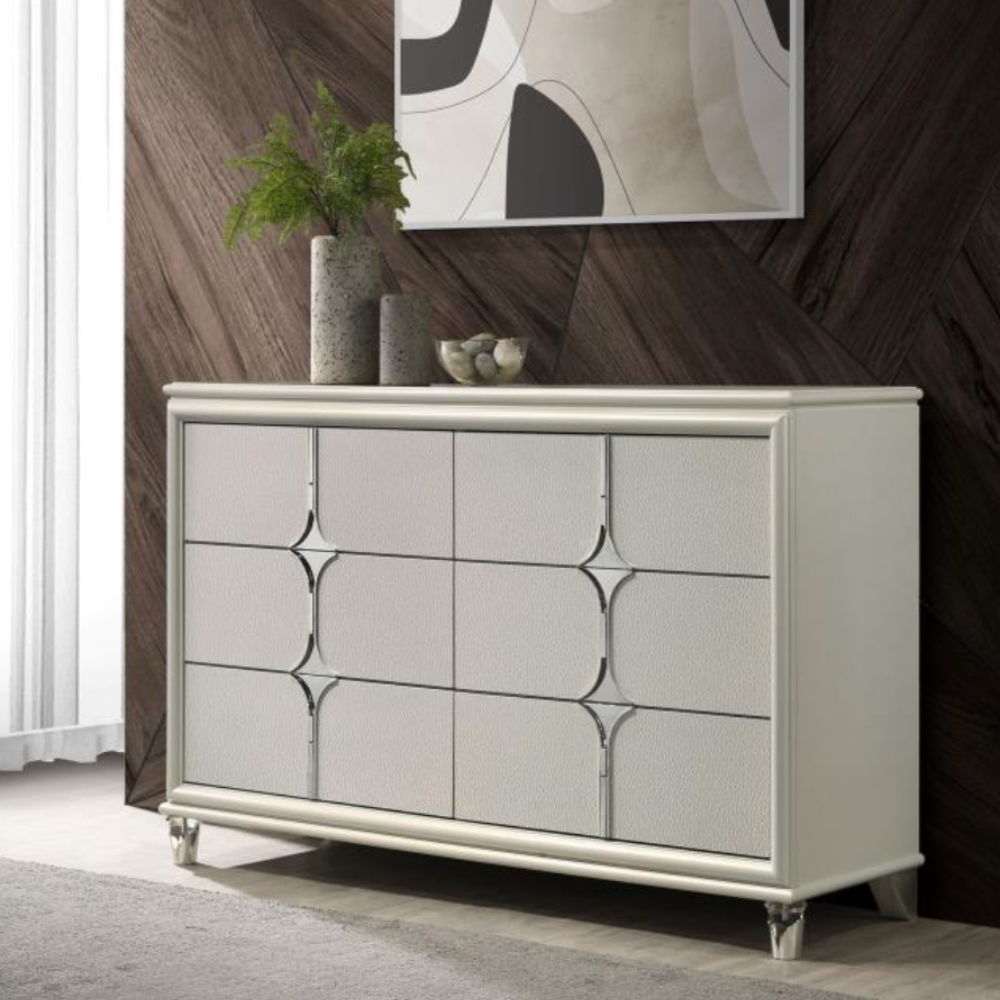 Transform your bedroom with this stunning 6-drawer dresser, a blend of modern design and refined elegance. The pearl white finish and mirror framing beautifully complement the unique diamond star drawer fronts, creating a sophisticated focal point. With a removable jewelry tray hidden in a secret drawer and polished chrome accents, this dresser offers both style and functionality for your space.