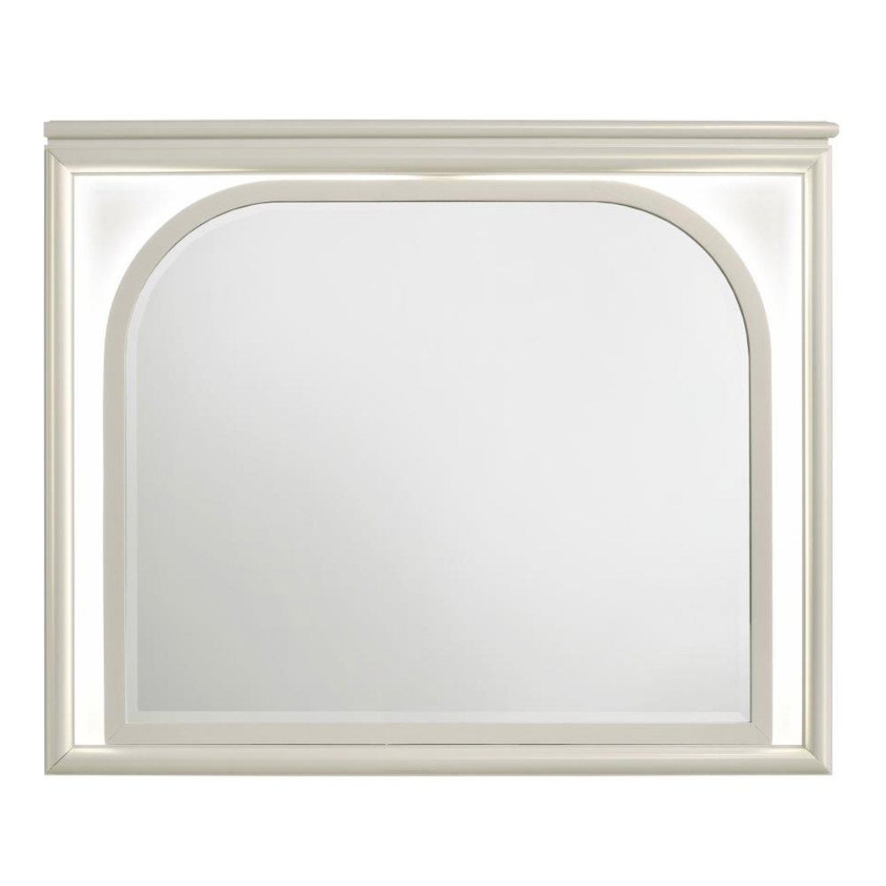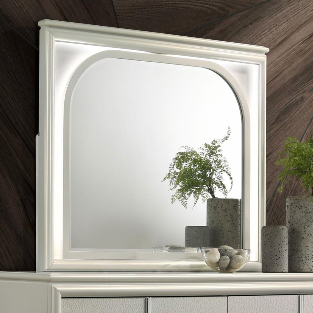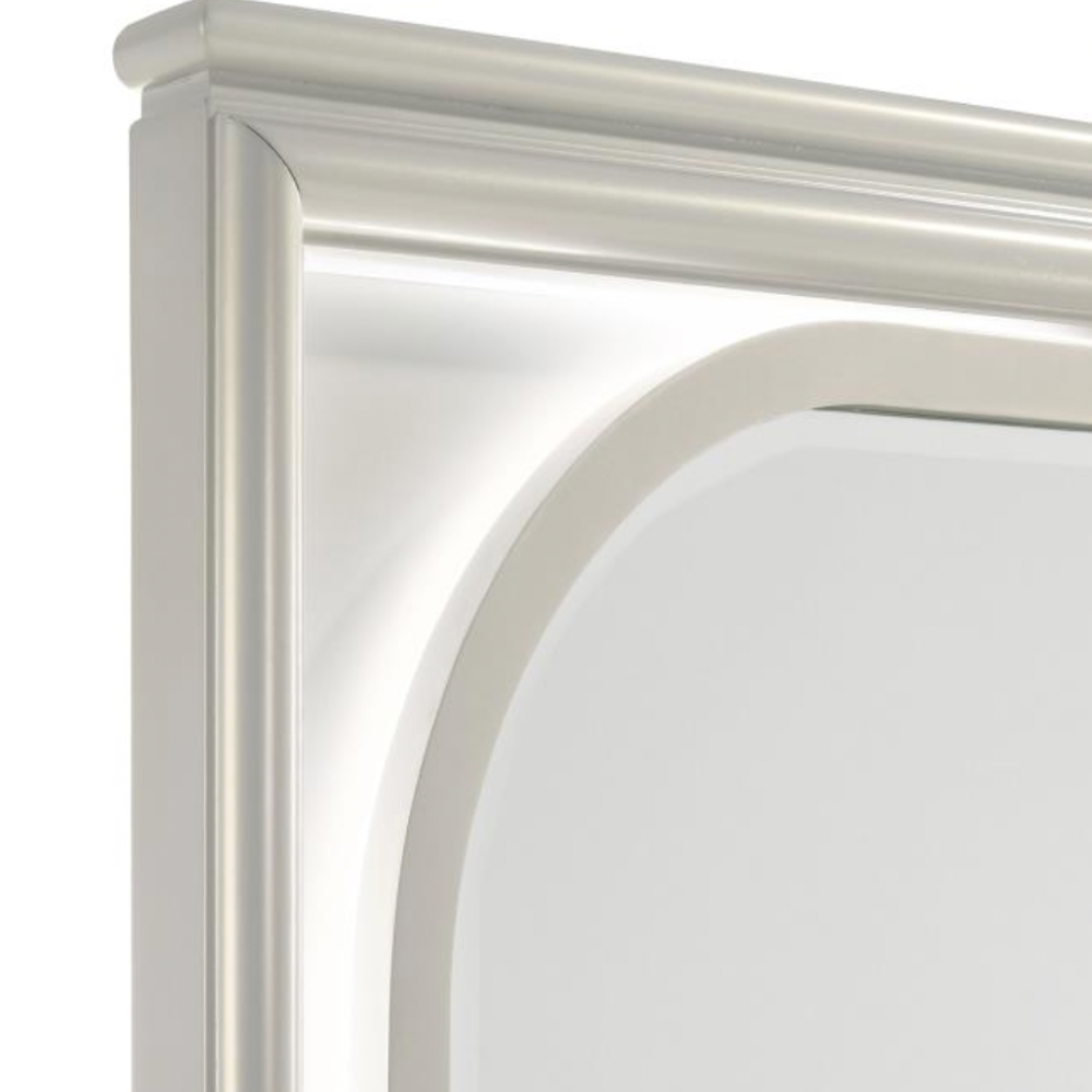 Elevate your bedroom with this modern dresser mirror, designed to blend elegance and functionality. The shaped beveled glass is framed in a sleek pearl white finish, accented with polished chrome for a sophisticated touch. Touch LED lighting enhances your space with a soft, ambient glow, making this mirror both stylish and practical.