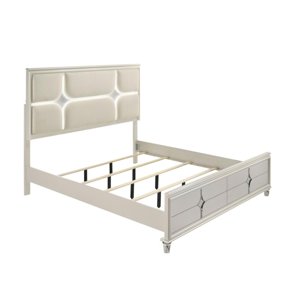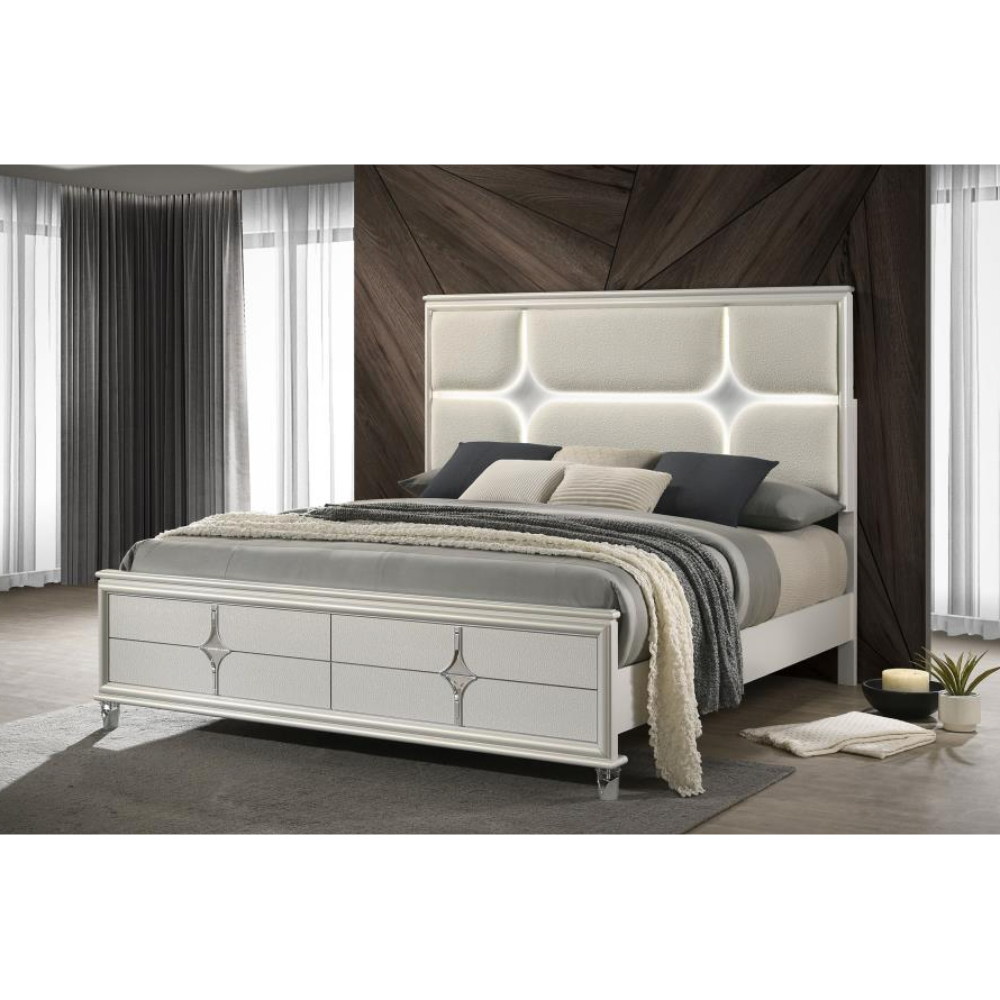 Transform your bedroom into a modern sanctuary with this luxurious bed, designed to captivate and comfort. The ivory boucle upholstered headboard features 3D star-shaped channel lighting, complemented by touch LED lights for a warm, relaxing ambiance. Sleek lines and a diamond star motif on the footboard complete the contemporary sophistication of this exquisite centerpiece.
