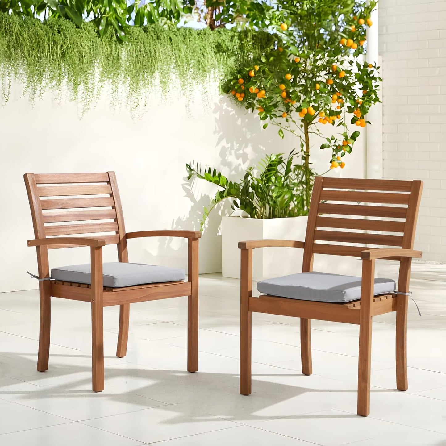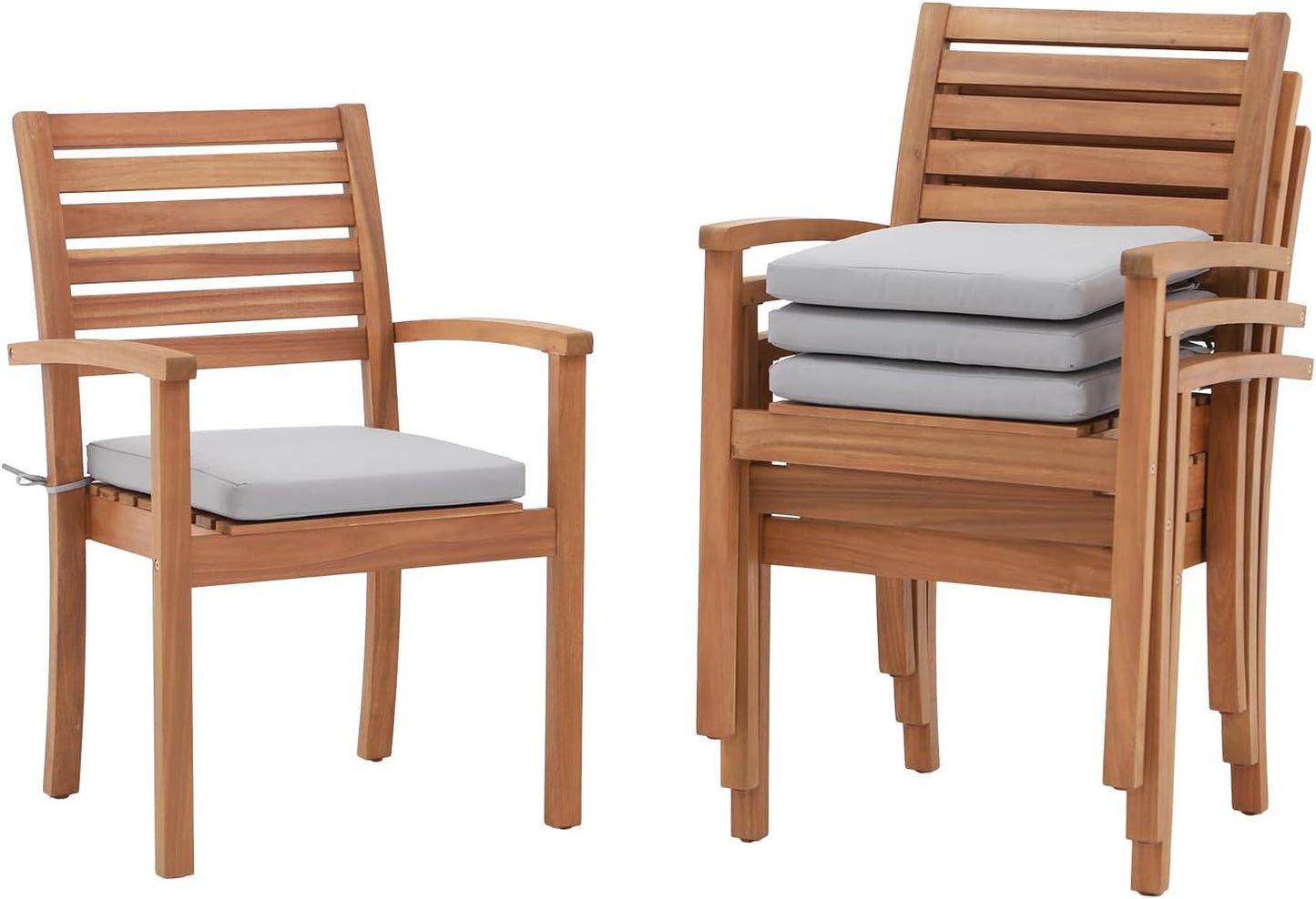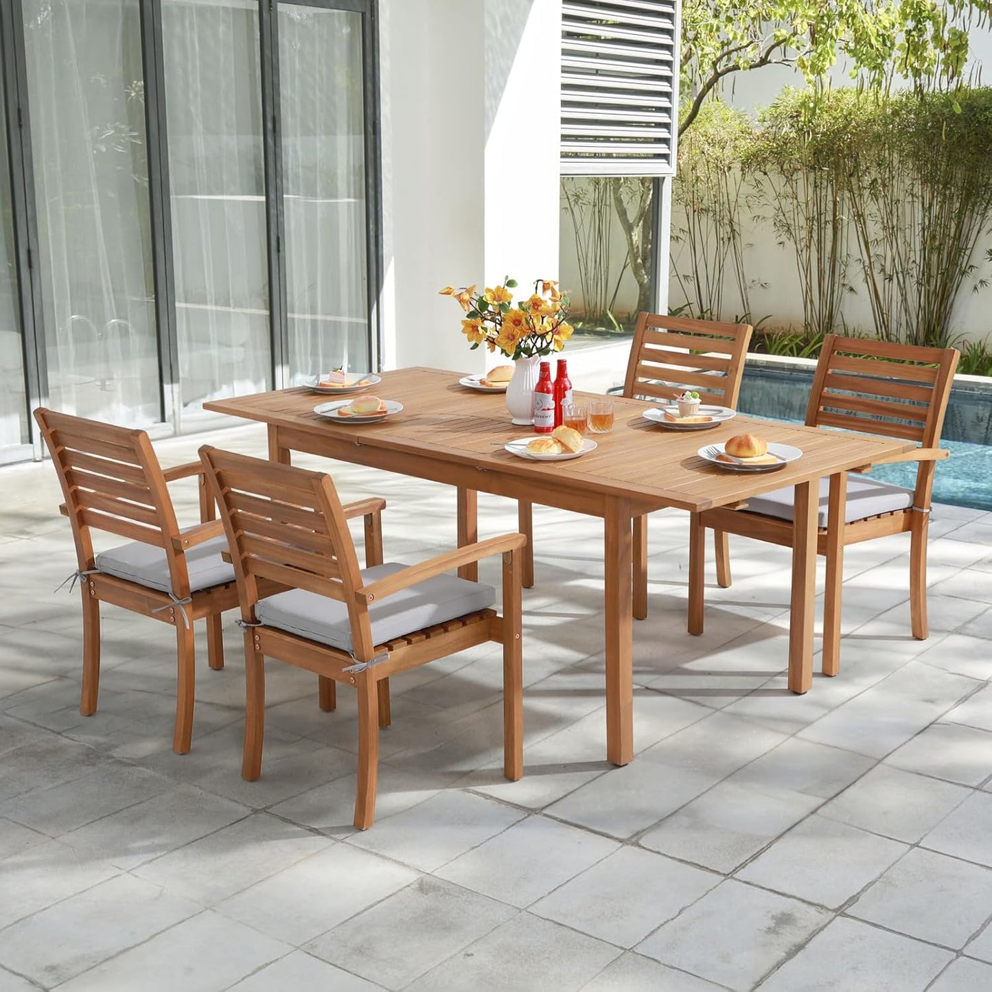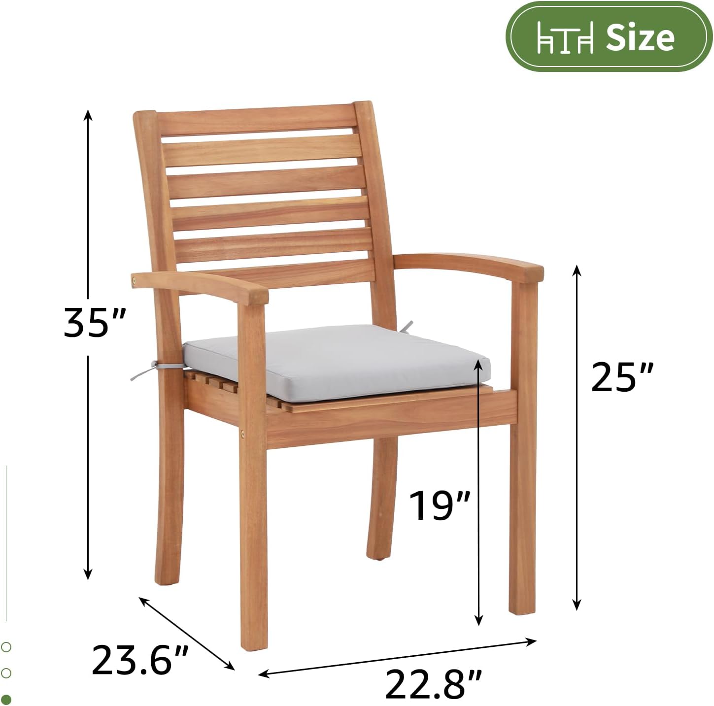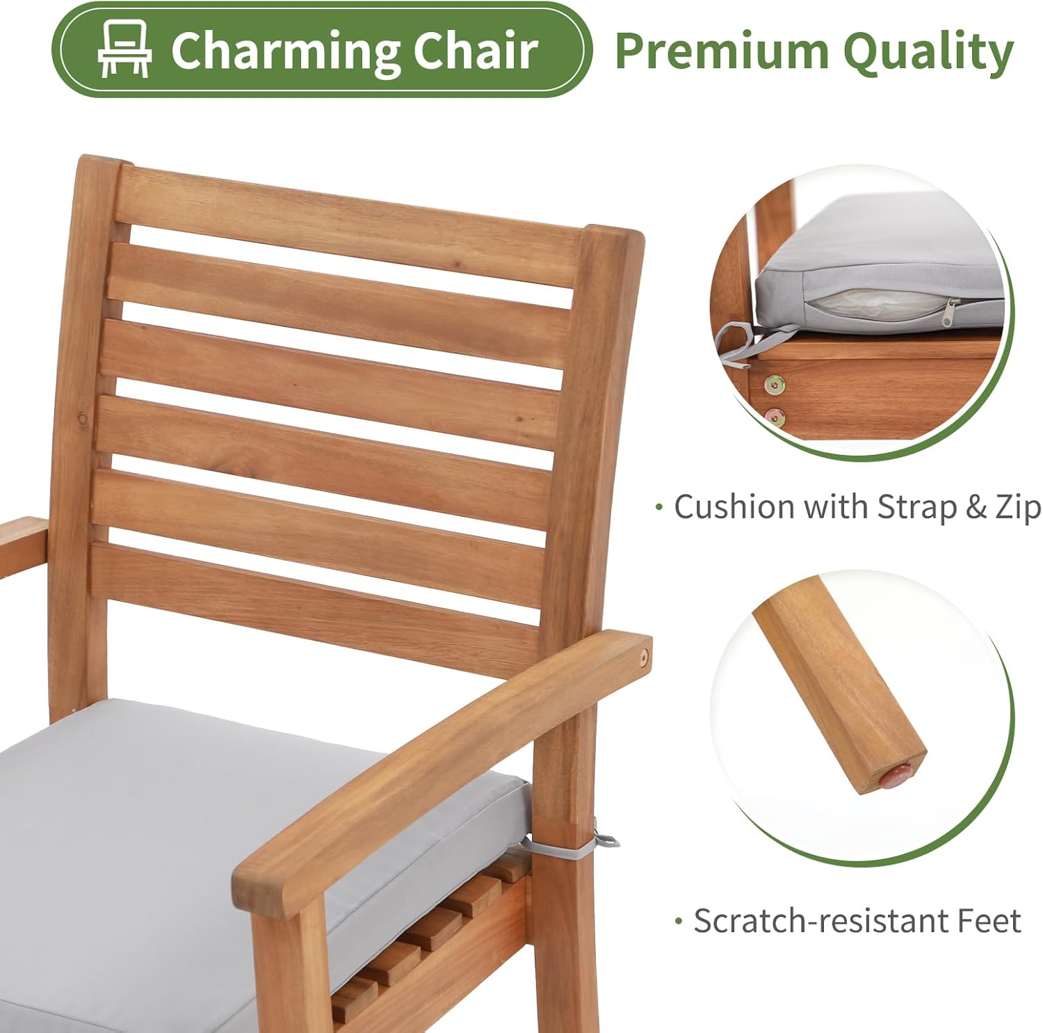 Bring natural elegance to your outdoor dining area with this beautifully crafted acacia wood dining set. Designed for both comfort and durability, the stackable chairs feature a slatted back for ergonomic support and a sturdy structure enhanced by anti-skid foot pads. Weather-resistant and easy to maintain, this set includes removable cushions with washable covers, making it the ideal blend of style and functionality for any patio, porch, or backyard retreat.