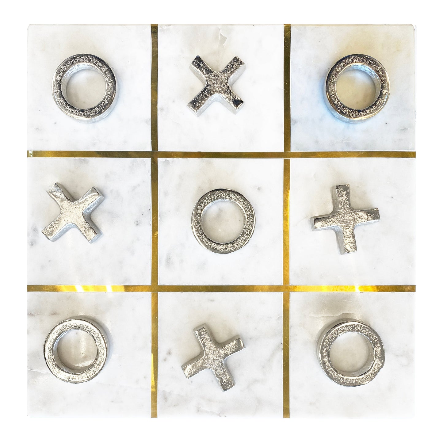 Elevate your game night with our classic Tic-Tac-Toe set, a refined take on a timeless game. Handcrafted from white marble with a brass-inlaid board, this set features aluminum game pieces that add a touch of sophistication. More than just a game, it serves as an elegant art piece, bringing both style and entertainment to your space. Each set is unique due to the natural variations in the marble.