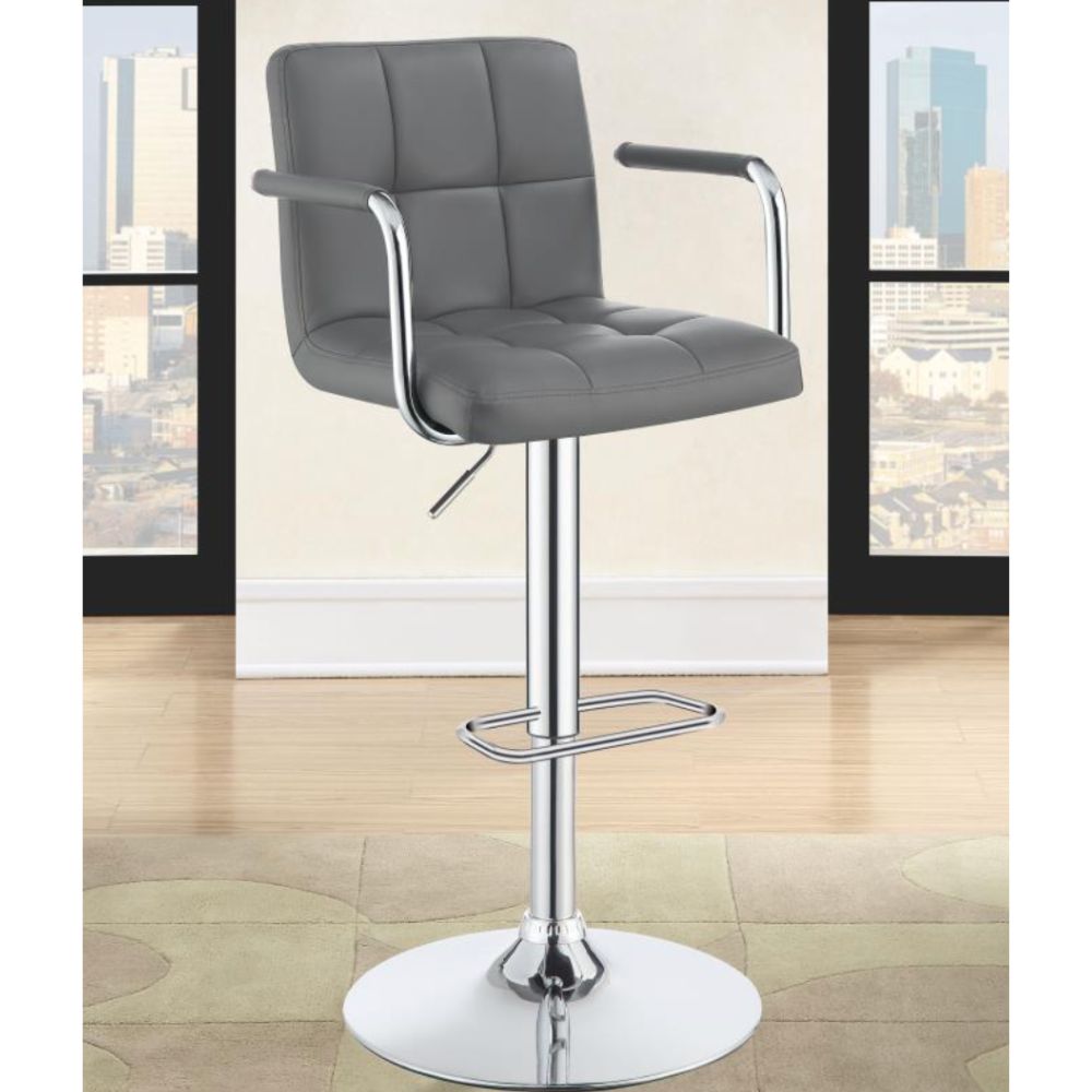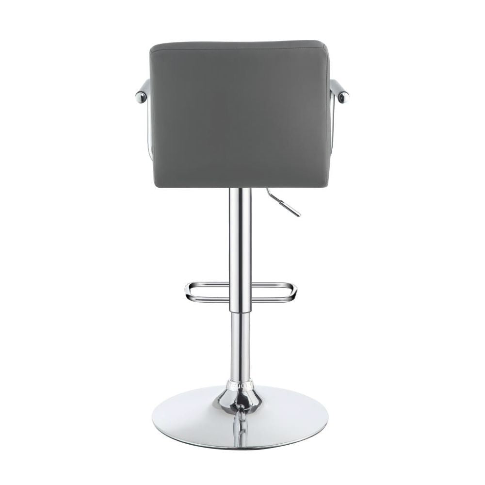 Easy elegance for a casual space. Add a bold enhancement to a transitional bar area. This bar stool captures a mixed motif with a mid-century modern flavor and a fully contemporary appeal. Black leatherette adds a dynamic contrast to a polished chrome finish wide base with a footrest for added comfort. Add hours of comfortable entertaining in a bar space.