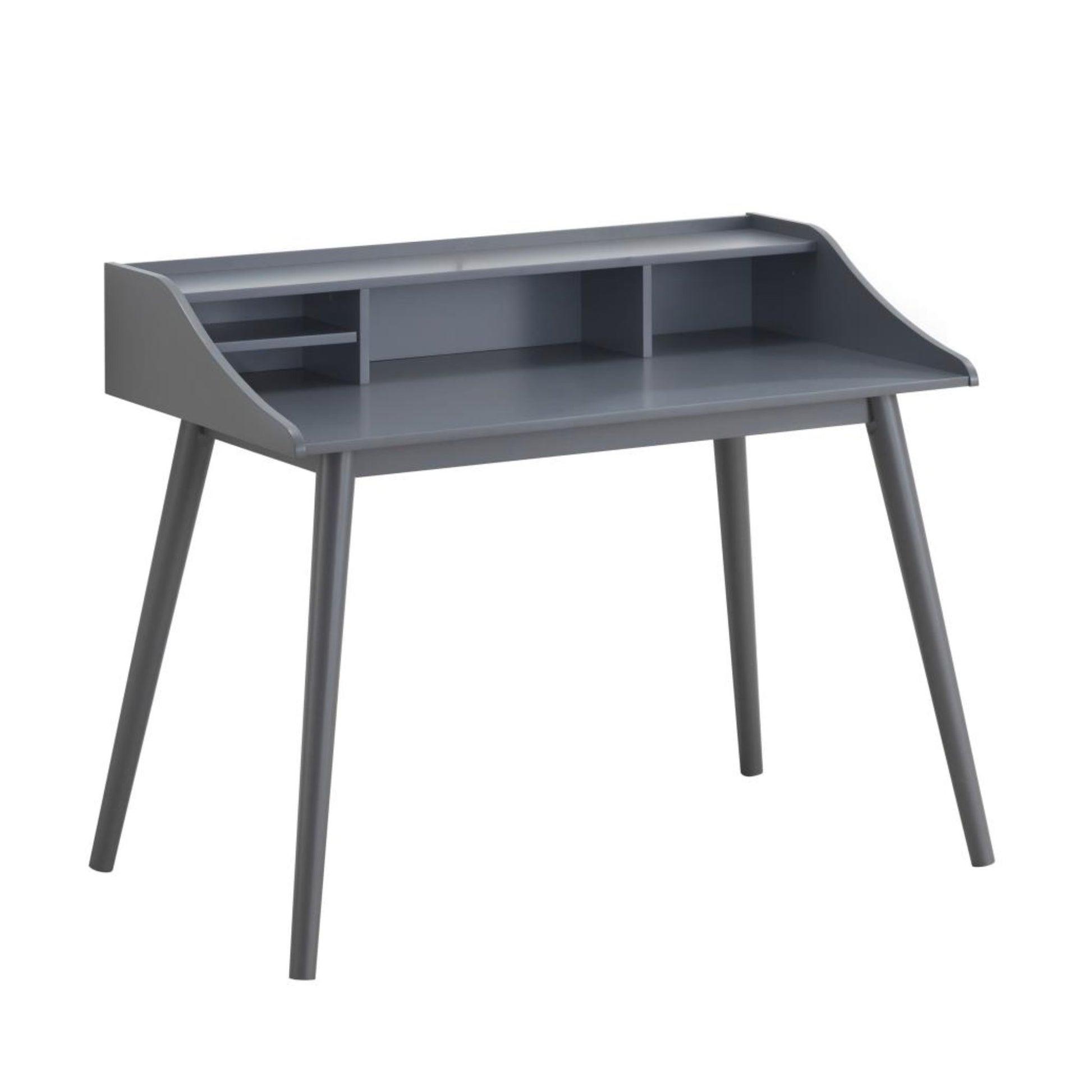 Enhance your mid-century modern design theme with our sleek Wood Writing Desk from the Percy collection. Crafted with slim, tapered legs and gently contoured lines, this desk boasts an iconic silhouette that adds a touch of timeless elegance to any space. The attached organizer hutch offers additional functionality, featuring a wide top shelf with four individual storage bins to keep items neatly organized and within reach. Constructed from durable Asian hardwood, this desk is available in your choice of colors to perfectly complement your decor theme and create a cohesive look.