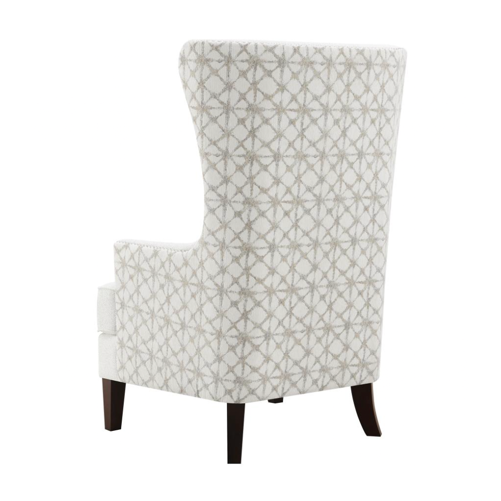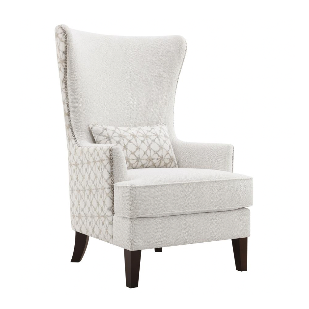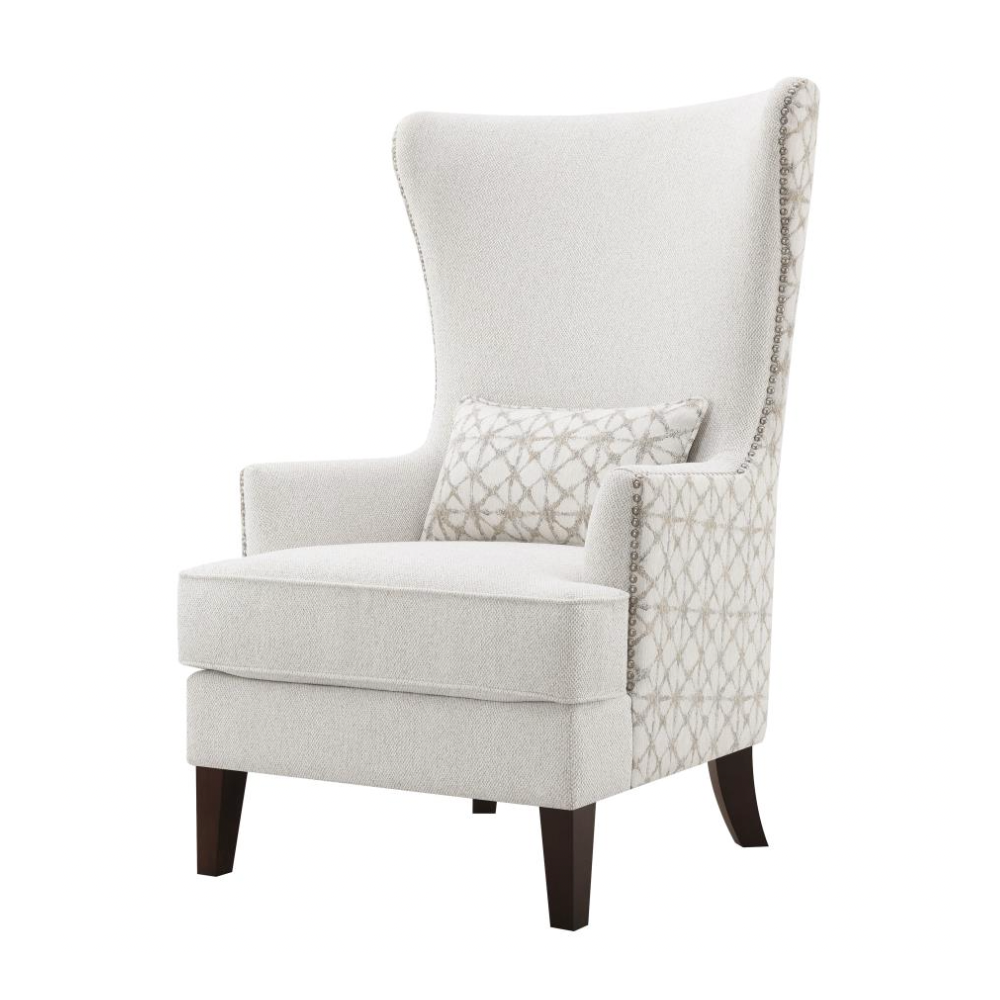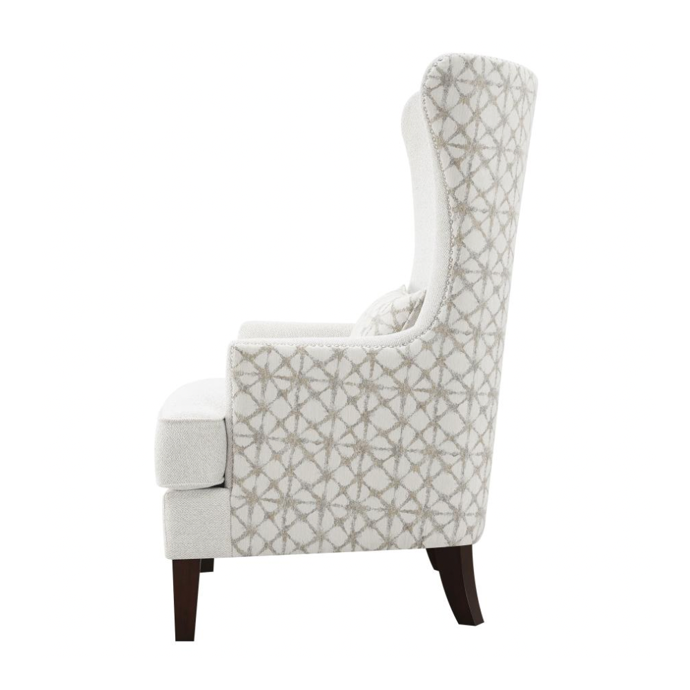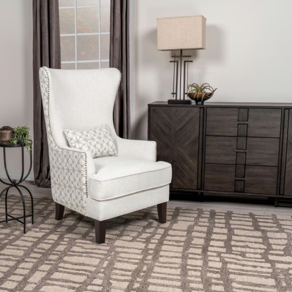 Transform your semi-formal living area into a stylish retreat with this elegant accent chair. Designed with an ultra-high wing back and gentle contouring, it offers supreme comfort and a sophisticated aesthetic. Gray bouclé fabric upholstery features subtle geometric patterning, while silver nailhead trim adds a touch of glam. A removable T-cushion with plush polyester filling and a welt-trim kidney-shaped pillow provide extra support and comfort. Curvy wood legs in a deep brown finish complete the design with timeless charm.