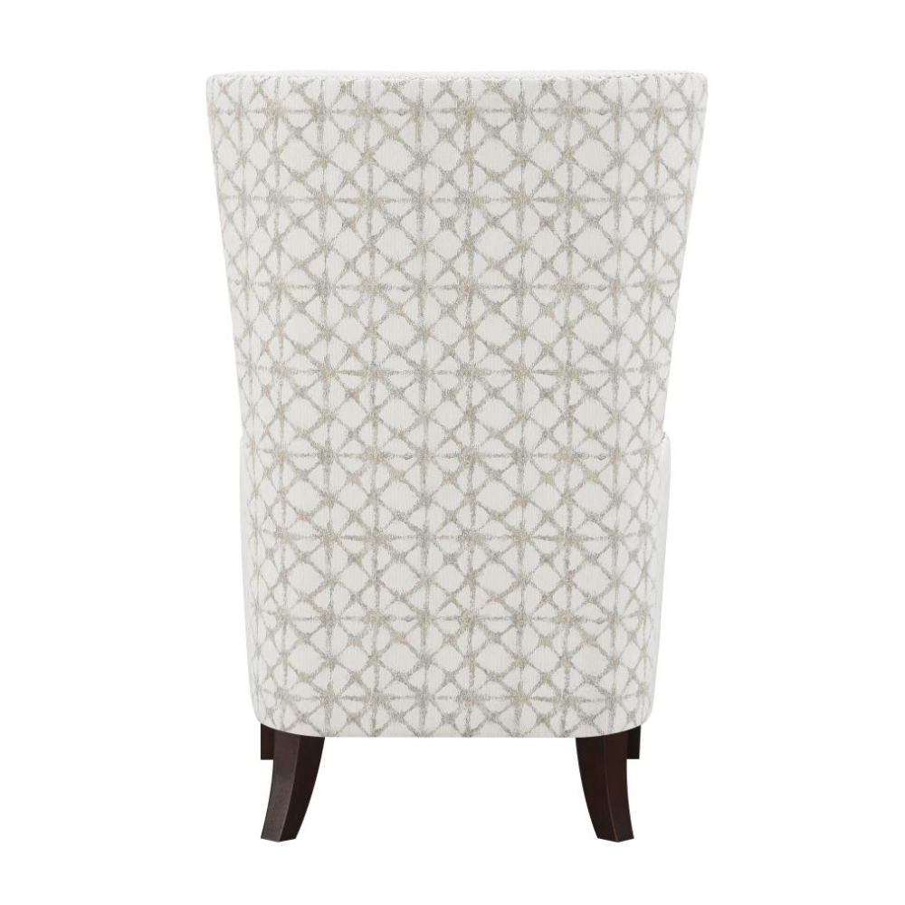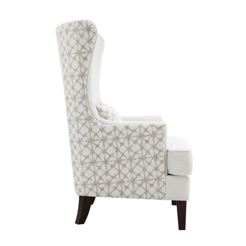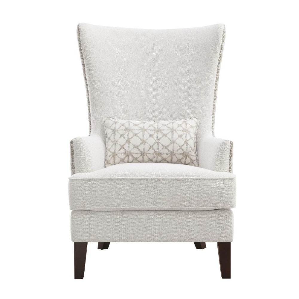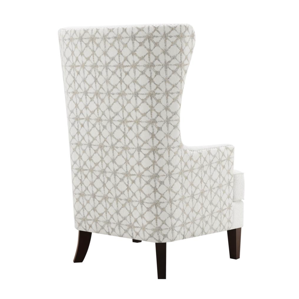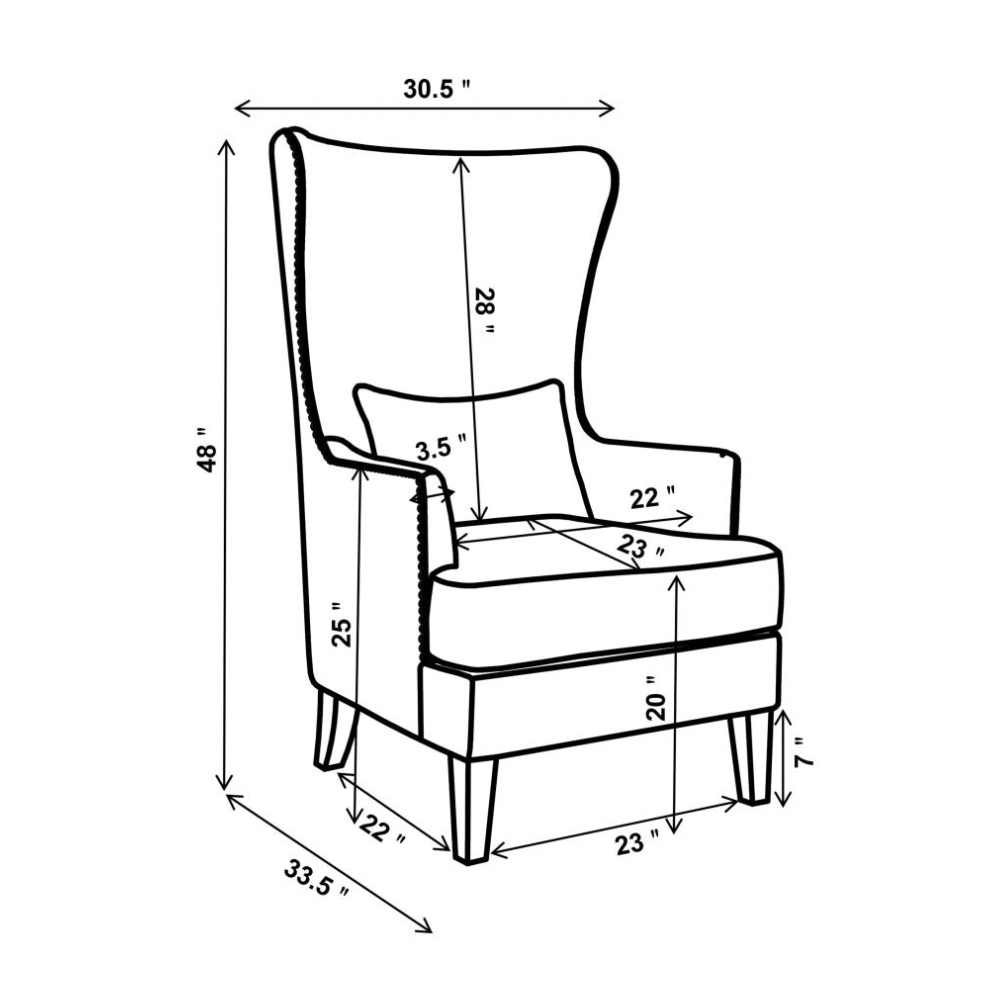 Transform your semi-formal living area into a stylish retreat with this elegant accent chair. Designed with an ultra-high wing back and gentle contouring, it offers supreme comfort and a sophisticated aesthetic. Gray bouclé fabric upholstery features subtle geometric patterning, while silver nailhead trim adds a touch of glam. A removable T-cushion with plush polyester filling and a welt-trim kidney-shaped pillow provide extra support and comfort. Curvy wood legs in a deep brown finish complete the design with timeless charm.