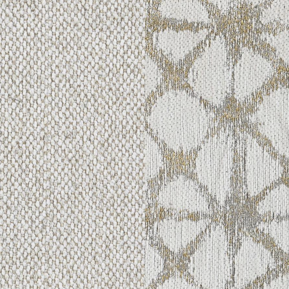 - Chic Upholstery: Gray bouclé fabric with geometric patterning and silver nailhead trim.