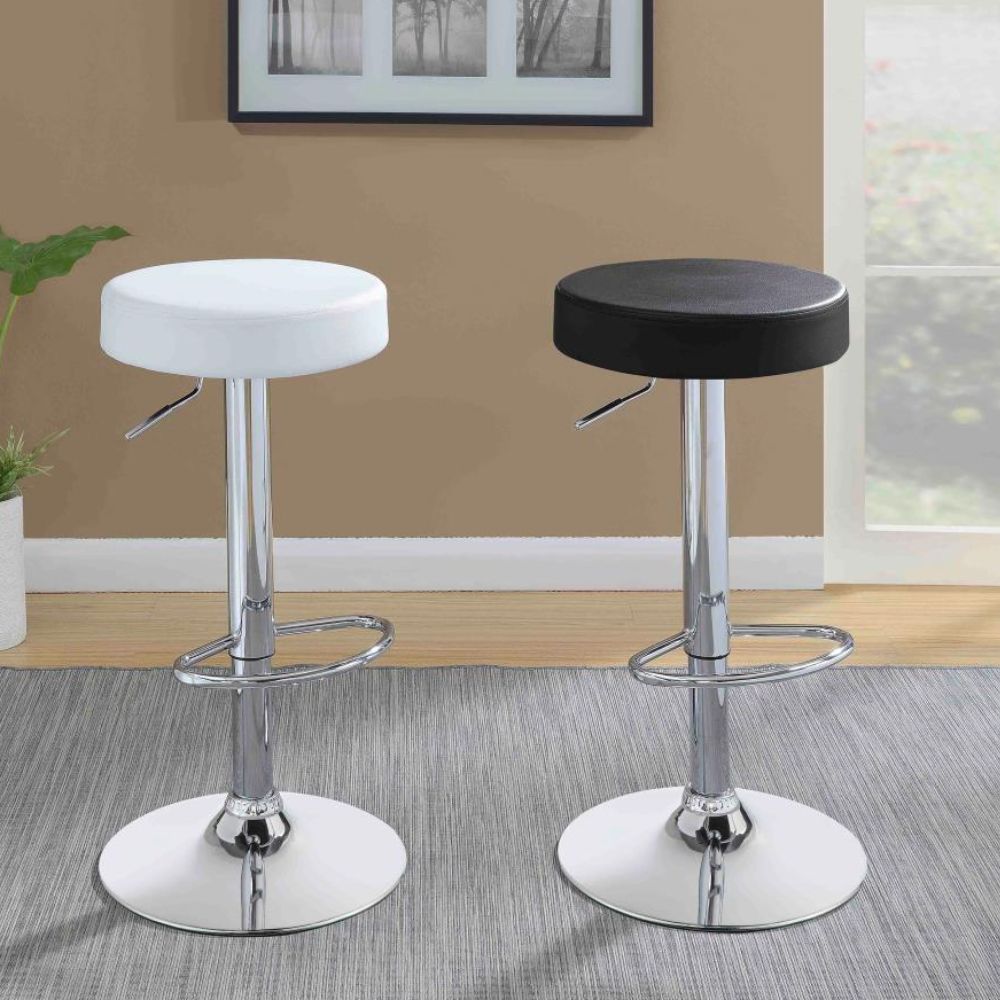 A fun personality with whimsical charm. Lighten the attitude in any space with this pole bar stool. Modern settings create the perfect venue for this beautiful stool that combines a round seat with a chrome finish pole and base. An open ring footrest and adjustable height options allow positioning to fit your table or counter. Sleek white upholstery steals the show.