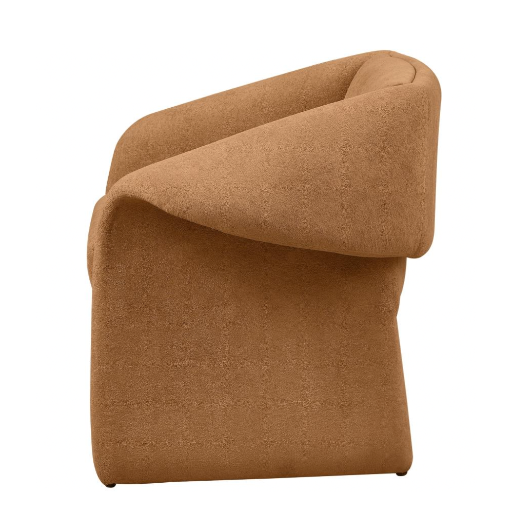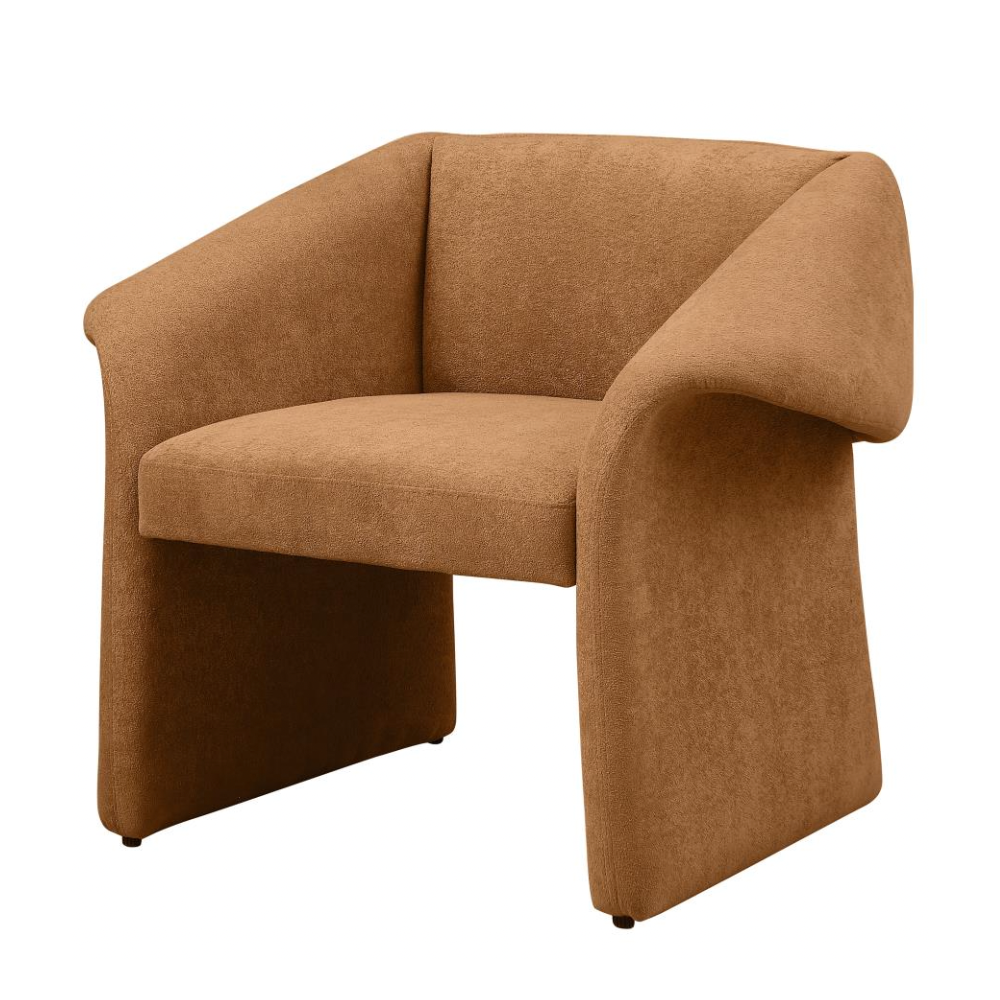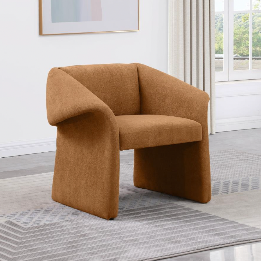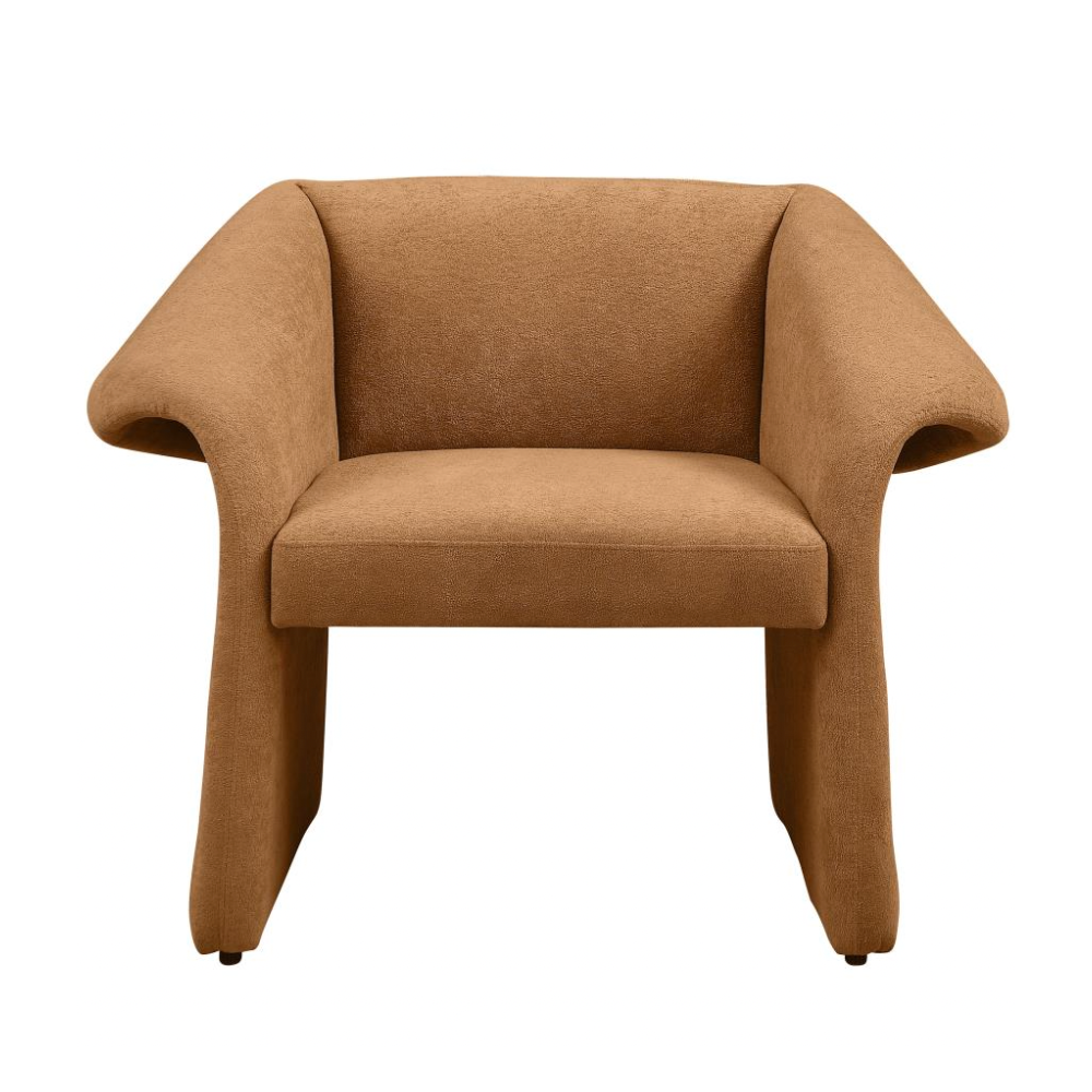 Elevate your living space with the artistic elegance of this modern accent armchair. Its standout silhouette showcases gracefully curled arms that blend classic refinement with contemporary design. Upholstered in soft, suede-like fabric, it offers a rich texture and neutral hue to complement any decor. The gently sloping armrests and foam-padded seat provide both comfort and style, making it a perfect addition to a cozy reading nook or seating group. Designed with practicality in mind, its sturdy legs include levelers for enhanced stability on any flooring surface.