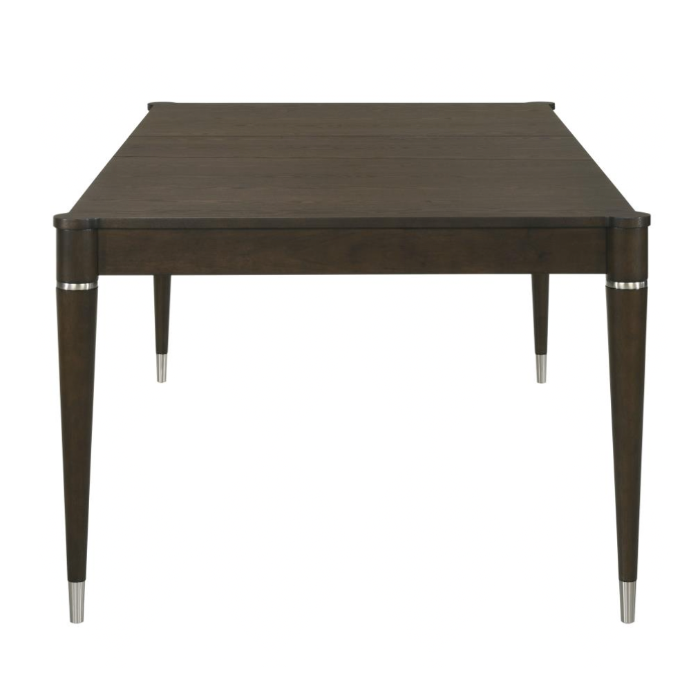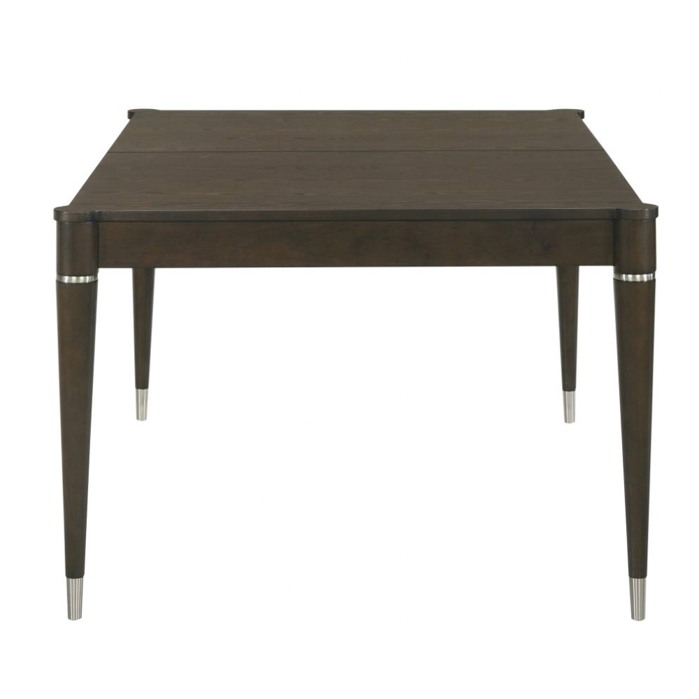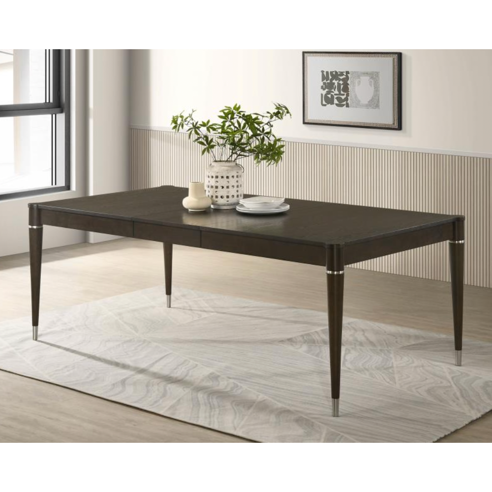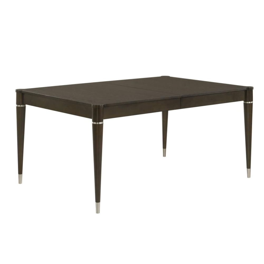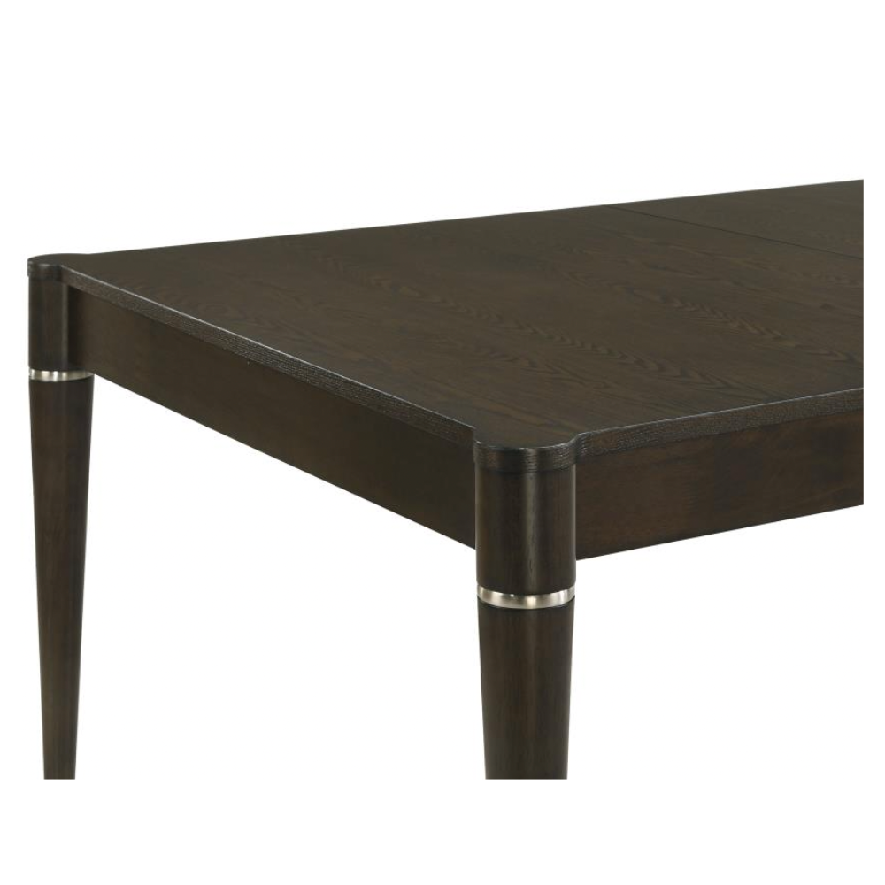 Upgrade your dining space with this contemporary table featuring a warm ash brown finish and elegant wood grain detailing. Designed with MDF, Asian hardwood, and ash veneer, it offers both durability and style, while the removable leaf extends the table from 63 to 81 inches to accommodate extra guests. Sleek tapered legs with metal caps add a modern edge, making it perfect for any dining occasion.