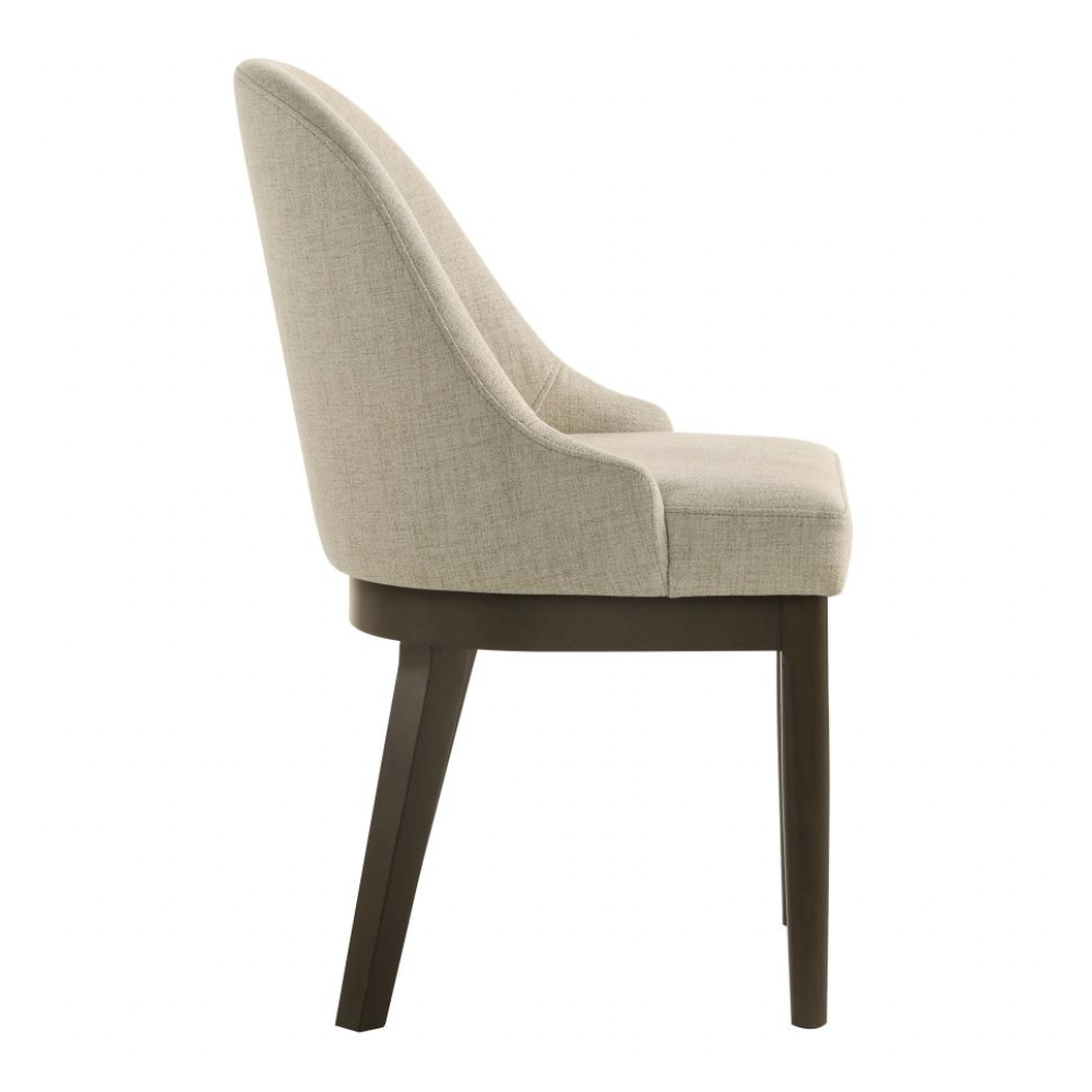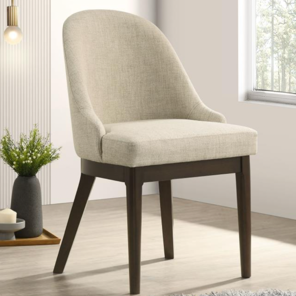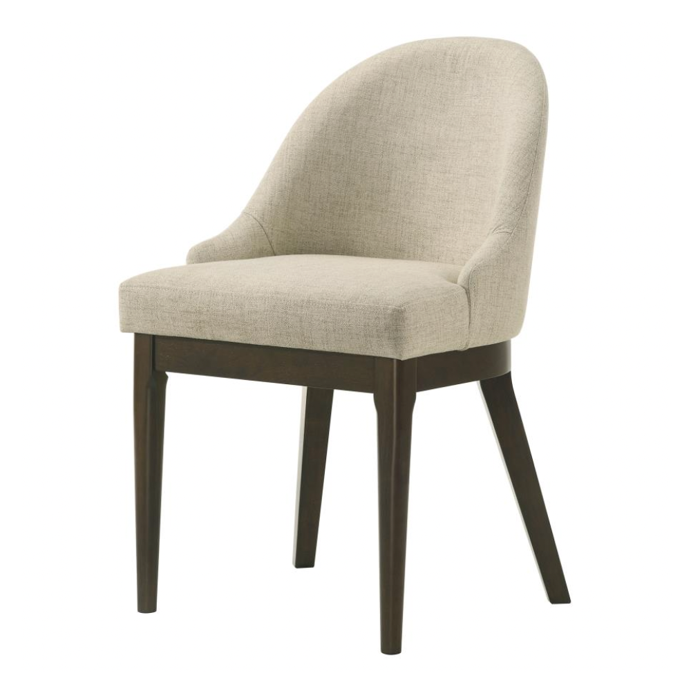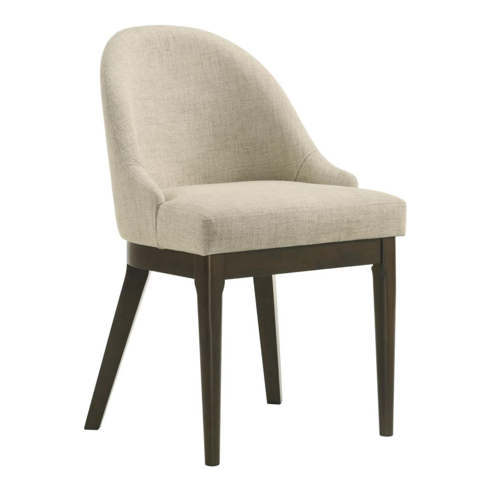 Elevate your dining area with this elegant chair, upholstered in soft beige fabric for a cozy, refined look. A curved backrest and padded seat deliver exceptional comfort, while the sturdy Asian hardwood frame in an ash brown finish ensures lasting durability. Tapered legs complete the modern silhouette, making it perfect for both everyday dining and special occasions.