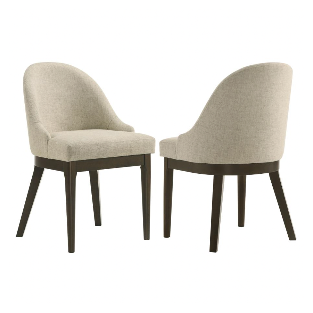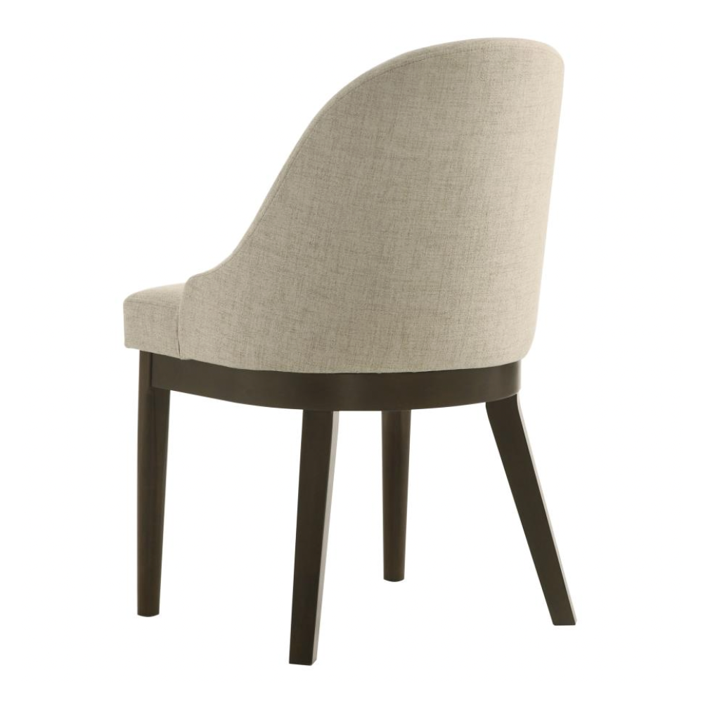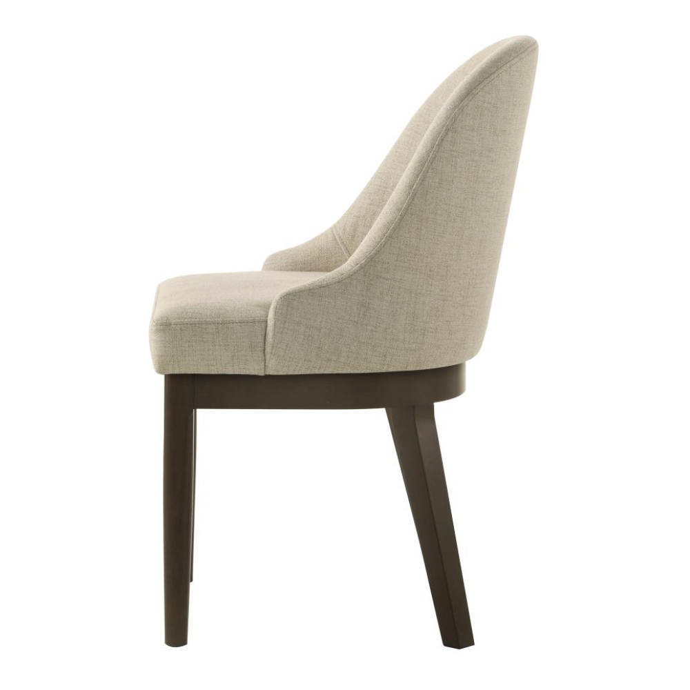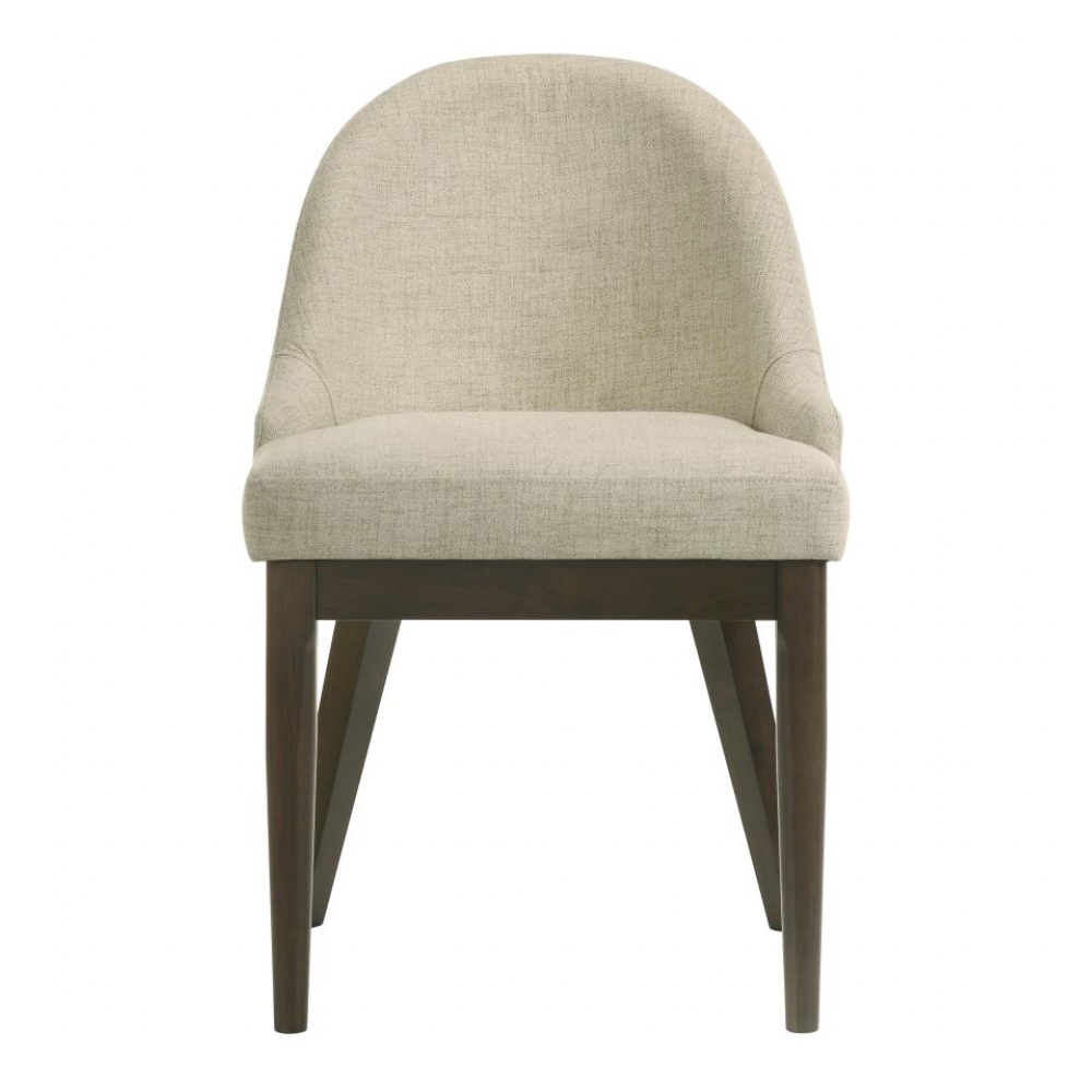Elevate your dining area with this elegant chair, upholstered in soft beige fabric for a cozy, refined look. A curved backrest and padded seat deliver exceptional comfort, while the sturdy Asian hardwood frame in an ash brown finish ensures lasting durability. Tapered legs complete the modern silhouette, making it perfect for both everyday dining and special occasions.