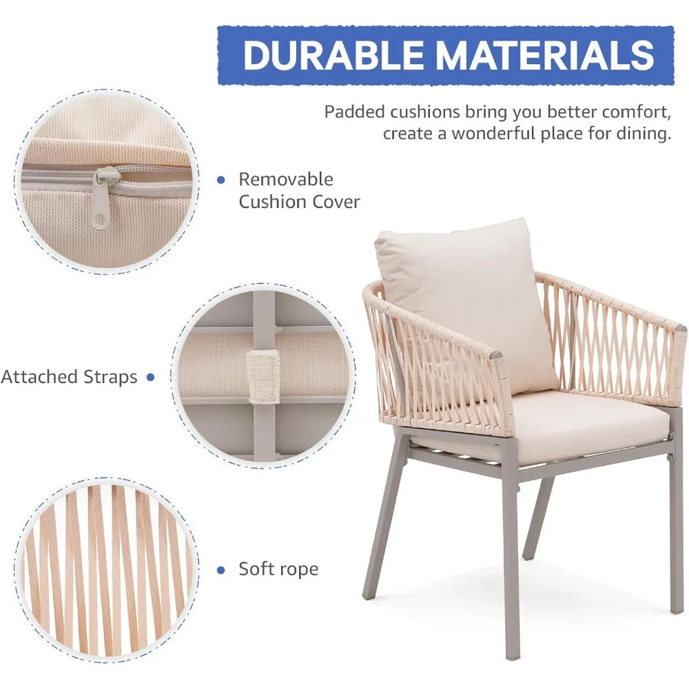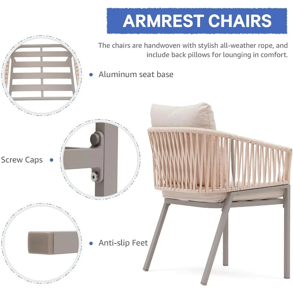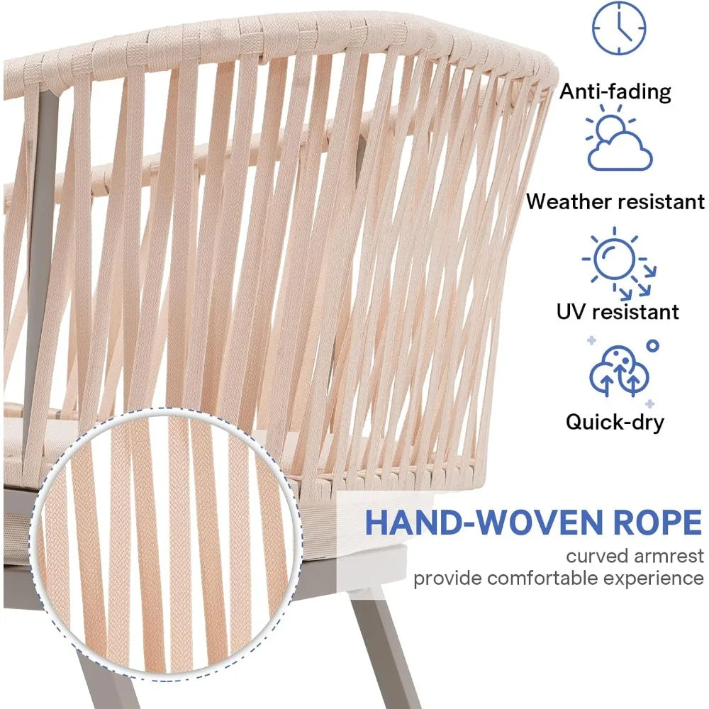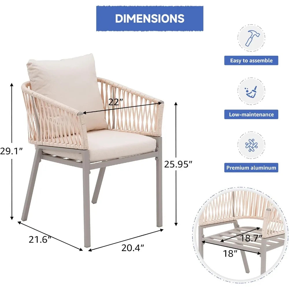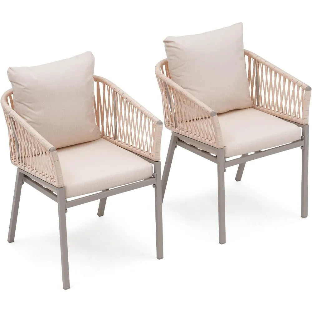 Elevate your outdoor space with this pair of aluminum dining chairs, combining sleek modern style with unmatched comfort. Constructed from rust-resistant aluminum and wrapped in weatherproof braided rope, these chairs bring a light and breezy aesthetic to patios, balconies, or gardens. Thoughtfully designed with ergonomic contours and plush cushions, they invite you to linger outside in comfort and style.