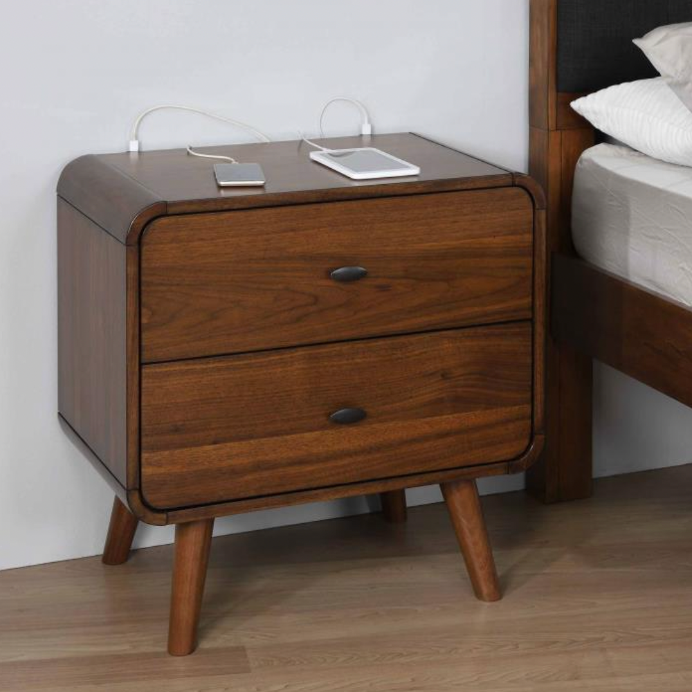 Bring retro sophistication to your bedside with this mid-century modern nightstand, featuring rounded edges, tapered legs, and a sleek silhouette. Crafted from pine, engineered wood, and walnut veneer, it offers lasting durability and a rich dark walnut finish. Two spacious drawers, including a felt-lined top drawer, provide ample storage, while built-in USB ports keep your devices charged.
