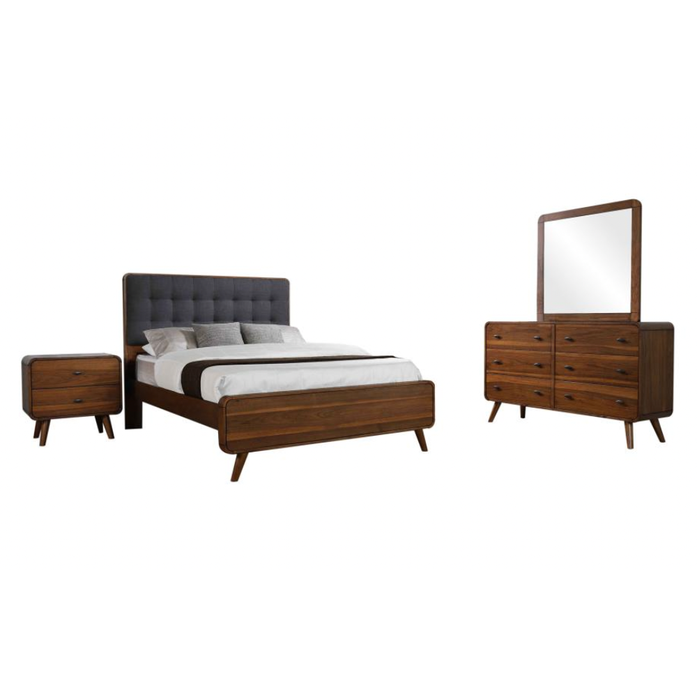 Elevate your bedroom with this mid-century modern set, featuring a bed, nightstand, dresser, mirror, and optional chest. Crafted from pine, engineered wood, and walnut veneer, it blends retro charm with modern convenience, including felt-lined drawers and built-in USB ports.