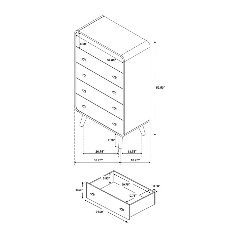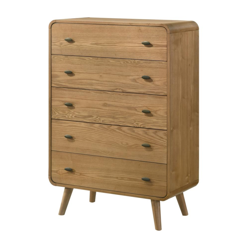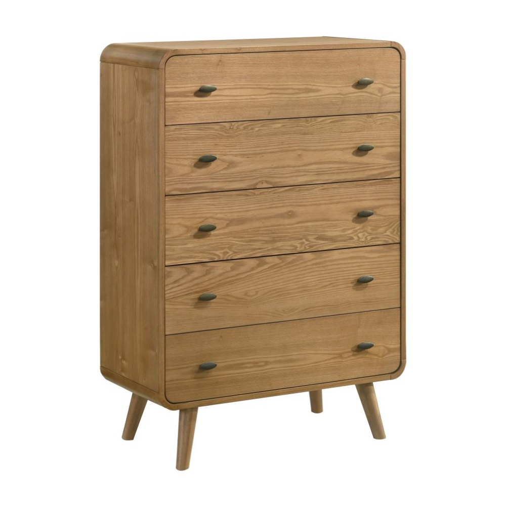 Stylishly store your essentials with this mid-century modern five-drawer chest, featuring a light ash finish and retro-inspired design. Crafted from pine, engineered wood, and walnut veneer, it includes a felt-lined top drawer for delicate items. Tapered legs, rounded edges, and subtle metallic hardware complete its timeless appeal.
