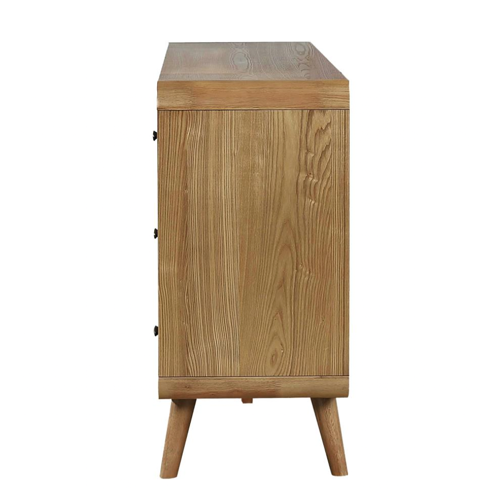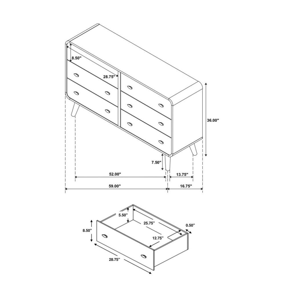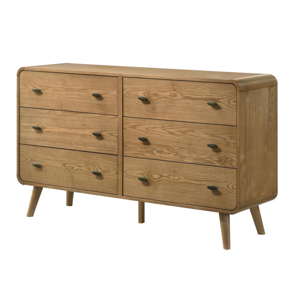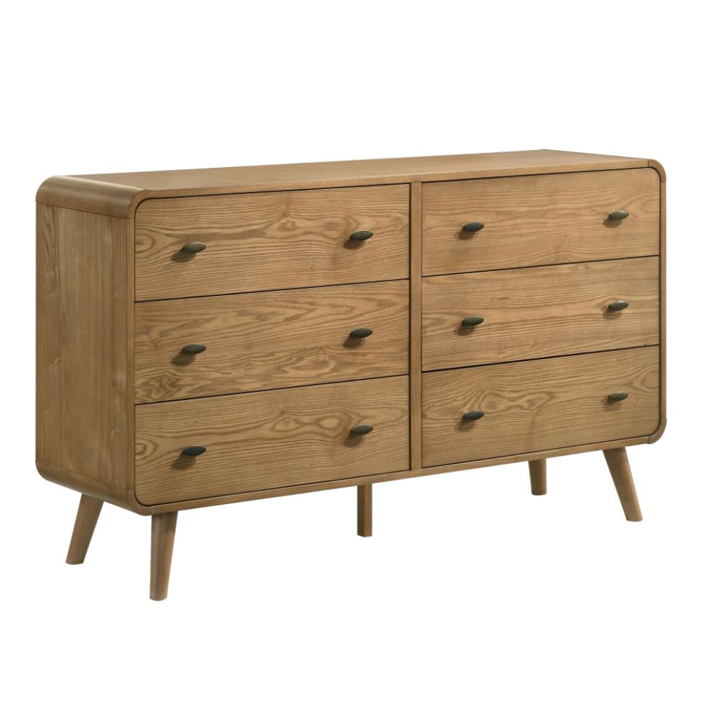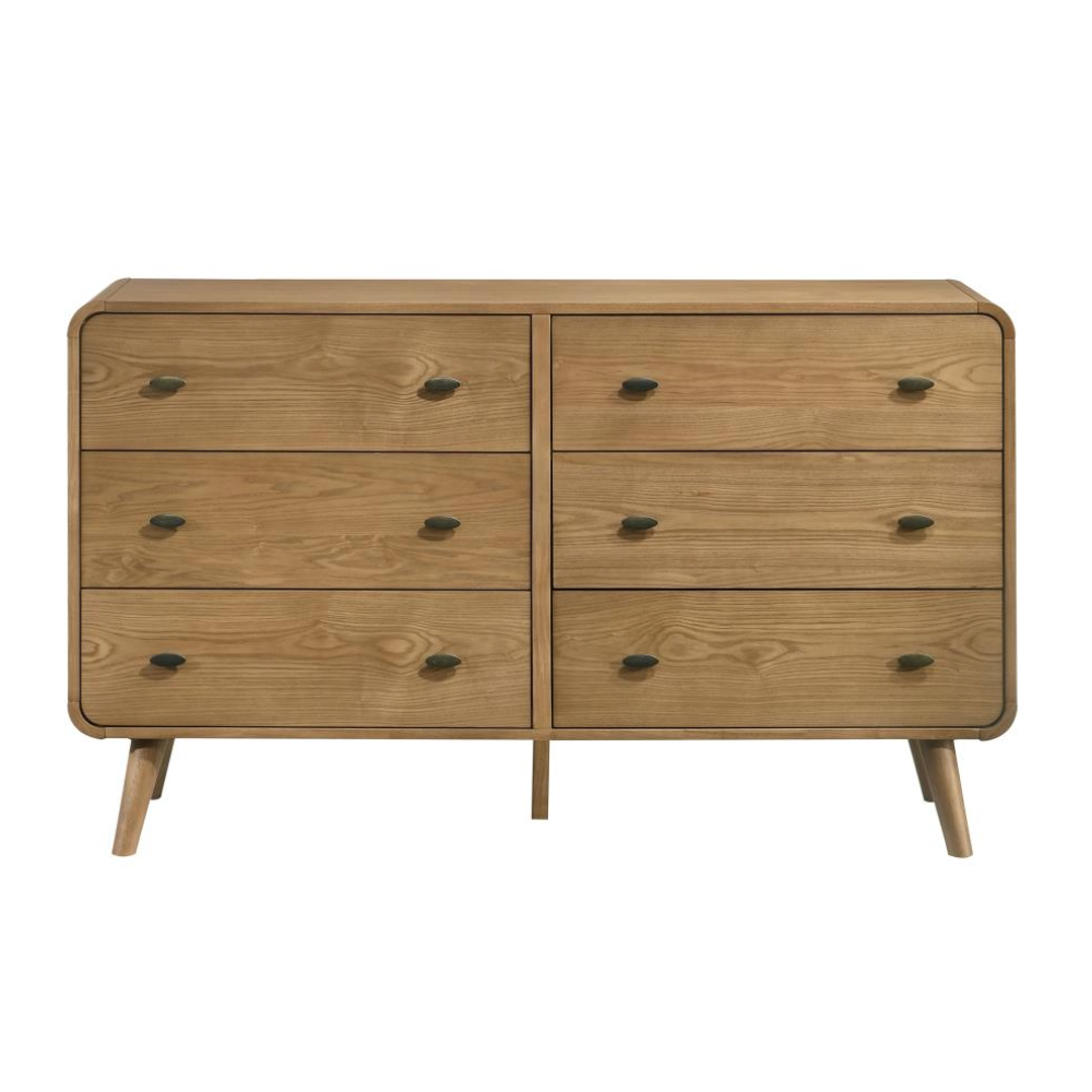 Organize in style with this mid-century modern dresser, featuring a clean light ash finish and retro-inspired details. Crafted from pine, engineered wood, and walnut veneer, it includes six drawers with felt-lined top compartments for delicate storage. Rounded edges and tapered legs complete its timeless look.