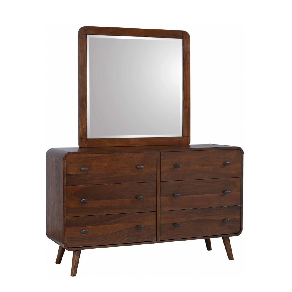 This mid-century modern dresser and mirror set combines style and functionality with a sleek design featuring six spacious drawers, including felt-lined top drawers. Crafted from pine, engineered wood, and walnut veneer, it showcases rounded edges, tapered legs, and a coordinating mirror with a rich walnut veneer frame.