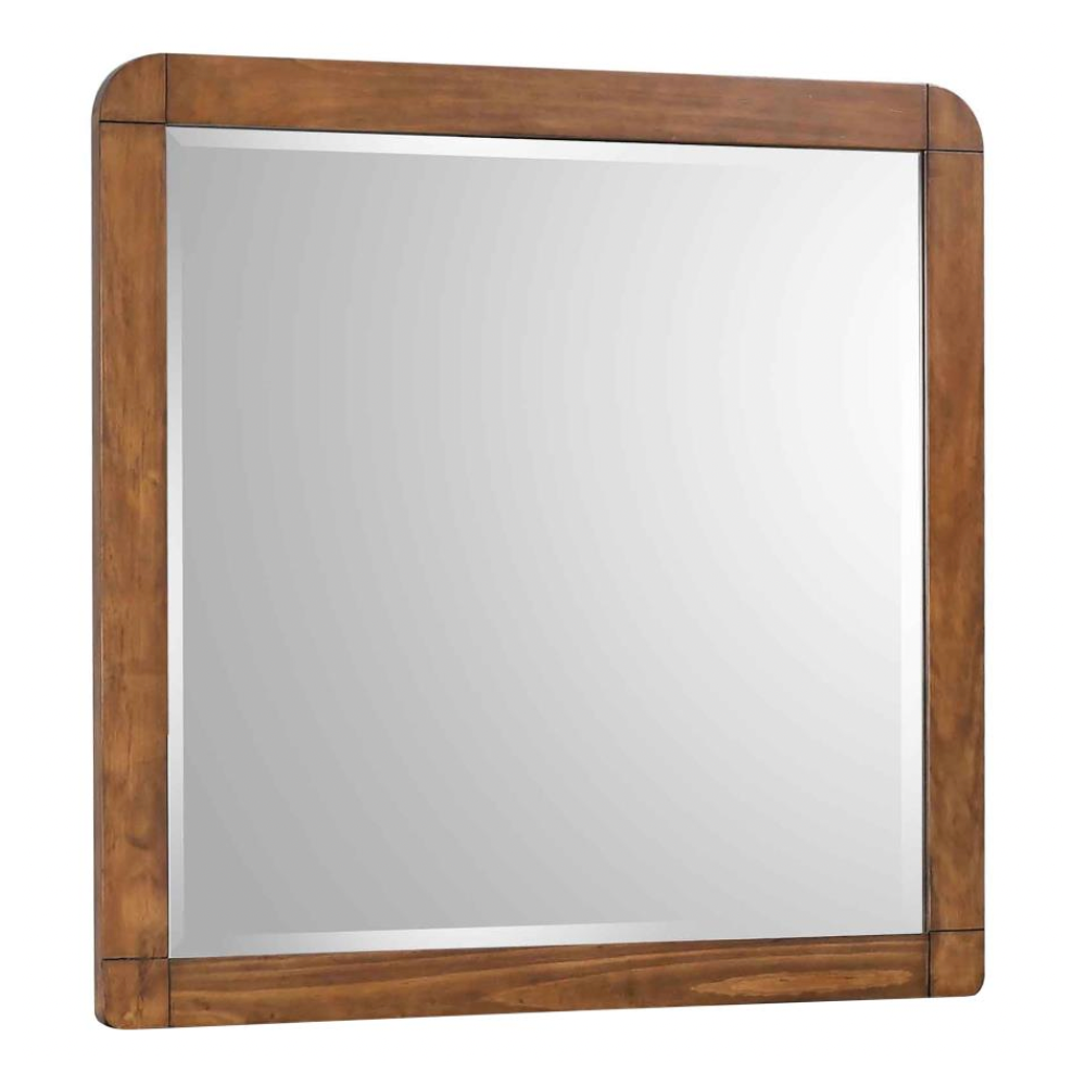 Capture mid-century modern elegance with this retro square mirror. Featuring a rich dark walnut finish and a rounded silhouette, this mirror adds warmth and visual intrigue to any space. The square mirrored glass center, complete with embossing, complements the exposed wood grain, offering a touch of rustic charm. Perfect for a hallway or bedroom, this mirror enhances both contemporary and mid-century modern decor.
