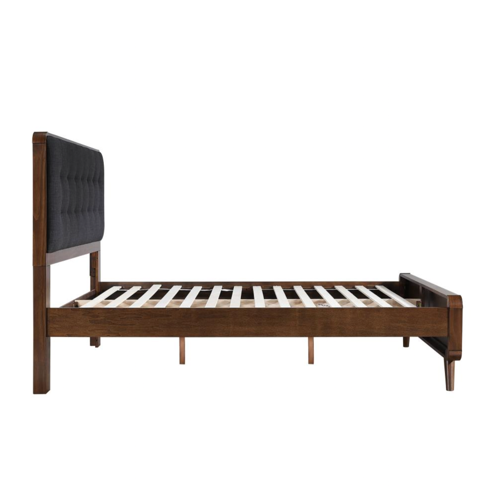 Add a touch of countryside charm to your bedroom with this mid-century modern bed, crafted from pine, engineered wood, and walnut veneer for lasting durability. The dark walnut finish pairs beautifully with the upholstered headboard, featuring thick padding and square tufting for an elegant, comfortable feel. Rounded corners, tapered legs, and a sleek, low-profile footboard complete the refined silhouette, creating a serene and stylish retreat.