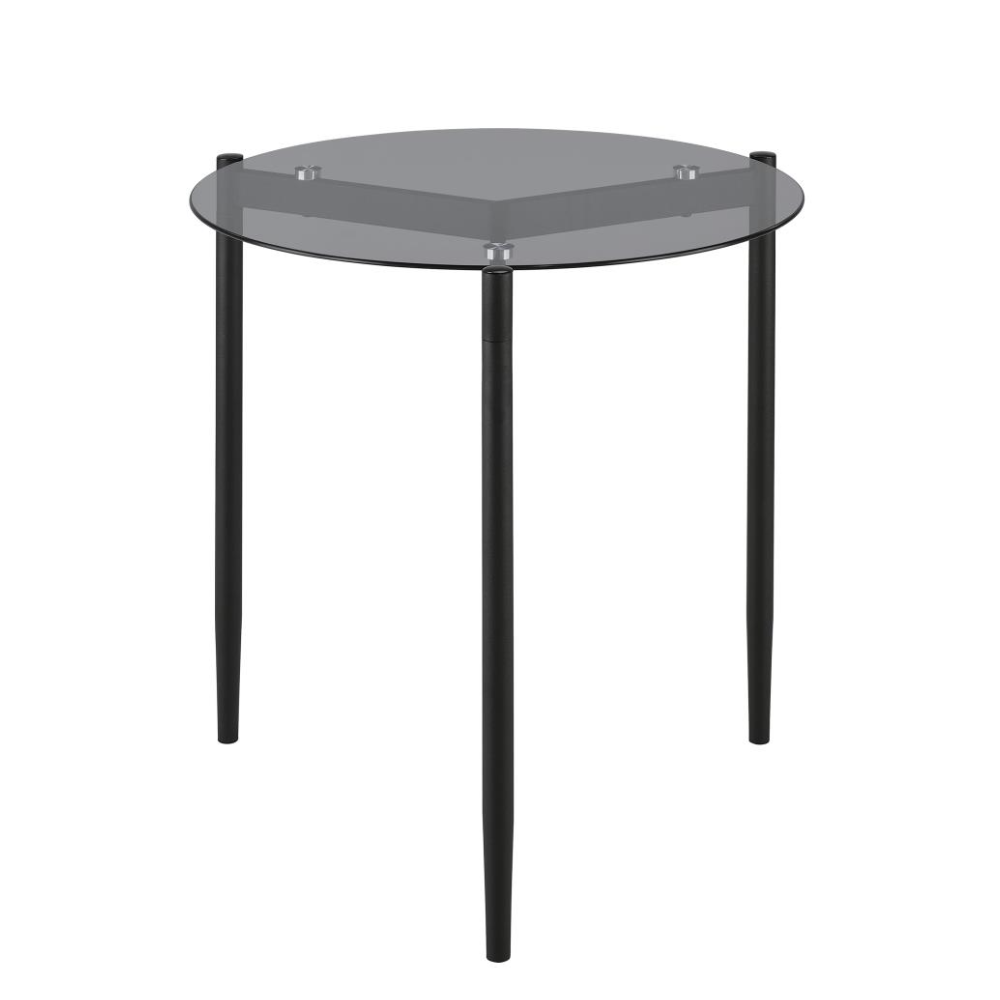 Create a stunning display for your favorite table lamp or a vase of fresh-cut flowers with this modern end table. Crafted from metal and glass, it showcases a minimalist design with a trio of tapering metal legs in a crisp sandy black finish. The Y-shaped support structure elegantly holds a round, smoked tempered glass top, making it a perfect addition to any refined living space. This versatile piece can double as a display pedestal or bedside table, adding both style and functionality to your home.